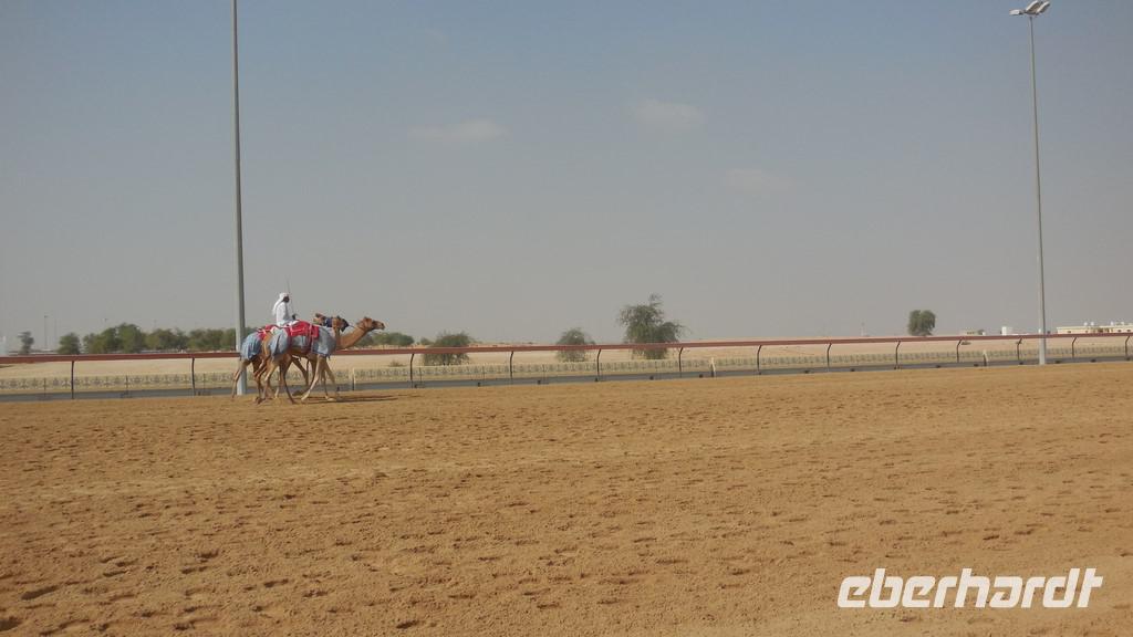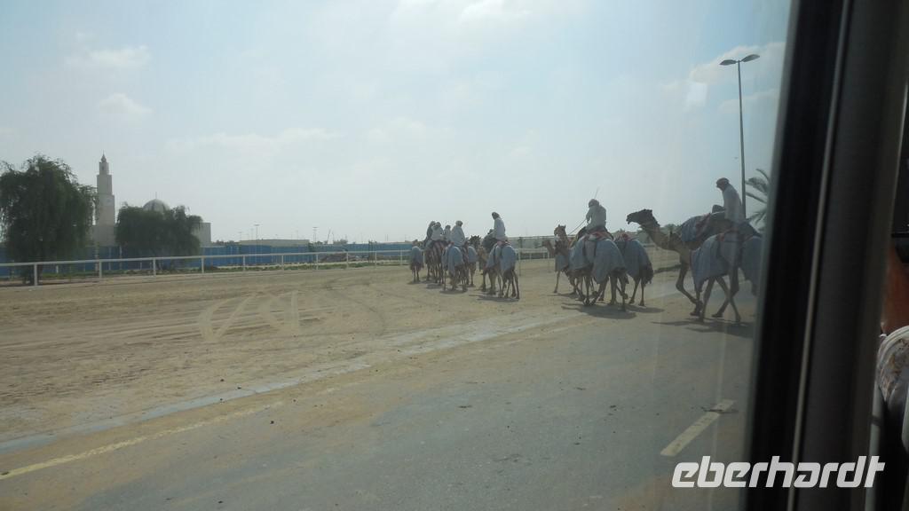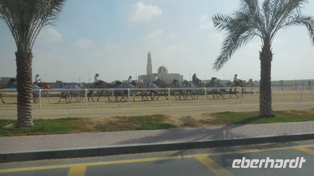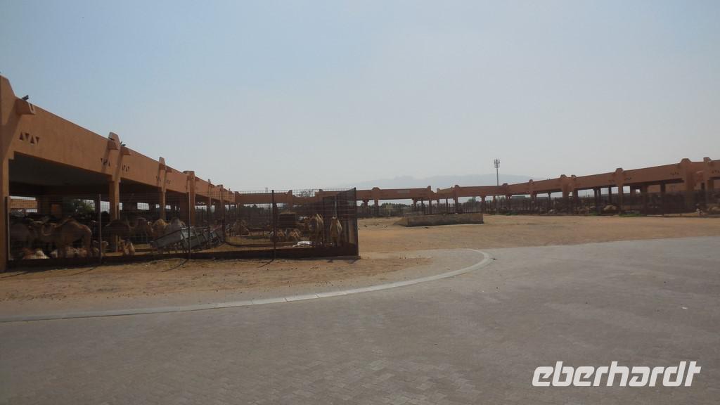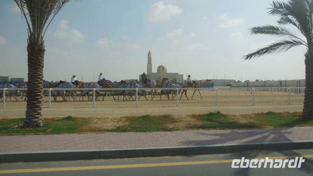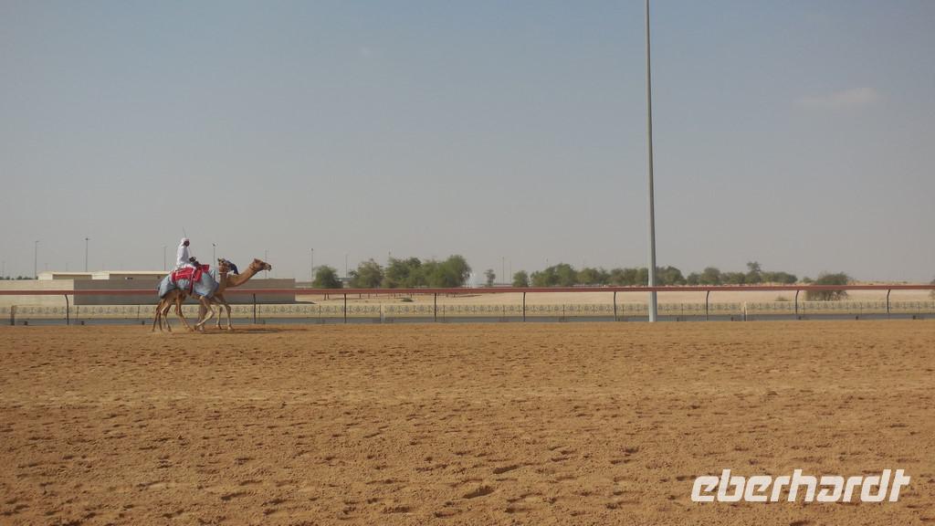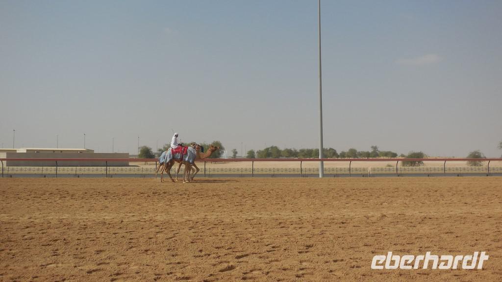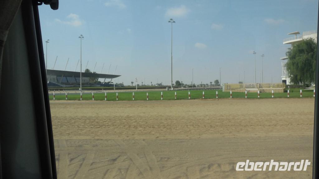 Unser 1. Stopp war die Kamelrennstrecke. Wir erfuhren, dass die Jockeys von kleinen Puppen ersetzt wurden. Wir hatten Glück und konnten ein paar beim Training zusehen. Das Gelände ist riesengroß.