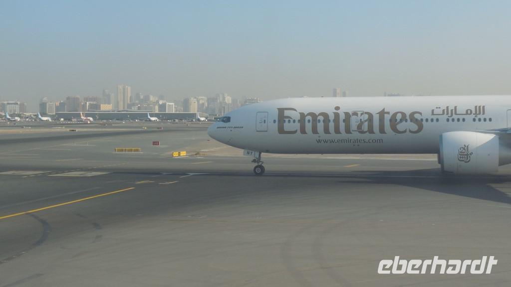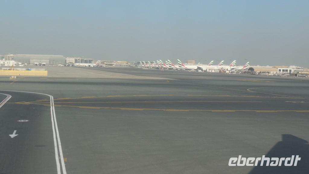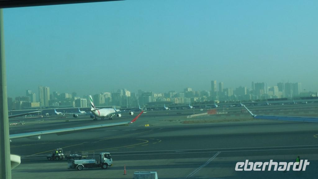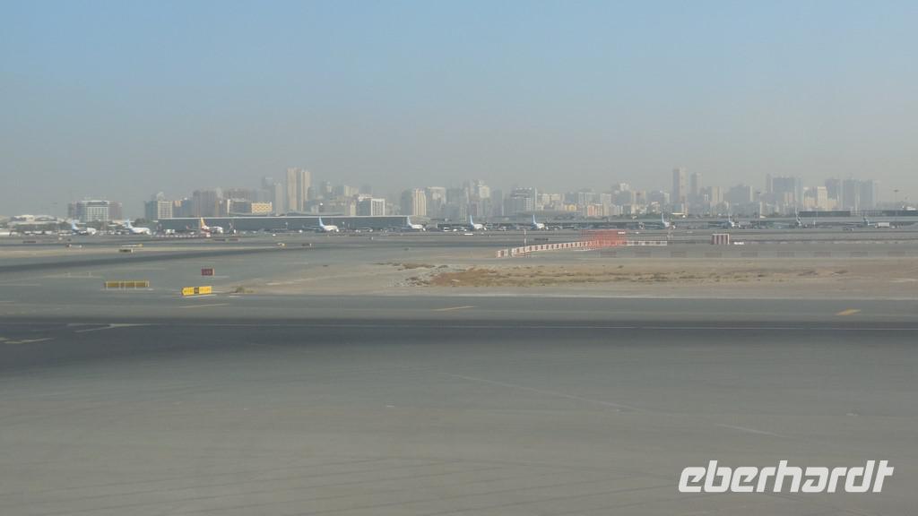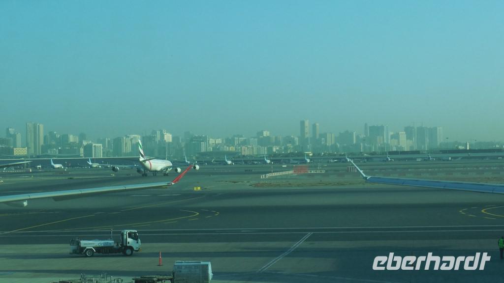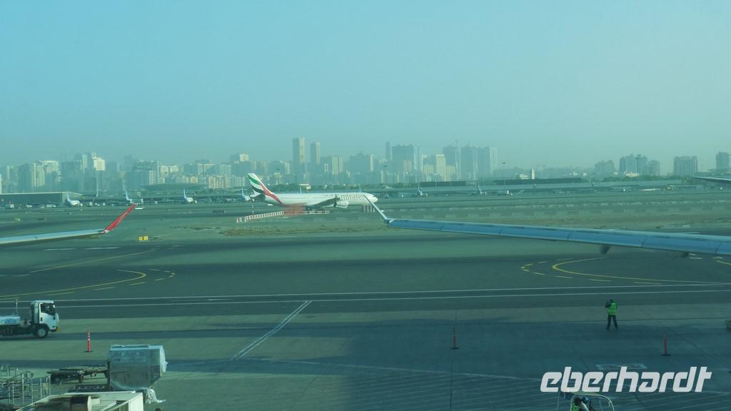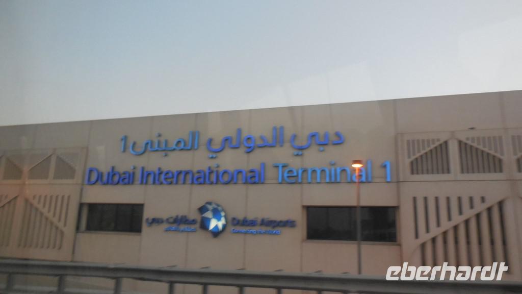 Sehr zeitig klingelt der Wecker, sogar noch vorm „Weckruf". Um 5 treffen wir uns im Foyer zu einem kleinen Frühstück. Kurz vor 6 kommen Anja und Akbar und holen uns ab. Schnell sind die Koffer verladen und es heißt Abschied nehmen. Wir danken Akbar für die gute, sichere Fahrt. Wir haben gestaunt, dass er immer die Nerven behalten hat, was in dem täglichen Stau schwer fiel. Unser besonderer Dank galt Anja. Sie hat uns zwar auf die Palme gebracht und in die Wüste geschickt, aber mit ihrem vielen Hintergrundwissen und Informationen hat Sie die Reise zu einem Erlebnis gemacht. Einer fand, das Highlight von Dubai ist eigentlich Anja, das fanden wir alle!
