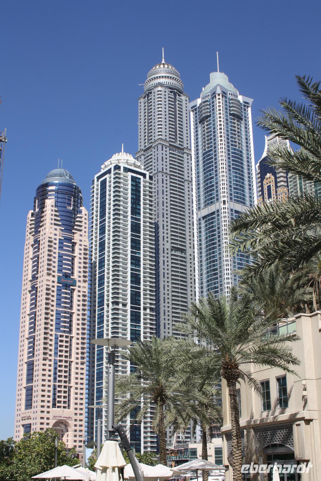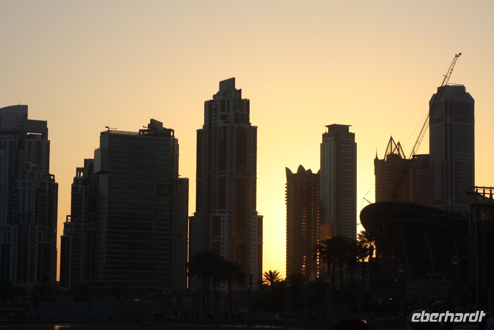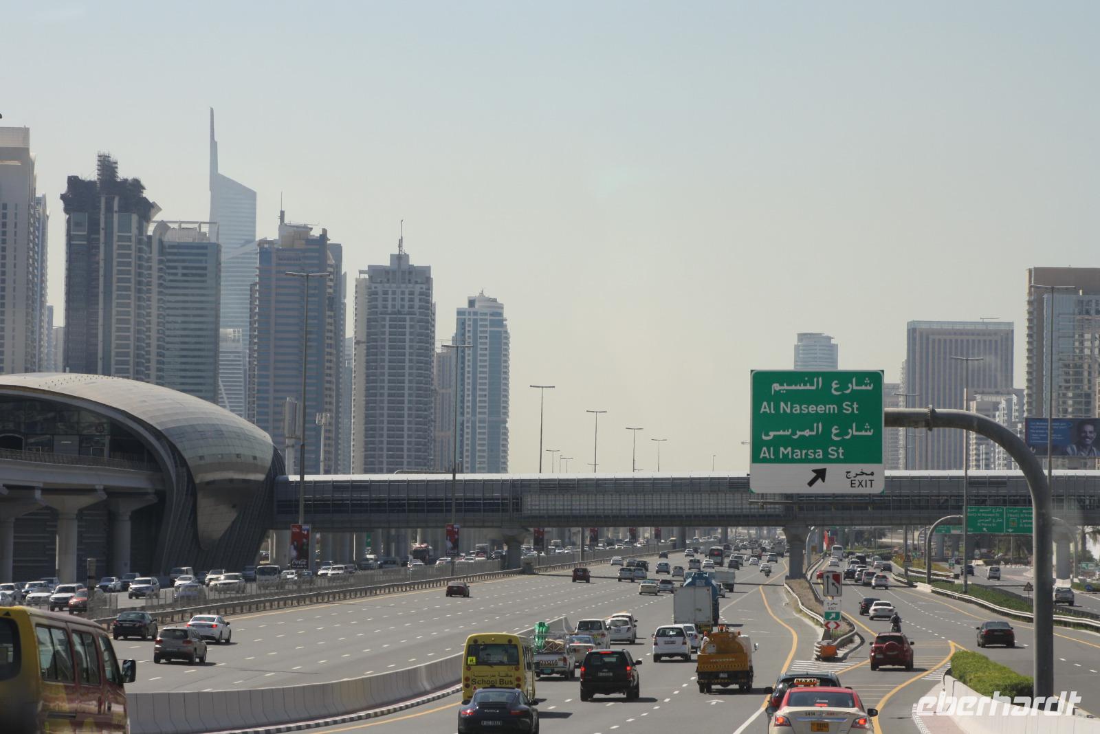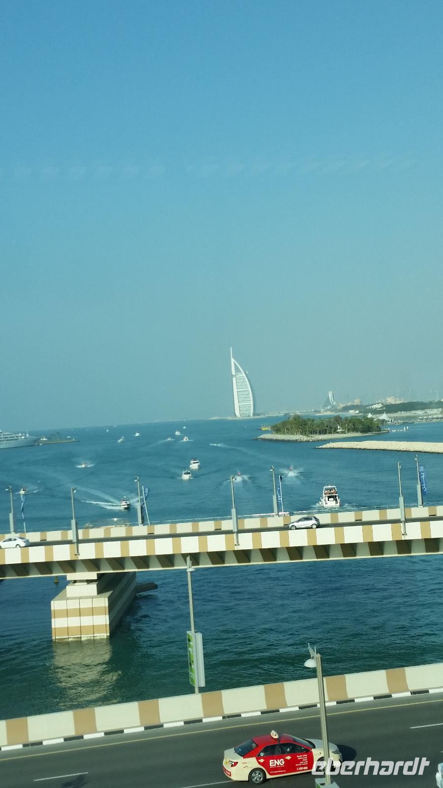 Im Anschluss fahren wir zurück zum Madinat Souk und entschließen uns, am Nachmittag zur Palm Jumeirah zu fahren, um dort einmal mit der Mono-Rail, einer automatischen Magnetschwebebahn, zum Hotel Atlantis zu fahren. Da an diesem Tage ein Kongress im Madinat-Souk tagt, haben wir einige Schwierigkeiten die Station zu erreichen. Wir entscheiden uns, den Ausflug zu vertagen und fahren somit mit der Metro zurück zum Hotel. Die Dubai Metro ist die längste, komplett automatisch betriebene Metro der Welt. Auf der Fahrt können wir den Anblick der unglaublichen Skyline Dubais genießen. Im Hotel nehmen wir unser Abendessen zu uns.