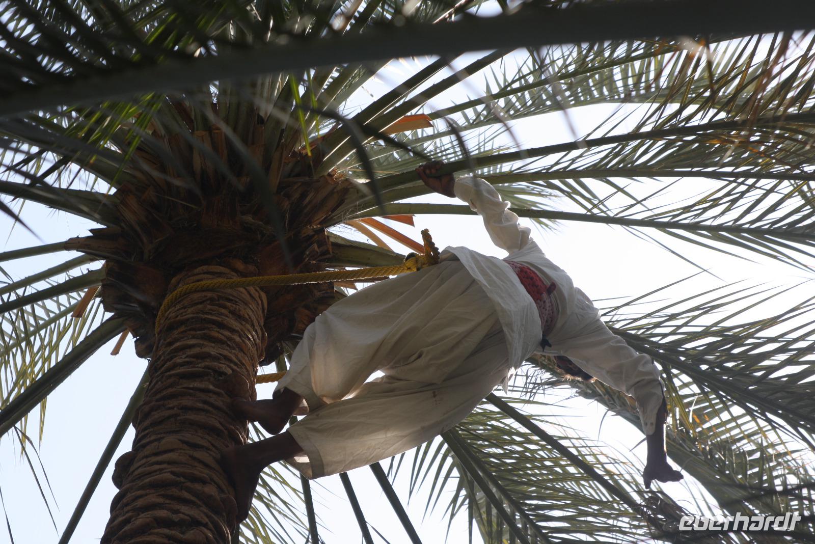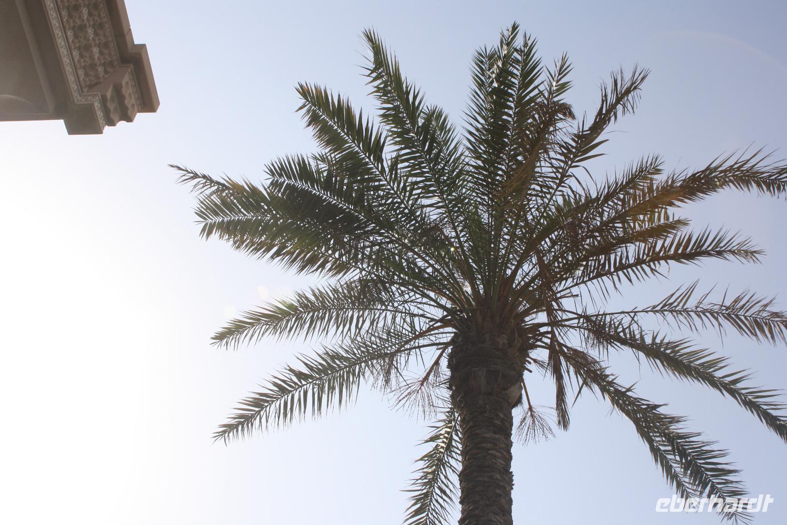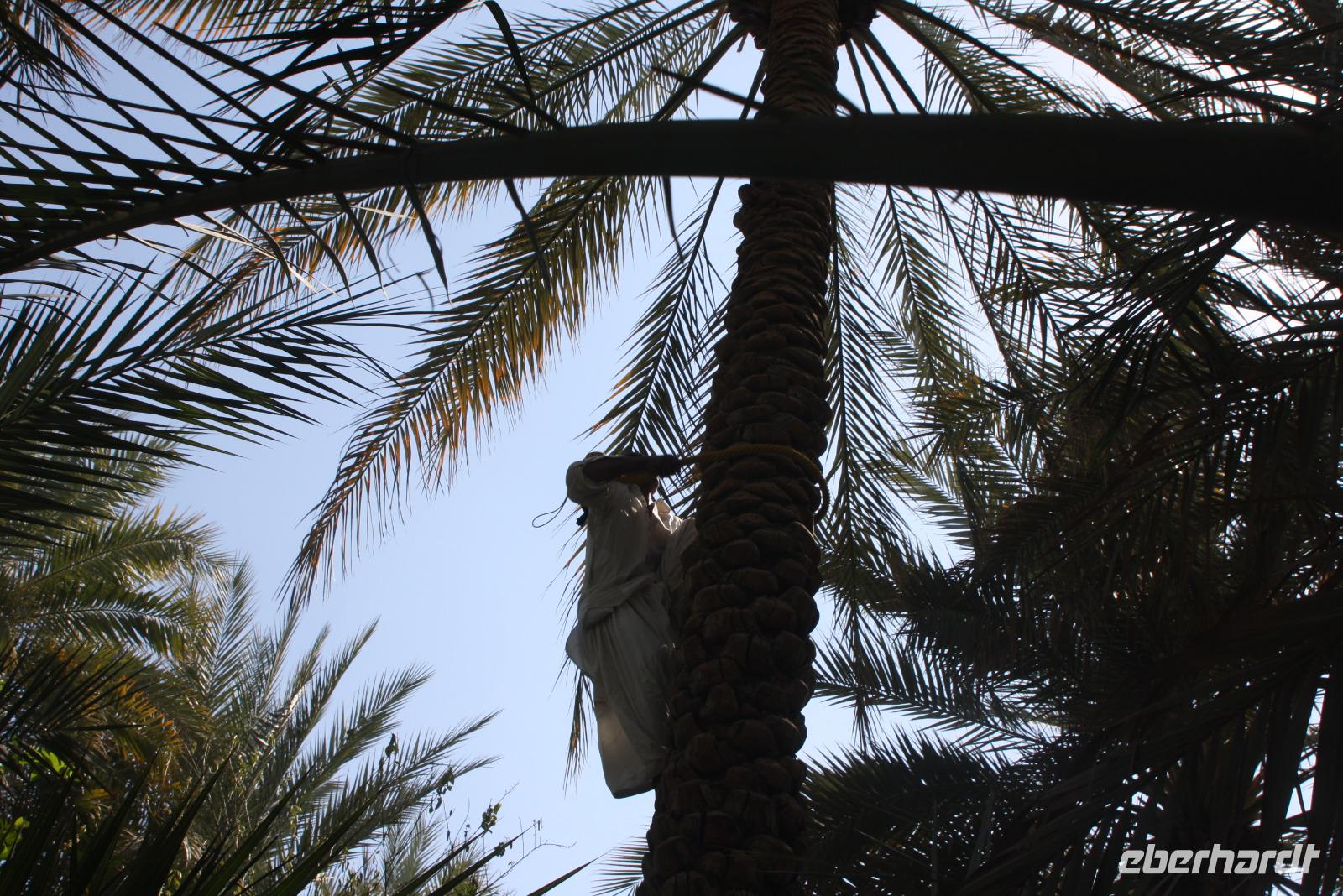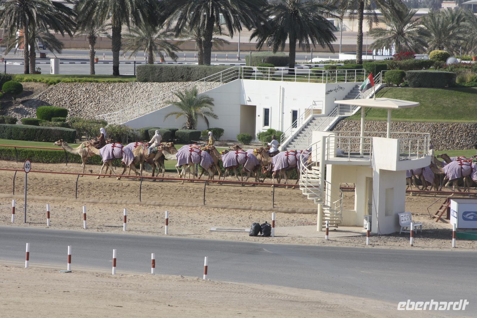 Heute steht uns wieder ein fakultativer Ausflug bevor. Dieser sollte auch der letzte auf unserer Rundreise durch die Emirate sein. Ziel des Ausfluges ist die Oasenstadt Al Ain, direkt an der Grenze zum Oman. Auf dem Weg dort hin zeigt uns Anja noch die Kamel-Rennstrecke. Hier finden fast jedes Wochenende im Winterhalbjahr Kamel-Rennen statt. Glücklicherweise können wir einige Kamelreiter erspähen. Im Anschluss fahren wir weiter nach Al Ain, wo wir das Nationalmuseum sowie die Oase besichtigen. Der „Gärtner" zeigt uns, wie man am besten eine Palme erklimmt, um die Früchte zu ernten.