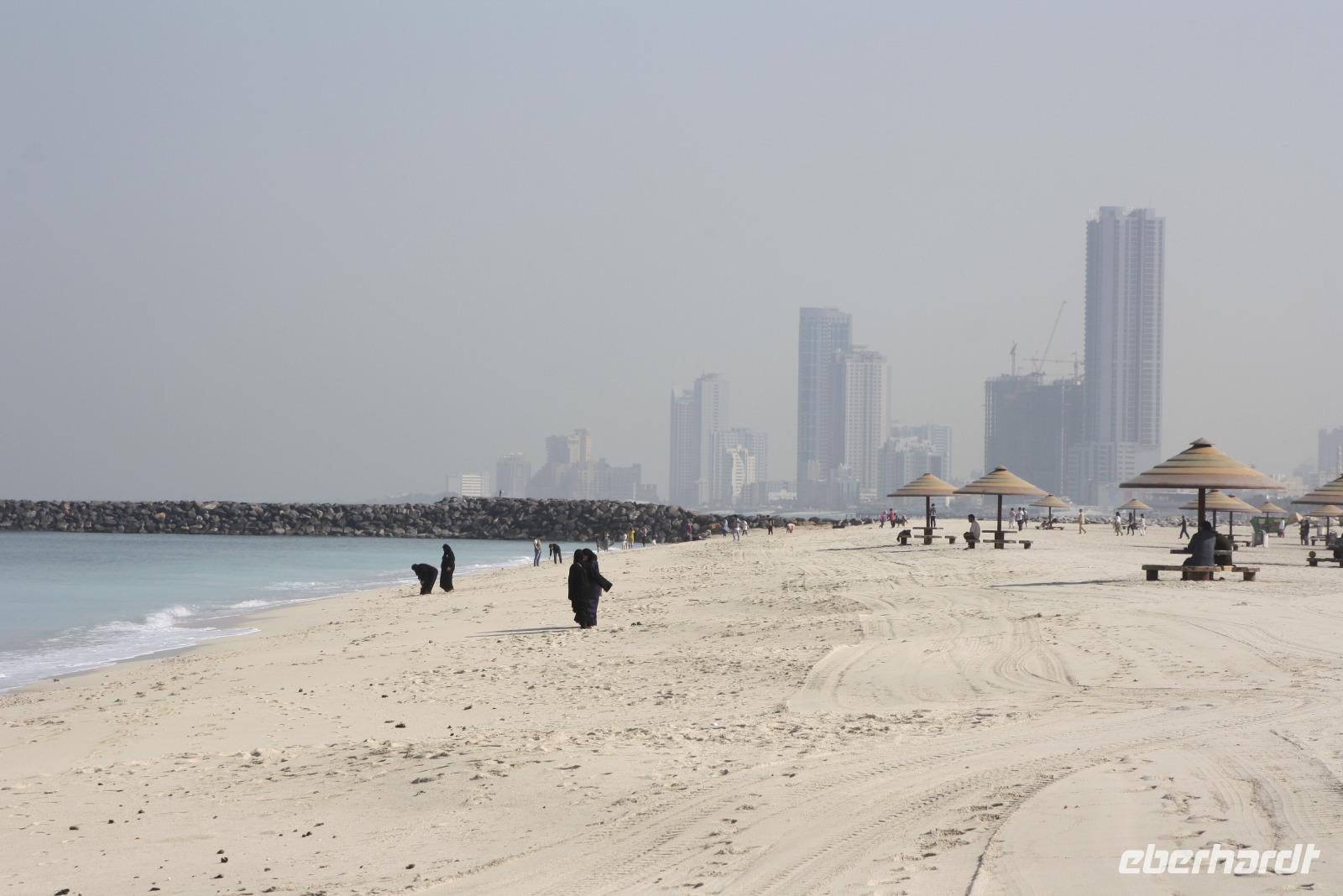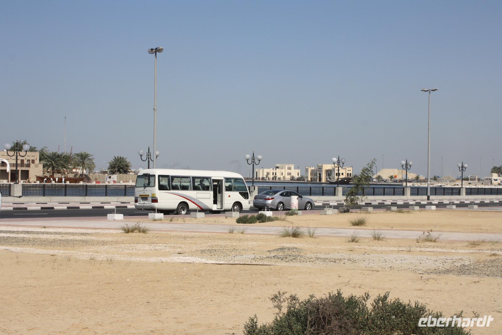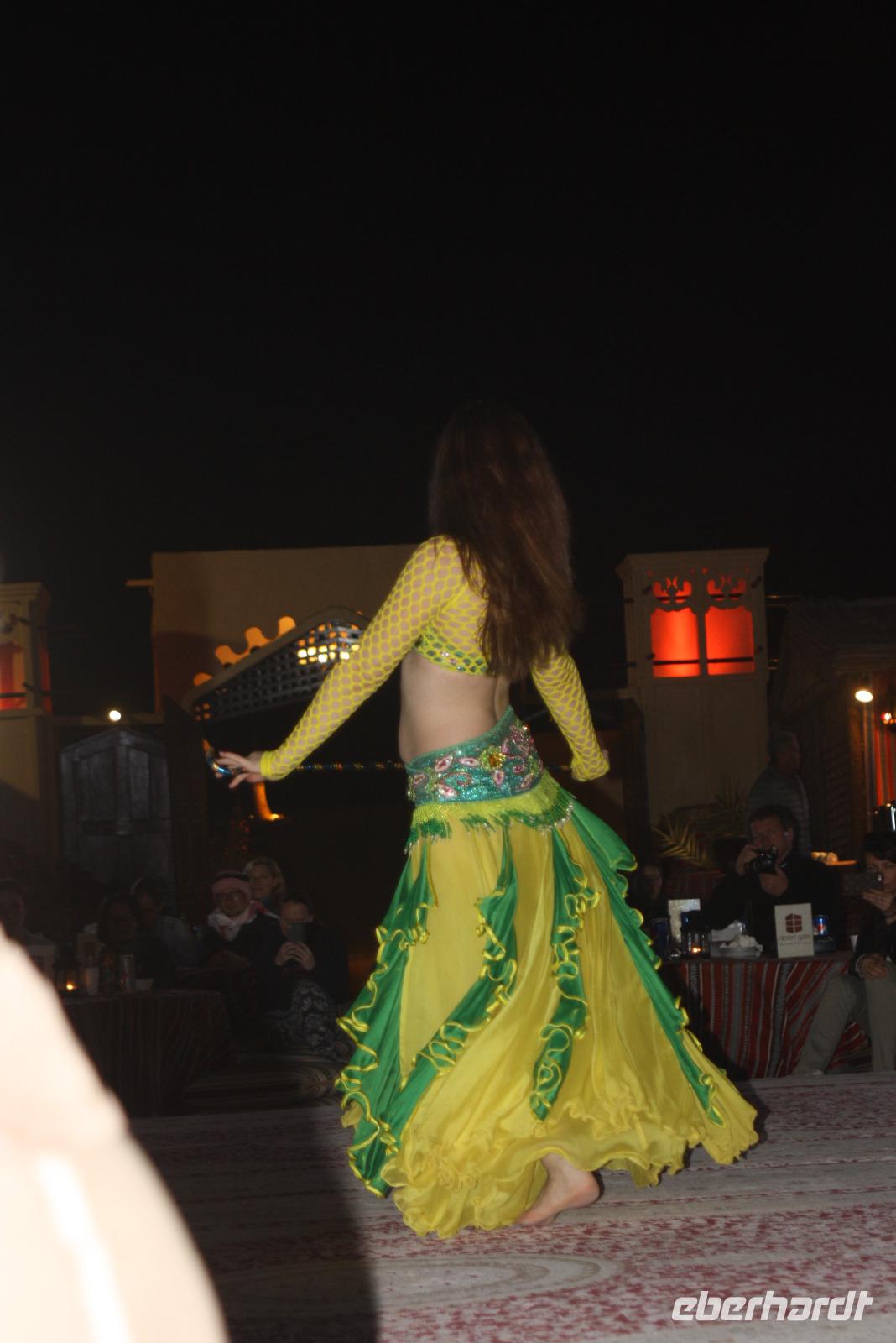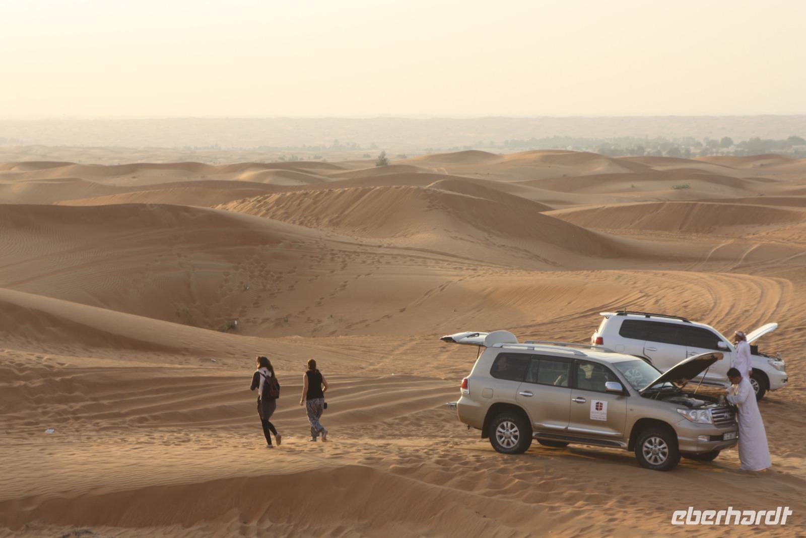 Der heutige Ausflug führt uns ins Nachbaremirat nach Sharjah. Das Emirat ist deutlich konservativer als Dubai - hier gilt die Scharia, welche strengstes Alkoholverbot und strenge Kleiderordnung voraussetzt. Unser erster Fotostopp ist am Koran-Kreisverkehr. In der Mitte des Kreisverkehrs ist hier eine Sure des Korans offengelegt. Von hier aus sieht man auch das Regierungsgebäude sowie den Kulturpalast von Sharjah. Wir fahren weiter und machen am Strand von Sharjah einen weiteren Halt und sammeln Muscheln. Von hier aus fahren wir zum Fisch-und Gemüsemarkt. Im Anschluss besichtigen wir den Blauen Souk und genießen dort eine kleine Mittagspause. Unser Mittagessen nehmen wir allerdings in unserem Hotel in Dubai ein. Am Nachmittag steht eine Wüstensafari auf dem Programm. Gegen 15:15 Uhr holen uns 2 Jeeps ab, um mit uns hinaus in die Wüste zu fahren. Den ersten Stopp haben wir an einer Tankstelle, wo die Fahrer ein wenig Luft aus ihren Reifen lassen, um besser durch den Wüstensand zu fahren. Und dann geht es schon los...Die Fahrer zeigen sich von der besten Seite - Düne hoch, Düne hinunter. Nach einer 20 minütigen Abenteuerfahrt machen wir wieder Halt, um den Sonnenuntergang in der Wüste zu erleben. Im Anschluss begeben wir uns zum Wüstencamp, um dort ein leckeres Barbecue und eine Bauchtanzshow zu genießen. Danach bringen uns unsere Fahrer mit den Jeeps zurück zum Hotel nach Dubai.