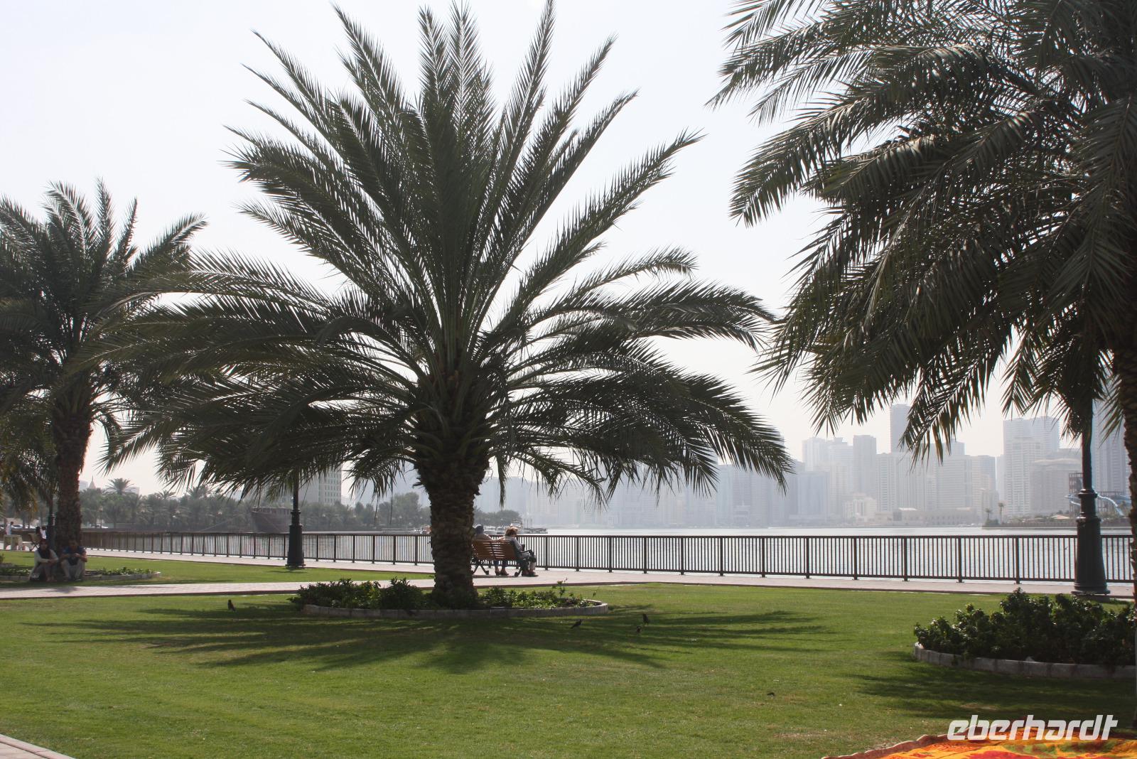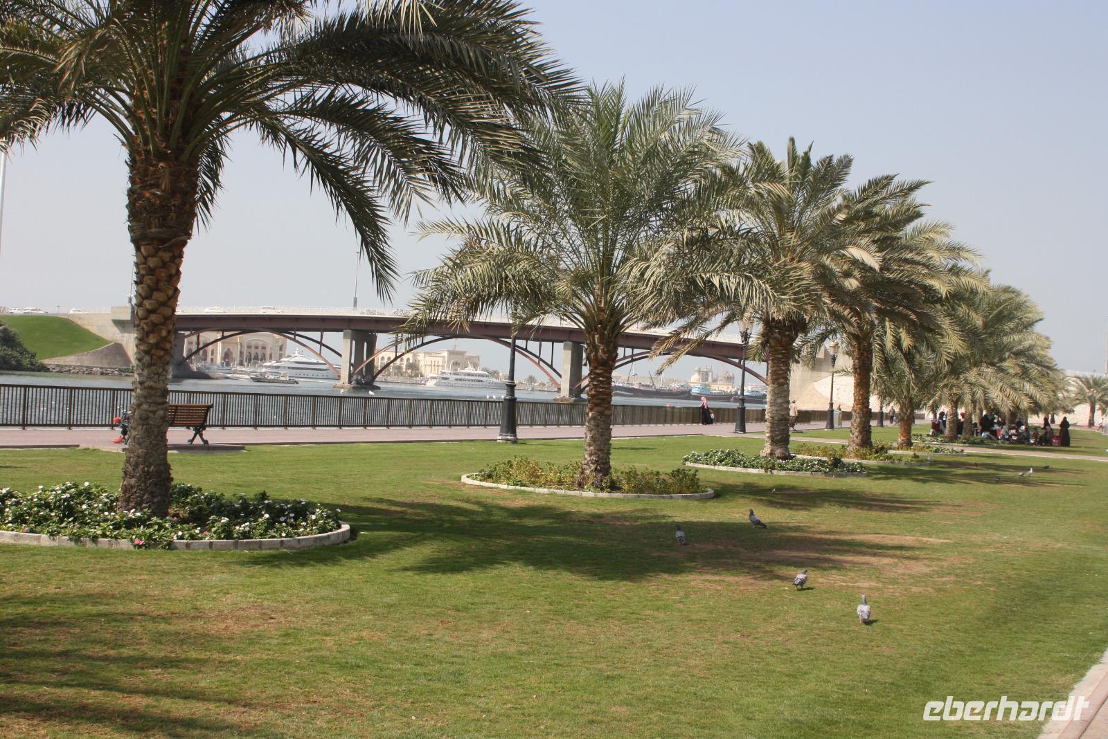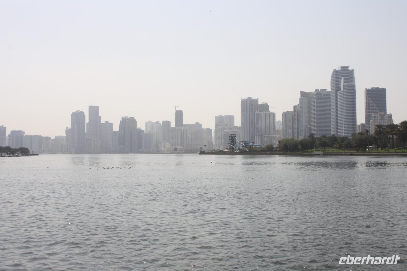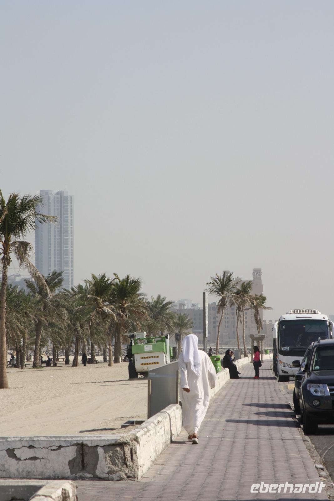 Der heutige Ausflug führt uns ins Nachbaremirat nach Sharjah. Das Emirat ist deutlich konservativer als Dubai - hier gilt die Scharia, welche strengstes Alkoholverbot und strenge Kleiderordnung voraussetzt. Unser erster Fotostopp ist am Koran-Kreisverkehr. In der Mitte des Kreisverkehrs ist hier eine Sure des Korans offengelegt. Von hier aus sieht man auch das Regierungsgebäude sowie den Kulturpalast von Sharjah. Wir fahren weiter und machen am Strand von Sharjah einen weiteren Halt und sammeln Muscheln. Von hier aus fahren wir zum Fisch-und Gemüsemarkt. Im Anschluss besichtigen wir den Blauen Souk und genießen dort eine kleine Mittagspause. Unser Mittagessen nehmen wir allerdings in unserem Hotel in Dubai ein. Am Nachmittag steht eine Wüstensafari auf dem Programm. Gegen 15:15 Uhr holen uns 2 Jeeps ab, um mit uns hinaus in die Wüste zu fahren. Den ersten Stopp haben wir an einer Tankstelle, wo die Fahrer ein wenig Luft aus ihren Reifen lassen, um besser durch den Wüstensand zu fahren. Und dann geht es schon los...Die Fahrer zeigen sich von der besten Seite - Düne hoch, Düne hinunter. Nach einer 20 minütigen Abenteuerfahrt machen wir wieder Halt, um den Sonnenuntergang in der Wüste zu erleben. Im Anschluss begeben wir uns zum Wüstencamp, um dort ein leckeres Barbecue und eine Bauchtanzshow zu genießen. Danach bringen uns unsere Fahrer mit den Jeeps zurück zum Hotel nach Dubai.