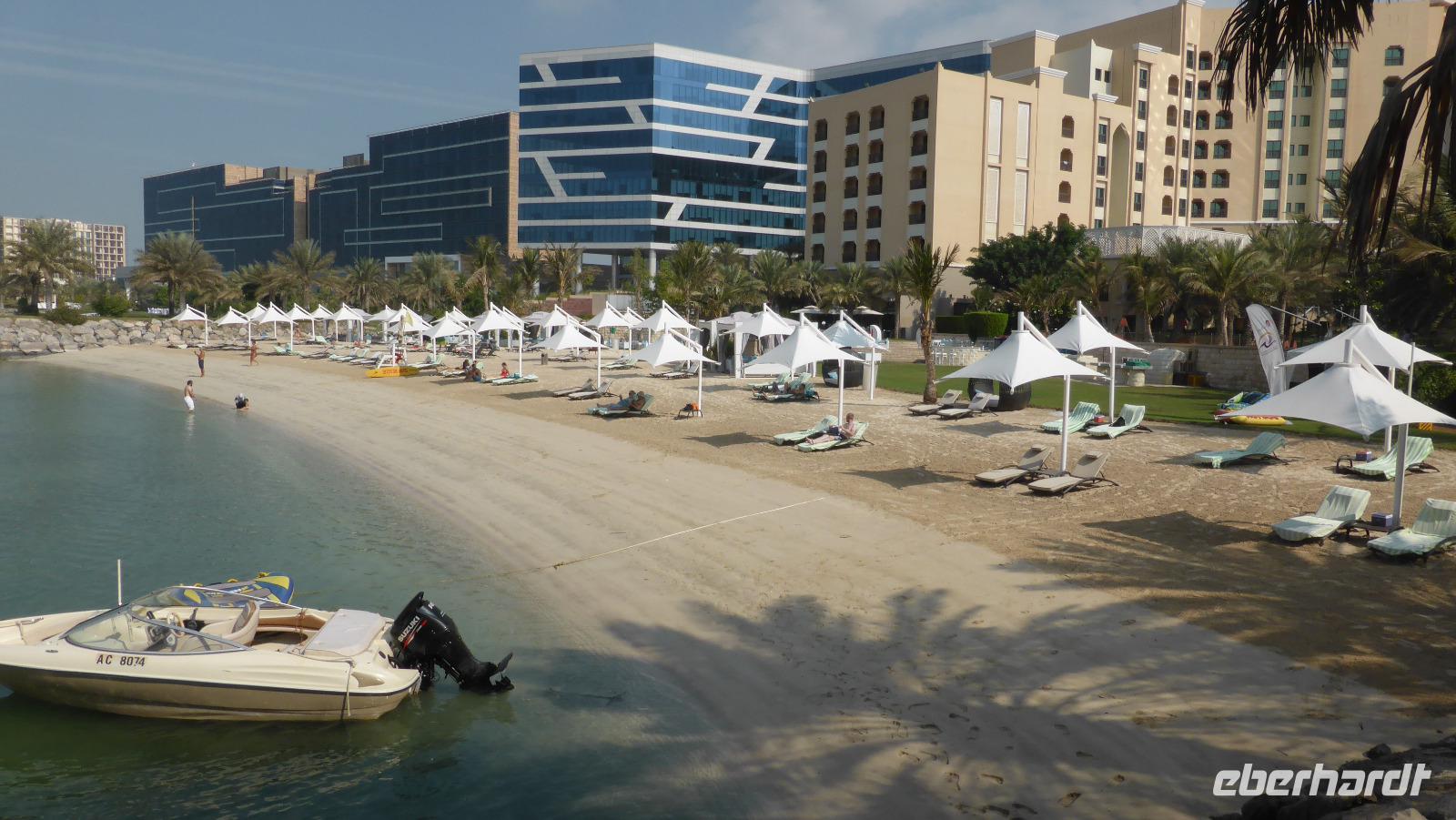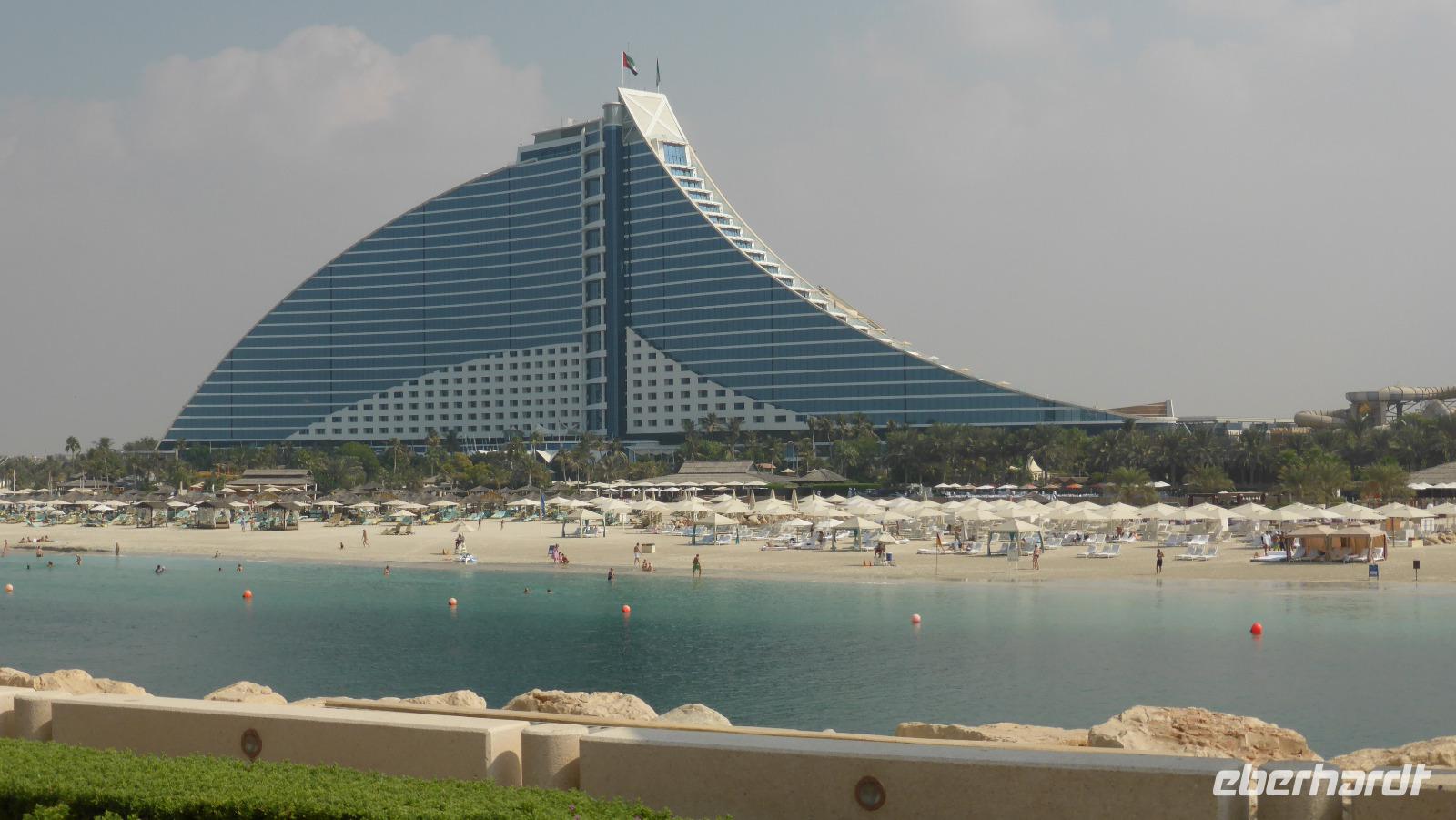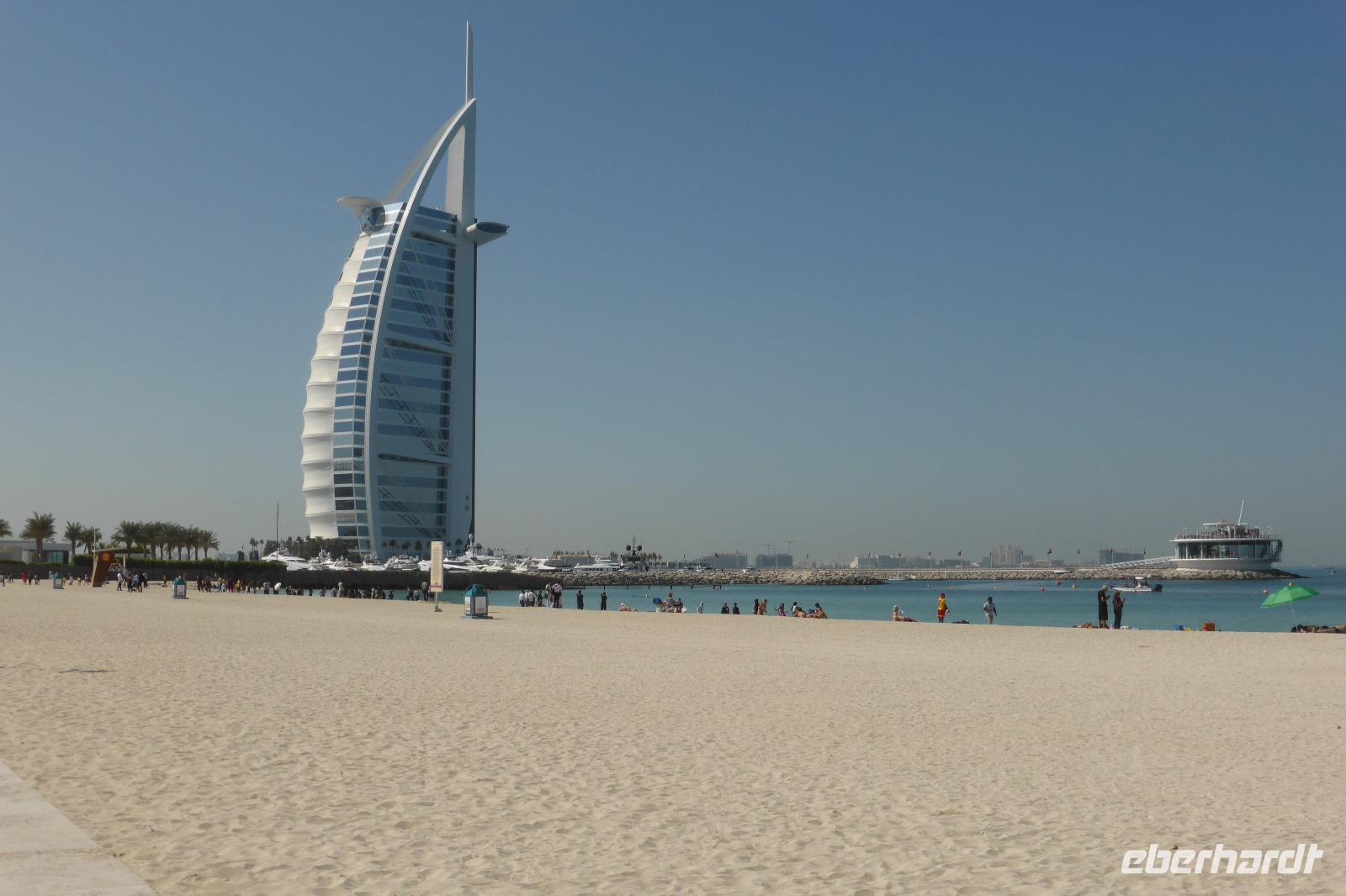 - Halt am Strand, dem Jumairah Beach mit Blick auf das Burj Al Arab, 1999 eröffnet und damals mit 321 Meter welthöchstes Hotel. Inzwischen hat sich bei diesem Rekord Dubai selbst schon wieder und mehrfach übertroffen. In der kommenden Woche werden die Meisten von uns das berühmte 7-Sterne Hotel Burj Al Arab während eines Mittagessens besuchen.