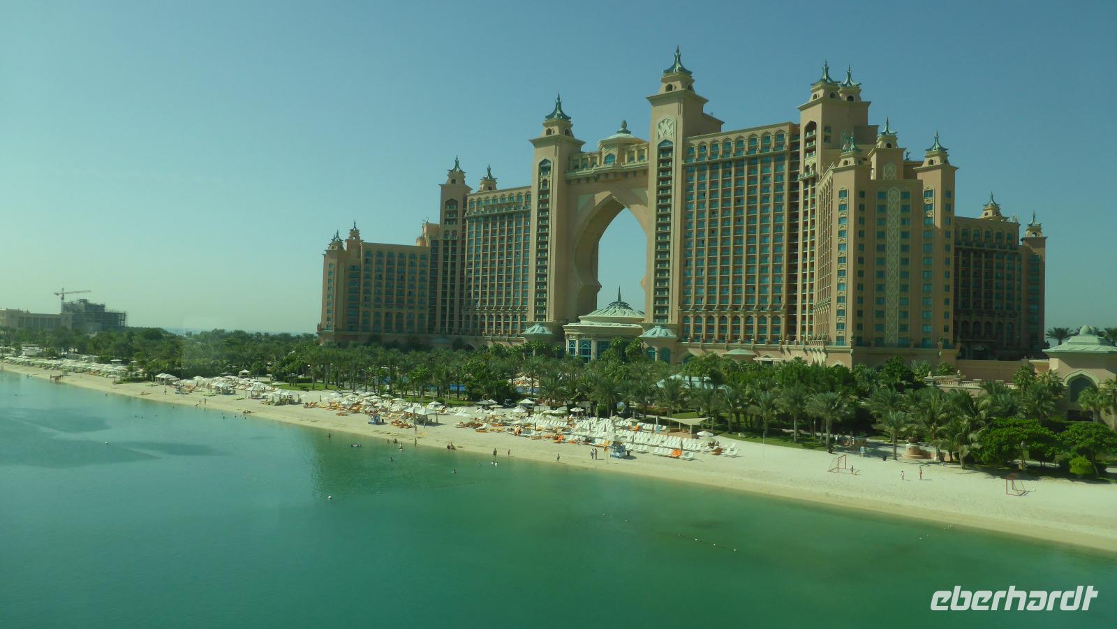 - Besuch der größten künstlichen Insel der Welt, der Palmeninsel „Palm Jumairah": Wir halten hier am Atlantis-Hotel, mit rund 1.500 Betten lange Zeit größtes Hotel Dubais. Während der Immobilien- und Finanzkrise 2010 wurde es an einen ausländischen Investor verkauft. In der Einkaufspassage des Hotels bekommen wir eine Vorstellung von der Inneneinrichtung, welche sich ganz an Meeresmotiven orientiert. Mit der Monorail, der inseleigenen Hochbahn, fahren wir vom Atlantis auf dem Palmenstamm zurück zum Festland. Von der Monorailstation am Atlantis haben wir Aussicht auf den Wassererlebnispark mit Wasserkanälen und vielen Rutschen. Und selbst hier auf Palm Jumairah kommen wir um den Namen Donald Trump nicht herum - einst wollte er auf dem Palmenstamm einen Trump-Tower als Inselwahrzeichen errichten. Jetzt findet man an dieser Stelle nur ein großes Loch. Das Projekt wurde ein Opfer der Immobilienkrise.