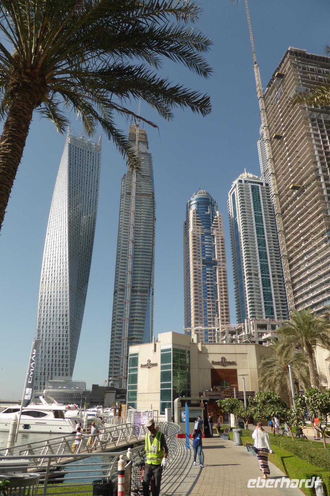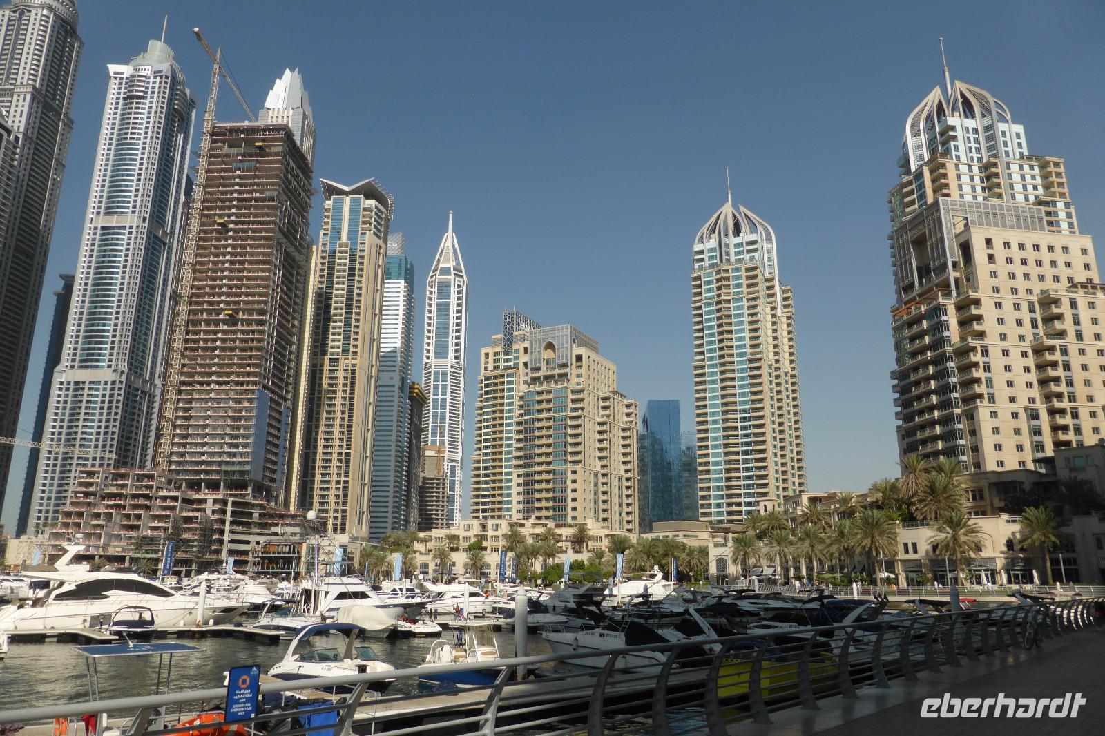 - Dubai Marina: Ismael fährt uns kreuz und quer durch den neuen Stadtteil mit der künstlichen Lagune. Viele der Wolkenkratzer hier erreichen mehr als 300 Meter, das höchste Wohngebäude der Welt sogar 414 Meter. Zur Meerseite ist das neue Bauprojekt Bluewaters Island mit dem künftig größten Riesenrad der Welt zu sehen. Wir halten nahe der Lagune von Dubai Marina und können bei einem kleinen Spaziergang die Wolkenkratzer bestaunen.