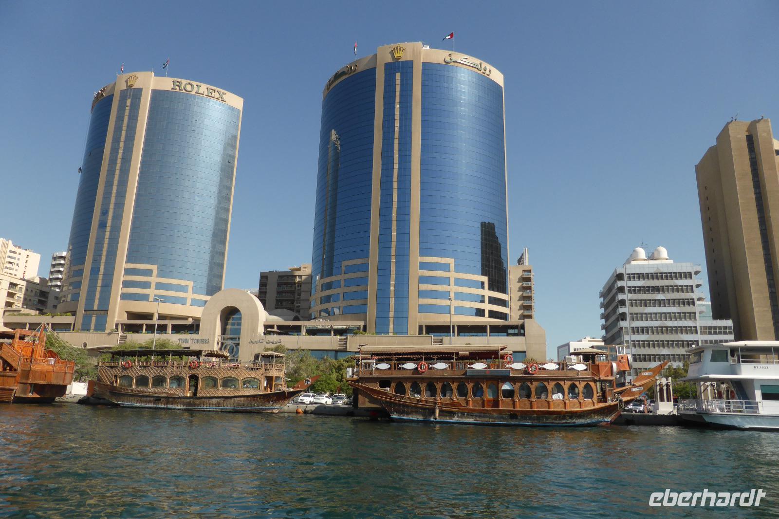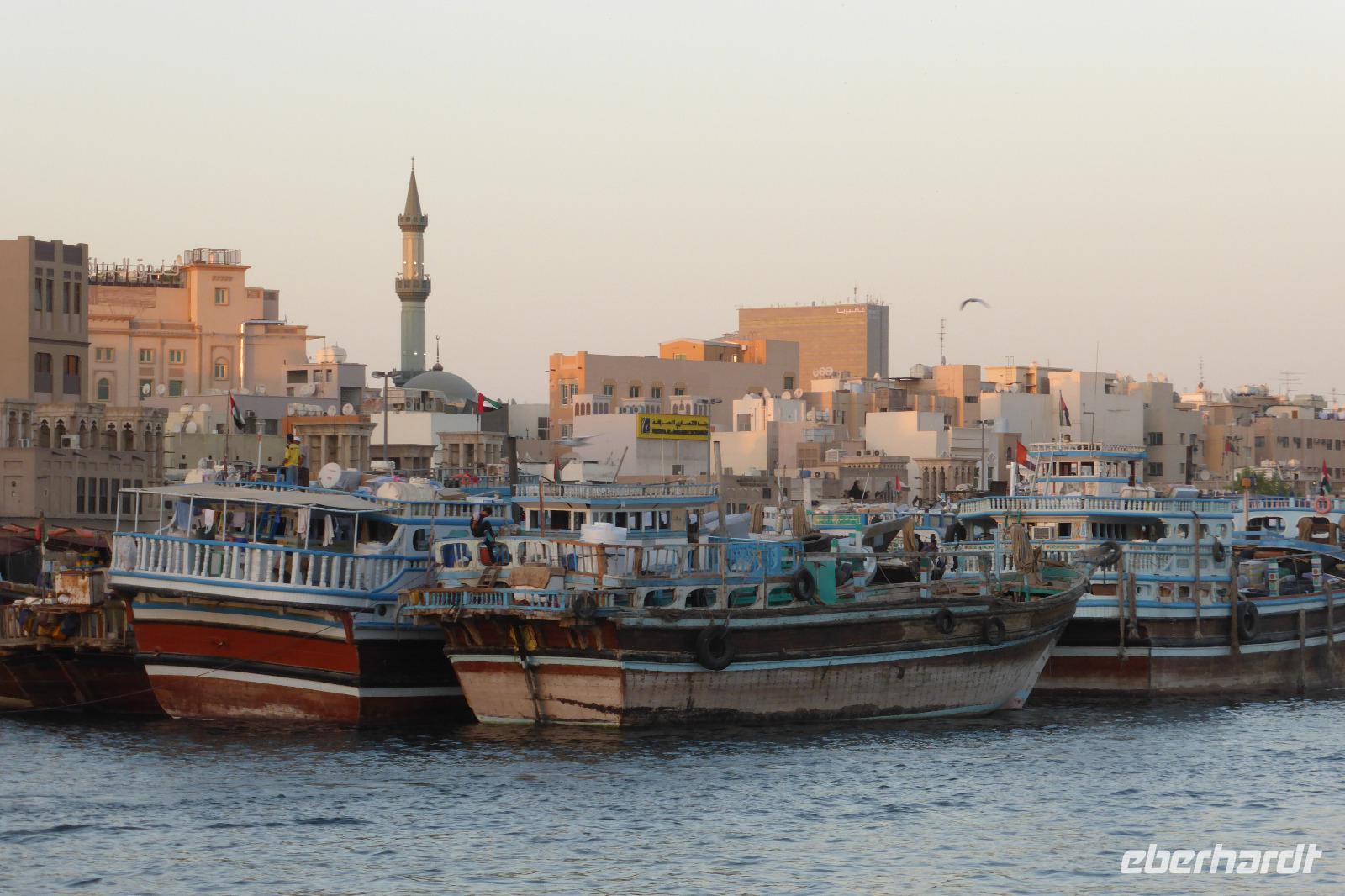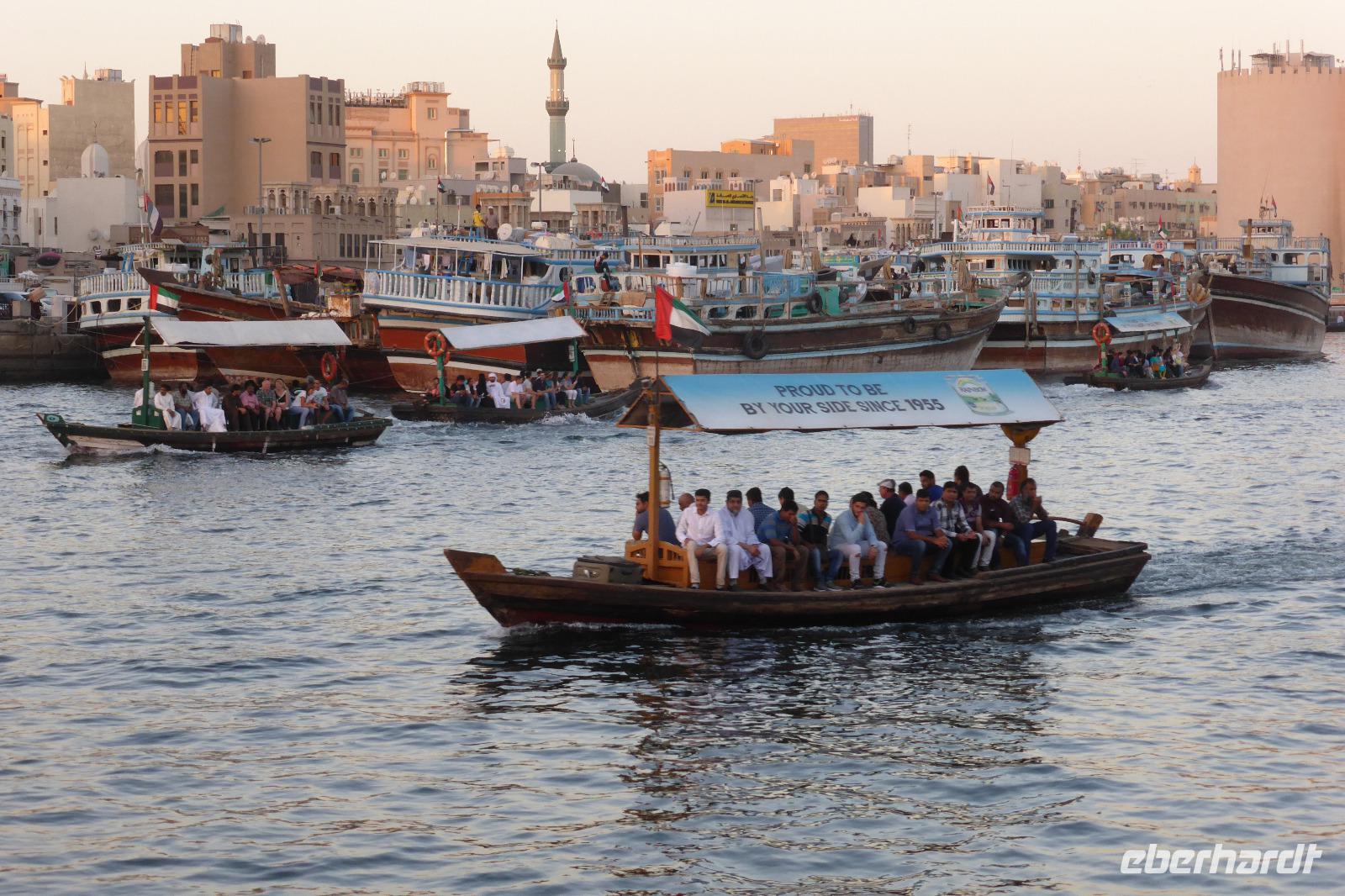Zum Sonnenuntergang erreichen wir wieder Dubai. Nach dem Abendessen unternehmen wir noch eine selbstorganisierte Lichterfahrt - einfach eine Abra am Creek anheuern und dann vom Wasser aus die beleuchteten Ufer an einem vorbeiziehen lassen...