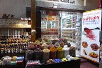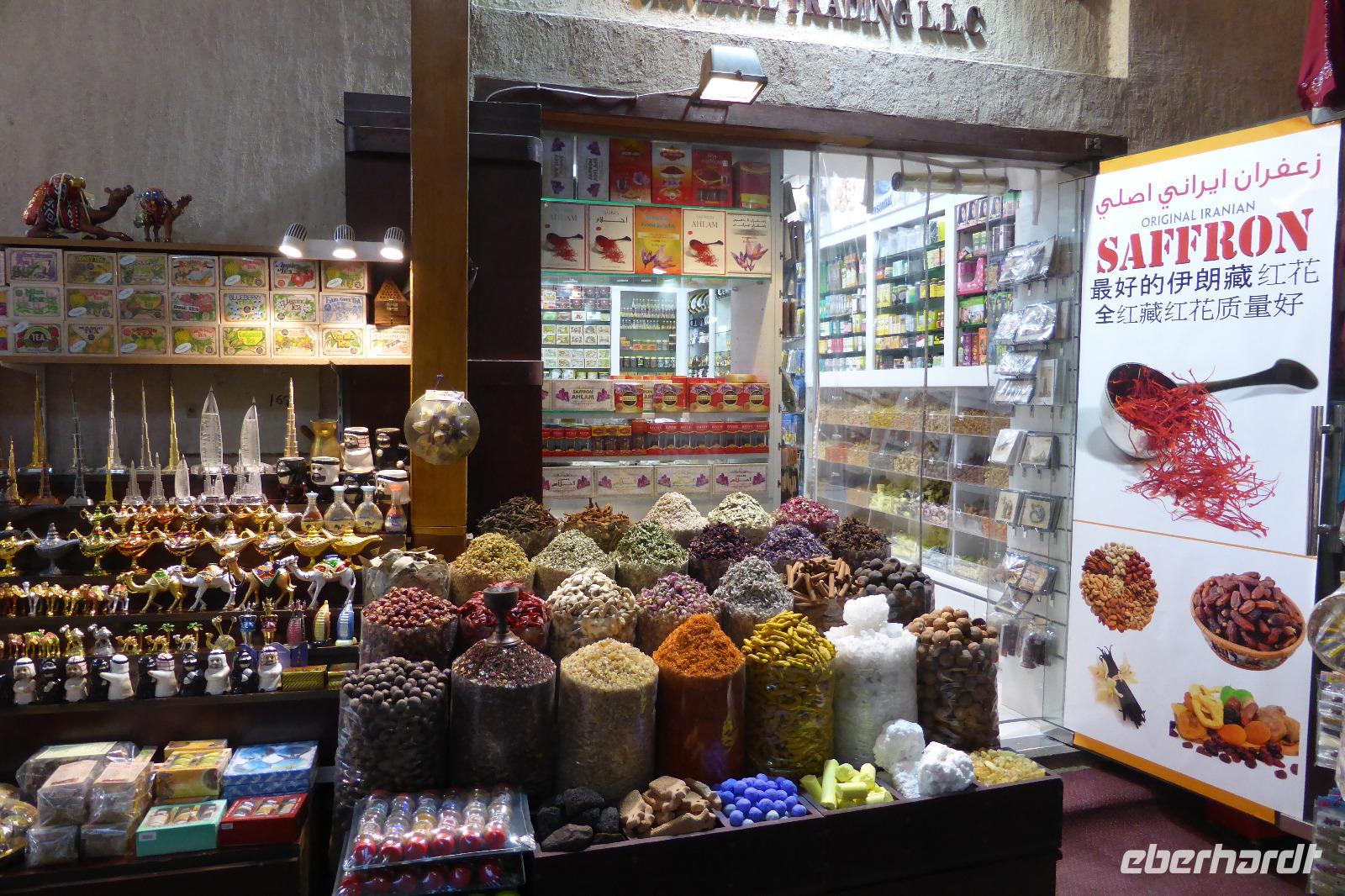 Da unser Hotel neben den Souks (souk = arabisch für Markt) der Altstadt liegt, können wir gleich zu Fuß zu den Märkten am Creek gelangen. Der Creek, englisch für Lagune, ist ein Meeresarm, welcher wie ein Fluss das alte Dubai in die Stadtviertel Bur Dubai (unsere Hotelseite) und Deira teilt. Arabische Märkte sind nach Waren sortiert. Zuerst durchqueren wir die Stoffabteilung mit Artikeln wie Pashmina Schals. Mit einem Wassertaxi, Abra genannt, fahren wir auf die andere Creekseite, zum Gewürzmarkt, jedoch machen wir einen großzügigen Umweg den Creek hinauf bis zur Bank of Dubai (Gebäude mit der gewölbten Fassade), in deren Fassade sich unsere Abra spiegelt. Der Gewürzmarkt besteht im Prinzip aus einer engen Gasse, welcher fest in der Hand iranischer Händler ist. Besonders begehrte Artikel sind Safran, Vanille und Kurkuma. Letzteres kommt bei uns als natürliche Medizin gegen alles Mögliche immer mehr in Mode.