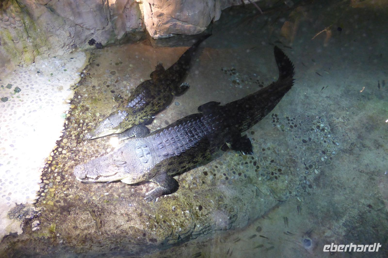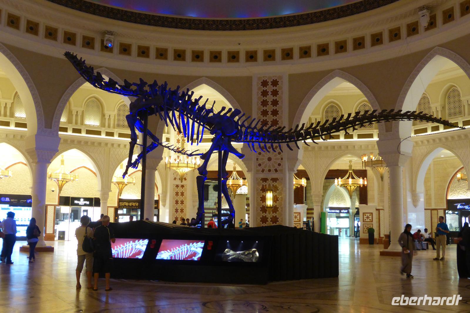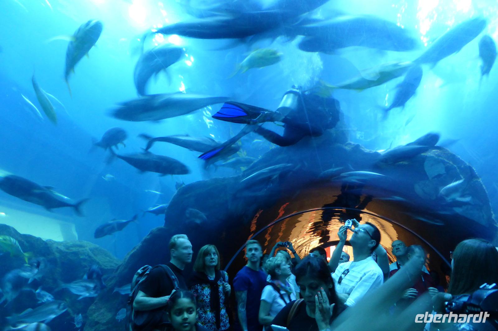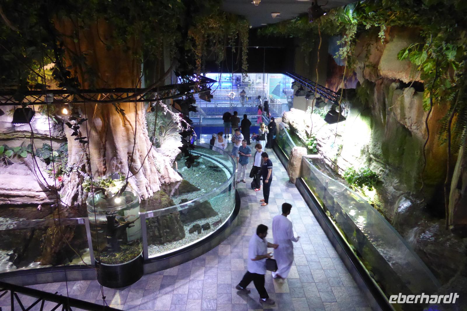 Mittag finden Ismael und wir dann irgendwie zusammen und fahren mit dem Bus ins moderne Dubai Down Town. Zentrum dieses neuen Stadtteils sind der 828 Meter hohe Burj Khalifa, Dubais größte Shopping Mall „Dubai Mall", einer Wasserlandschaft und der Markt Souk Bahar.In der Dubai Mall unternehmen wir zunächst einen Orientierungsrundgang (Dino, Regenschirmhalle, Eislauffläche, Wasserfall) und lernen so schon einige Attraktionen kennen. Die Hauptattraktion der Dubai Mall ist das weltgrößte, drei Etagen hohe Aquarium mit Tunnel und angeschlossenem Indoor Zoo. Der Zoo zeichnet sich durch außergewöhnliche Tierarten aus der Süß- und Salzwasserwelt aus, zeigt in einem abgedunkelten Bereich nachtaktive Wüstenbewohner und zwei australische Salzwasserkrokodile leben hier auch.