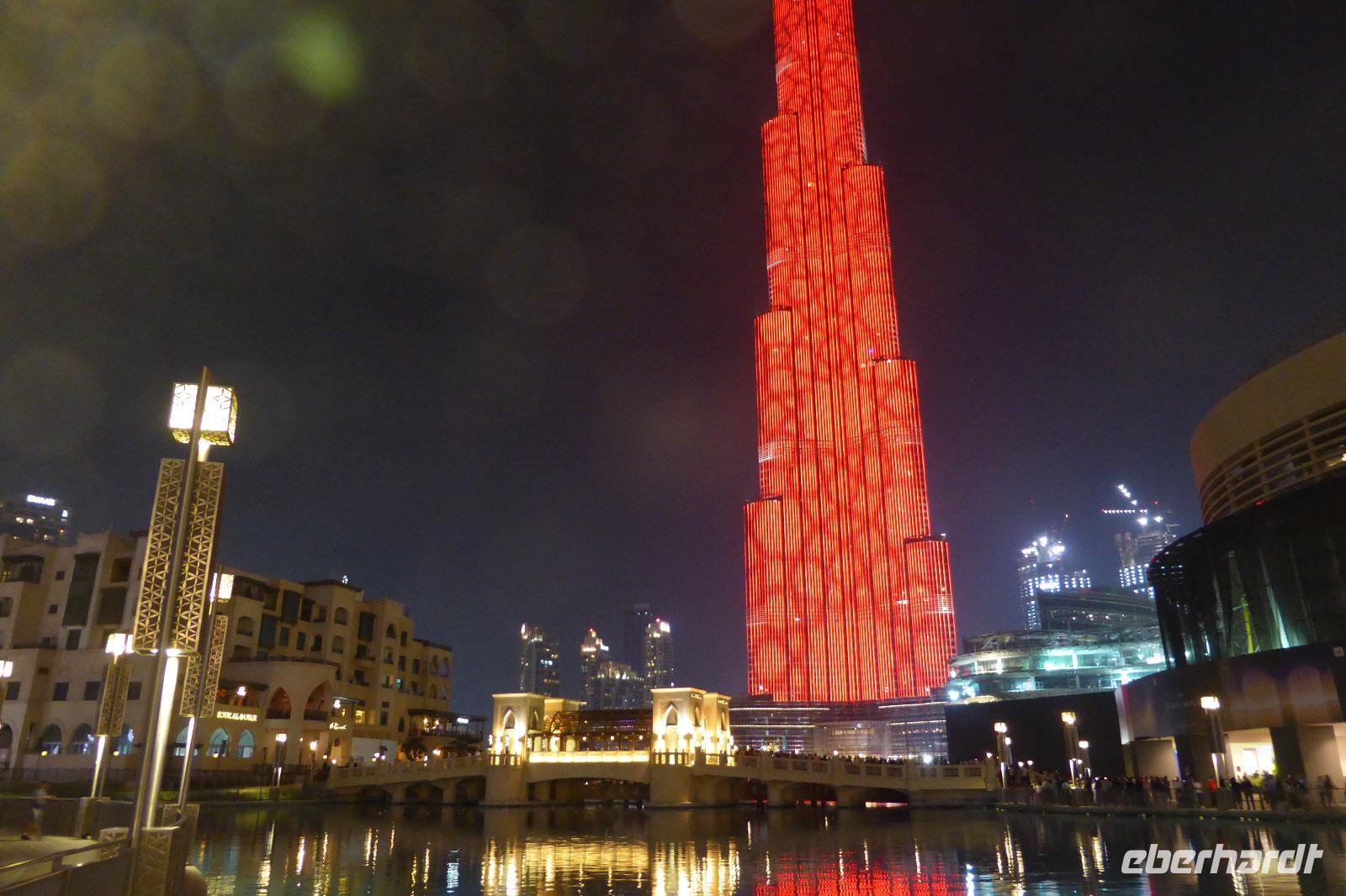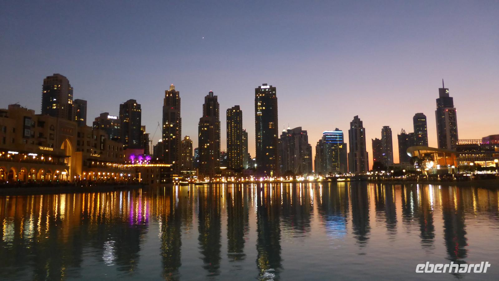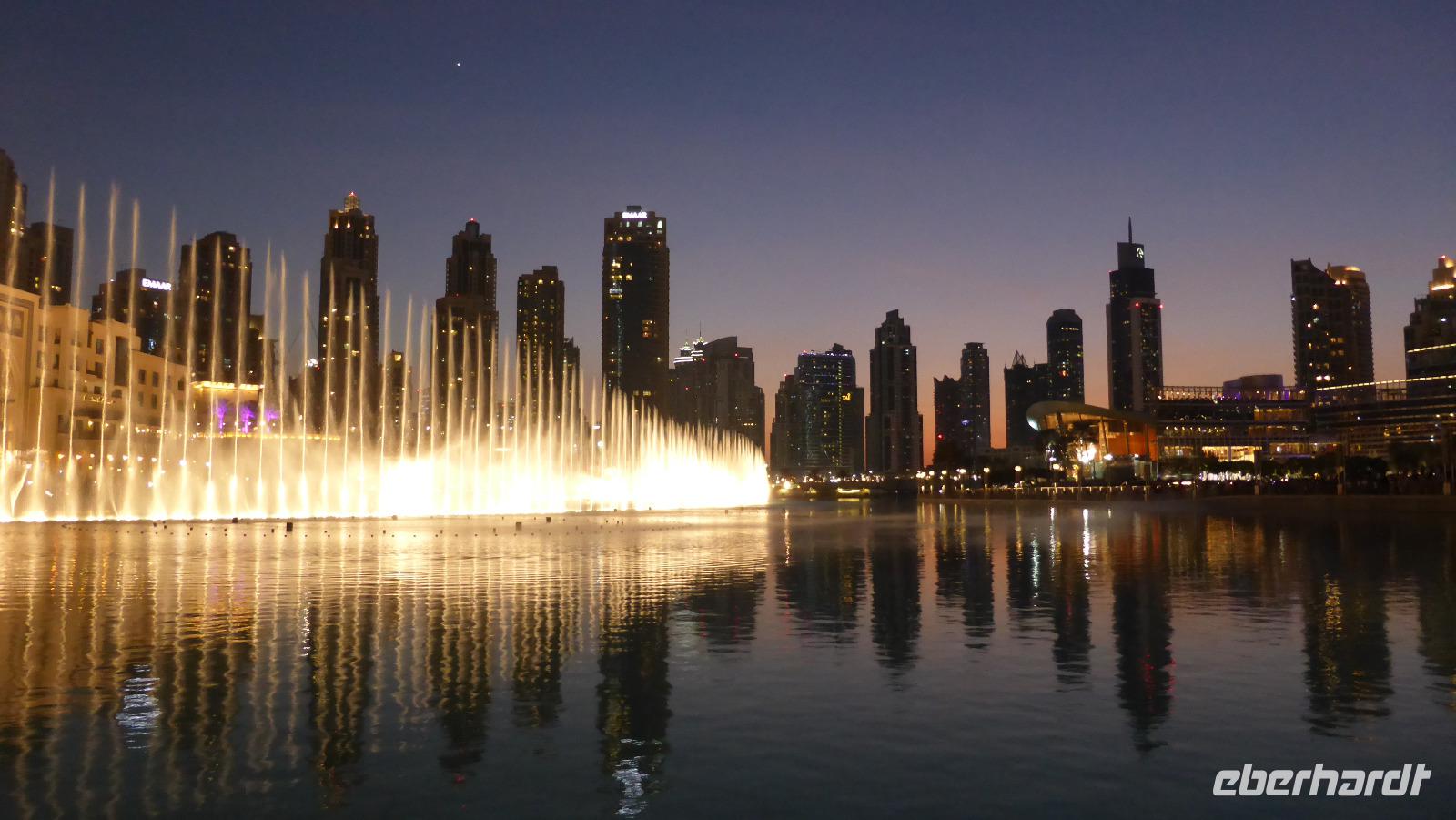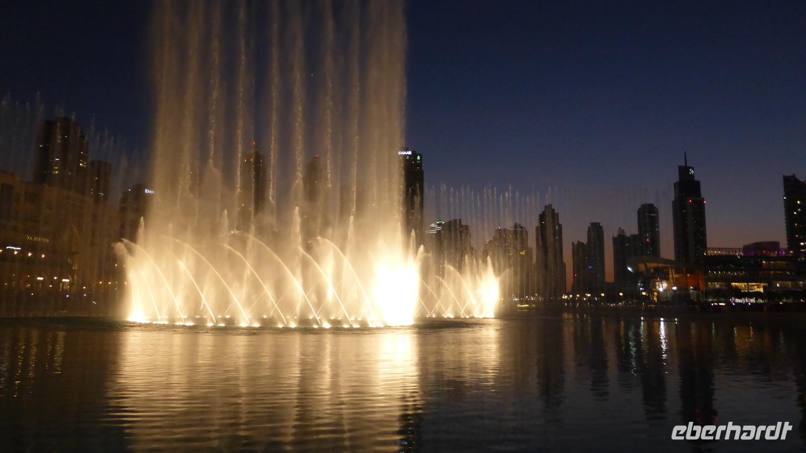 Kurz vor 18.00 Uhr versammeln wir uns zusammen mit hunderten von Besuchern am Fuße des Burj Khalifas, um die Dubai Fountain zu sehen. Es ist die allabendliche Unterhaltung von Wasserspielen, welche passend auf Musik aus Ost und West abgestimmt sind. Das Vorbild in Las Vegas übertrifft Dubai mit den welthöchsten Fontänen.
