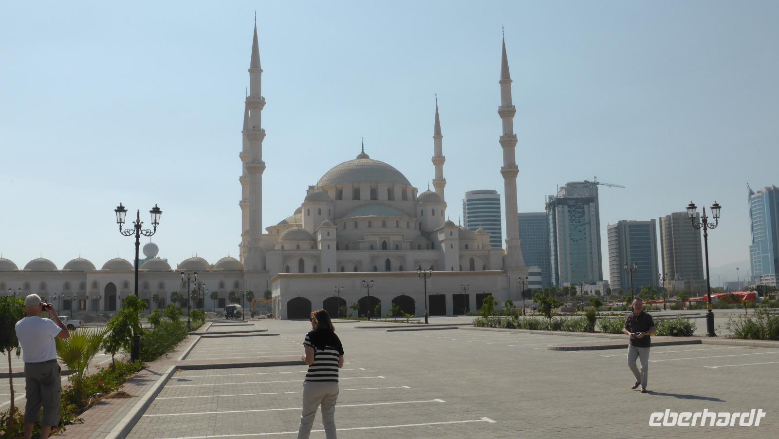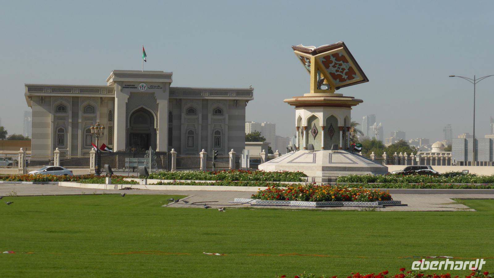 Zuletzt halten wir noch am größten Markt von Sharjah , dem Zentralsouk, auch Blauer Souk genannt, die Dächer des Doppelgebäudes mit charakteristischen Windtürmen bebaut. Von hier aus sehen wir die von Saudi Arabien gesponserte King Faisal Moschee und den Unabhängigkeitsplatz mit Einheitsspringbrunnen.