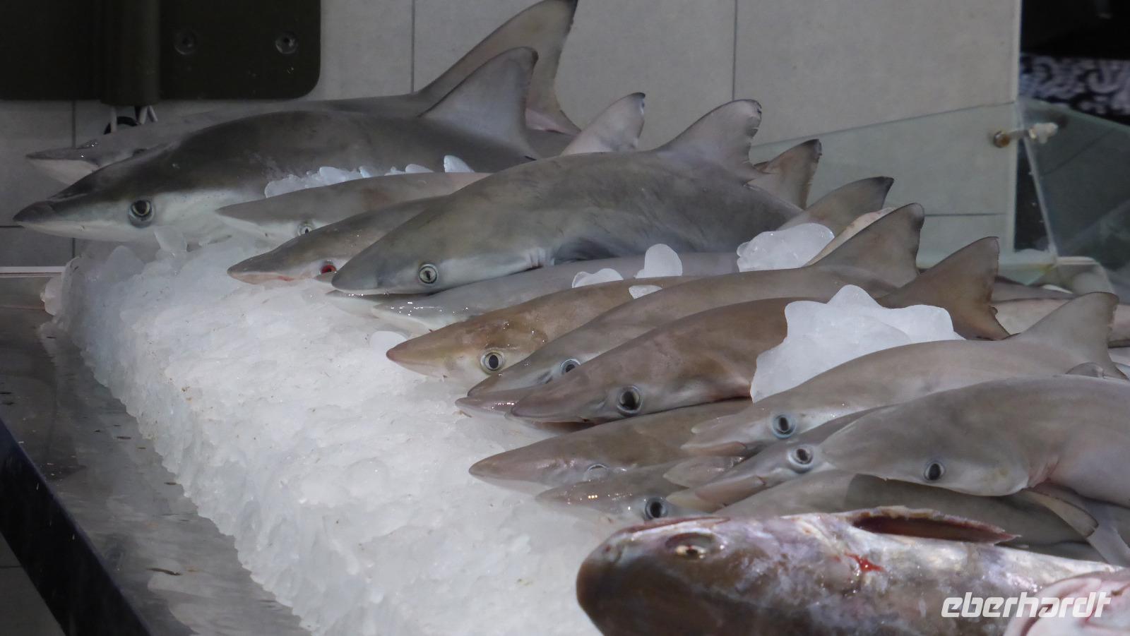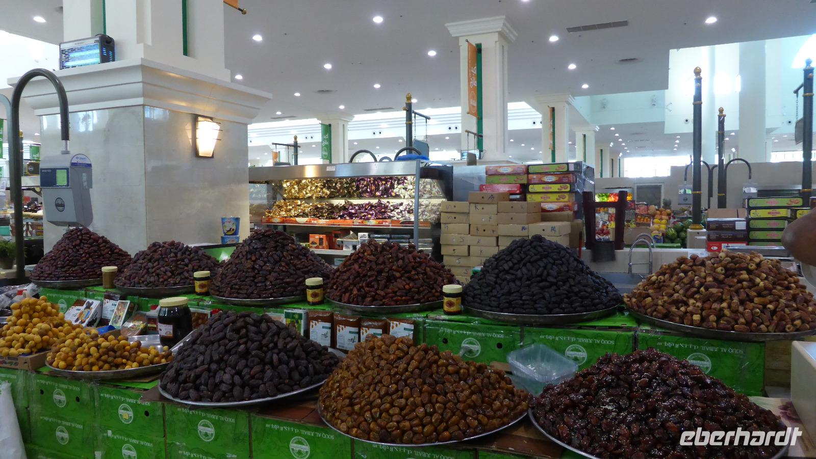 Anschließend besuchen wir die zwei größten Märkte der Stadt: zunächst den Souk al Jubail, das erst dieses Jahr eröffnete moderne Marktgebäude für Fisch, Fleisch, Obst und Gemüse. Am Eingang werden wir vom Marktleiter persönlich begrüßt und erhalten aus erster Hand nähere Informationen zum Markt, darunter den Aktionskreis für die Fischversteigerung. Am nächsten Tag lese ich in der Zeitung, dass kurz nach uns der Shaikh von Sharjah höchstpersönlich den Markt besuchte, was erklärt, weshalb der Marktleiter am Eingang wartete. Im Markt selbst beeindrucken die Sauberkeit und die große Vielfalt des Fischangebotes. Wie wir vom Chef erfahren, Fisch zu staatlich kontrollierten Preisen und nicht nur aus der Region, sondern auch aus Europa und Indien importiert.