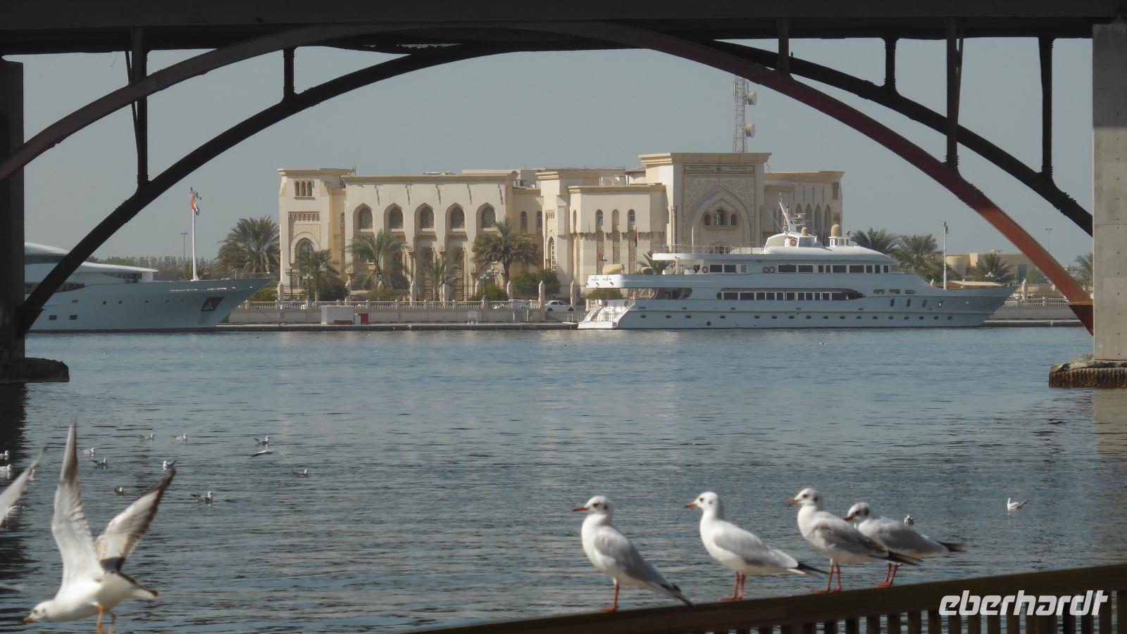 Am Küstenort Khor Fakkan sehen wir eine etwa 5 Kilometer lange Bucht mit schönem Strandpark, dem Oceanic Hotel sowie dem Containerhafen. Damit ist Sharjah das einzige Emirat, welches sowohl am Indischen Ozean als auch am Arabischen Golf einen Hafen betreibt. Und auch dem Herrscher von Sharjah gefällt diese Meeresbucht und so hat er sich auf einem Hügel einen kleinen Palast bauen lassen.