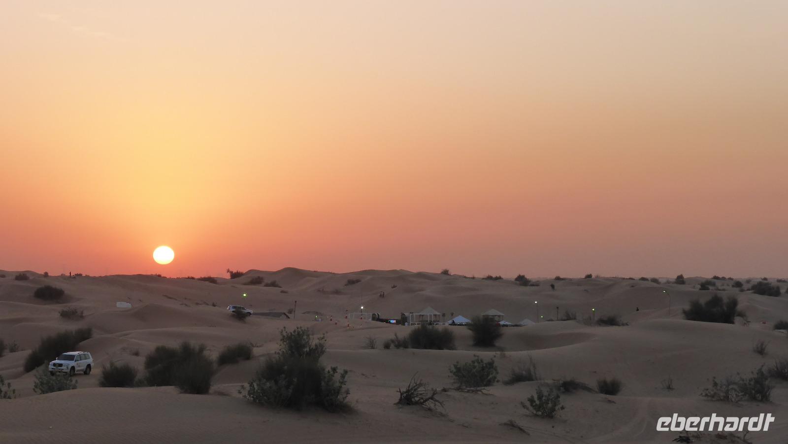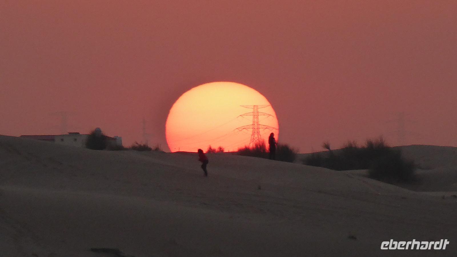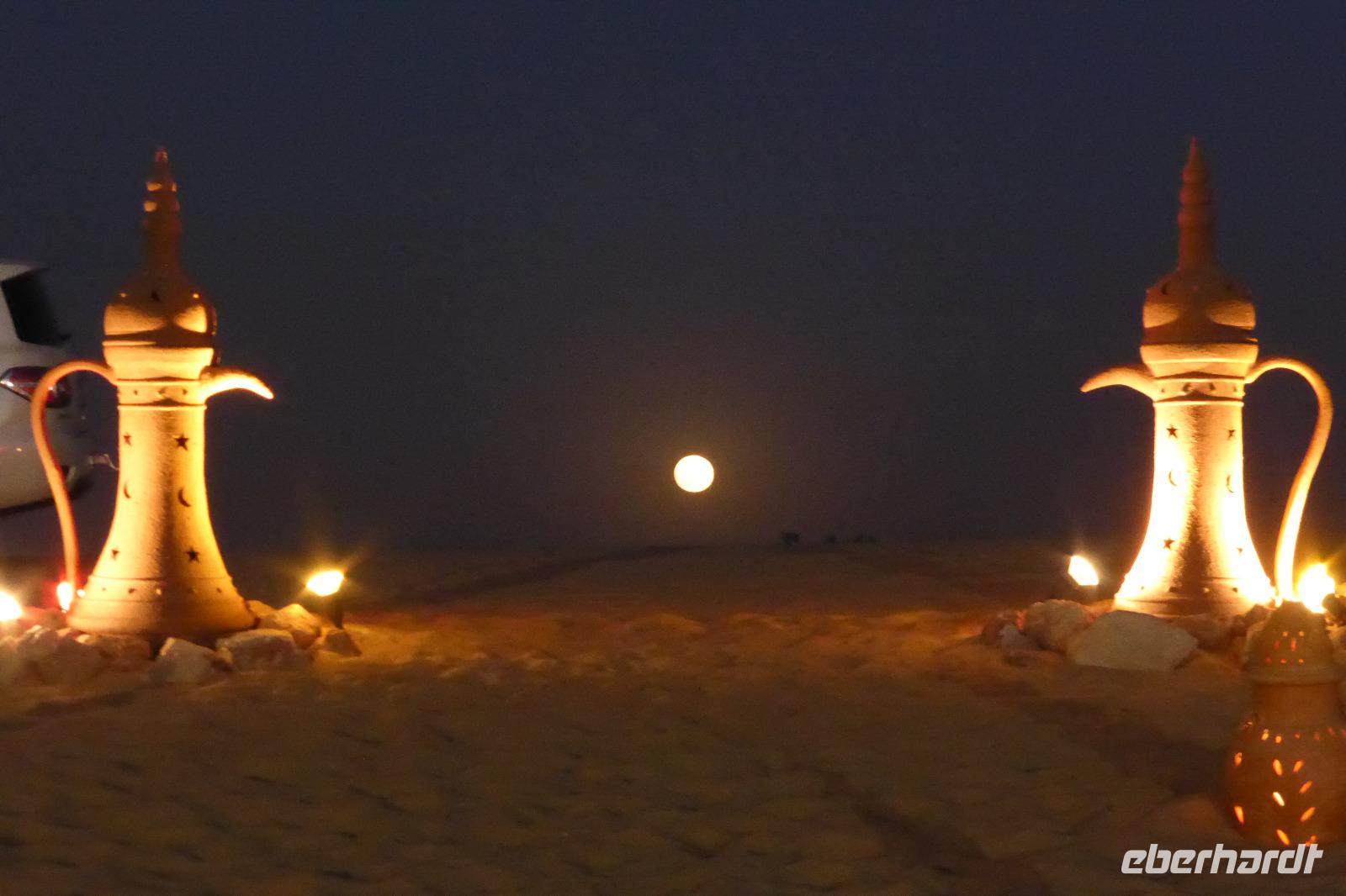 Alle Fahrer müssen eine spezielle Ausbildung vorweisen, welche es ihnen erlaubt, mit Gästen in die Wüste zu fahren......das beruhigt irgendwie. Hassans Jeep fährt mit einigen Gästen und mir aus bekannten Gründen eine andere Route zum Wüstencamp. Die anderen zwei Wagen schütteln ihre Gäste beim sogenannten Dune Bashing, also dem Auf und Ab über die Sanddünen, gut durch. Ich nenne diese kleine Wüste den großen Sandspielkasten Dubais, in dem besonders am Wochenende auch die Einheimischen ihren Spaß haben. Mit einigen Stopps im feinkörnigen rotbraunen Wüstensand fahren wir in den Sonnenuntergang. Für den optimalen Sonnenuntergangsblick wird eine passende Düne ausgesucht...und es lohnt sich zu erleben, wie der rote Feuerball am Horizont untergeht. Kurz darauf geht im Osten der Supermond auf, der Erde extrem nah wie die nächsten 36 Jahre nicht mehr. Ich würde sagen, einfach ein schöner Vollmond, der Rest ist etwas viel Medienrummel.