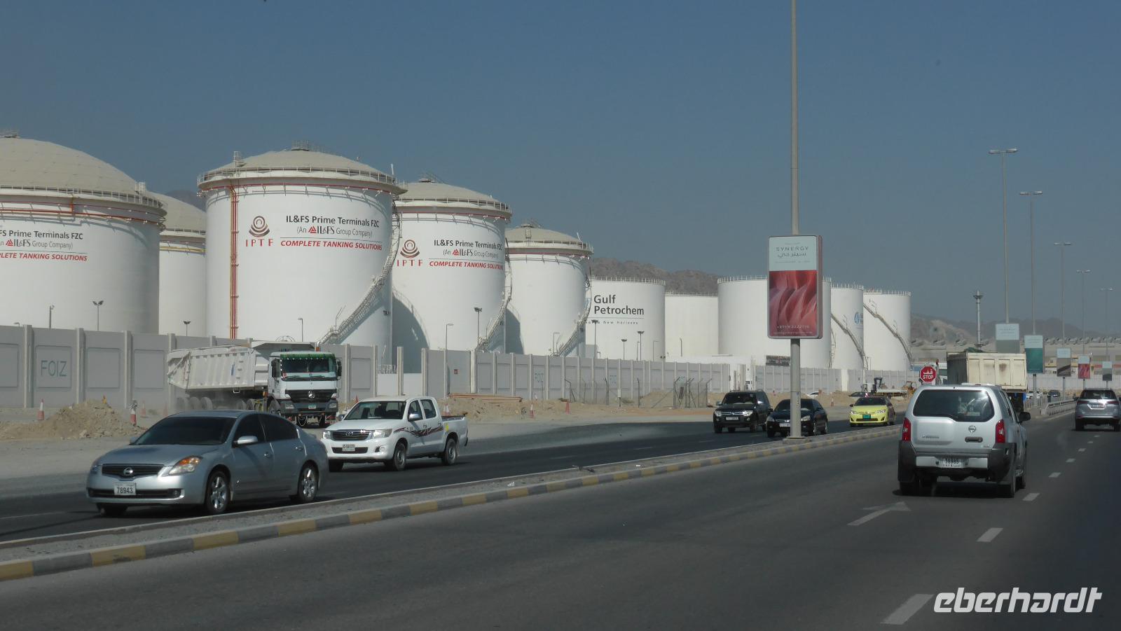 Wir durchqueren die kahle Bergwelt des Hajar-Gebirges (Felsengebirge) mit seinem dunklen Gestein und dann erreichen wir keine zwei Stunden nach Dubai schließlich Fujairah-Stadt am Indischen Ozean. Bei einem Fotostopp an der neuen Freitagsmoschee und der Fahrt durch die Hauptgeschäftsstraße bekommen wir einen Eindruck von dieser Stadt. An der Küstenstraße können wir uns ganz aus der Nähe ein Bild davon machen, dass Fujairah, ohne selbst Erdölvorkommen zu haben, ganz erheblich am Ölgeschäft mitverdient. Denn hier sind eine ganze Reihe von gewaltigen Erdöltanks zu sehen, gefüllt mit Erdöl, welches aus Abu Dhabi durch eine Pipeline an der Ostküste gepumpt, gelagert und dann schließlich auf Tanker verladen wird. Auf diese Weise müssen die Tanker nicht durch das Nadelöhr "Straße von Hormuz" hinein in den Arabischen/Persischen Golf und sparen damit viel Zeit und Geld.
