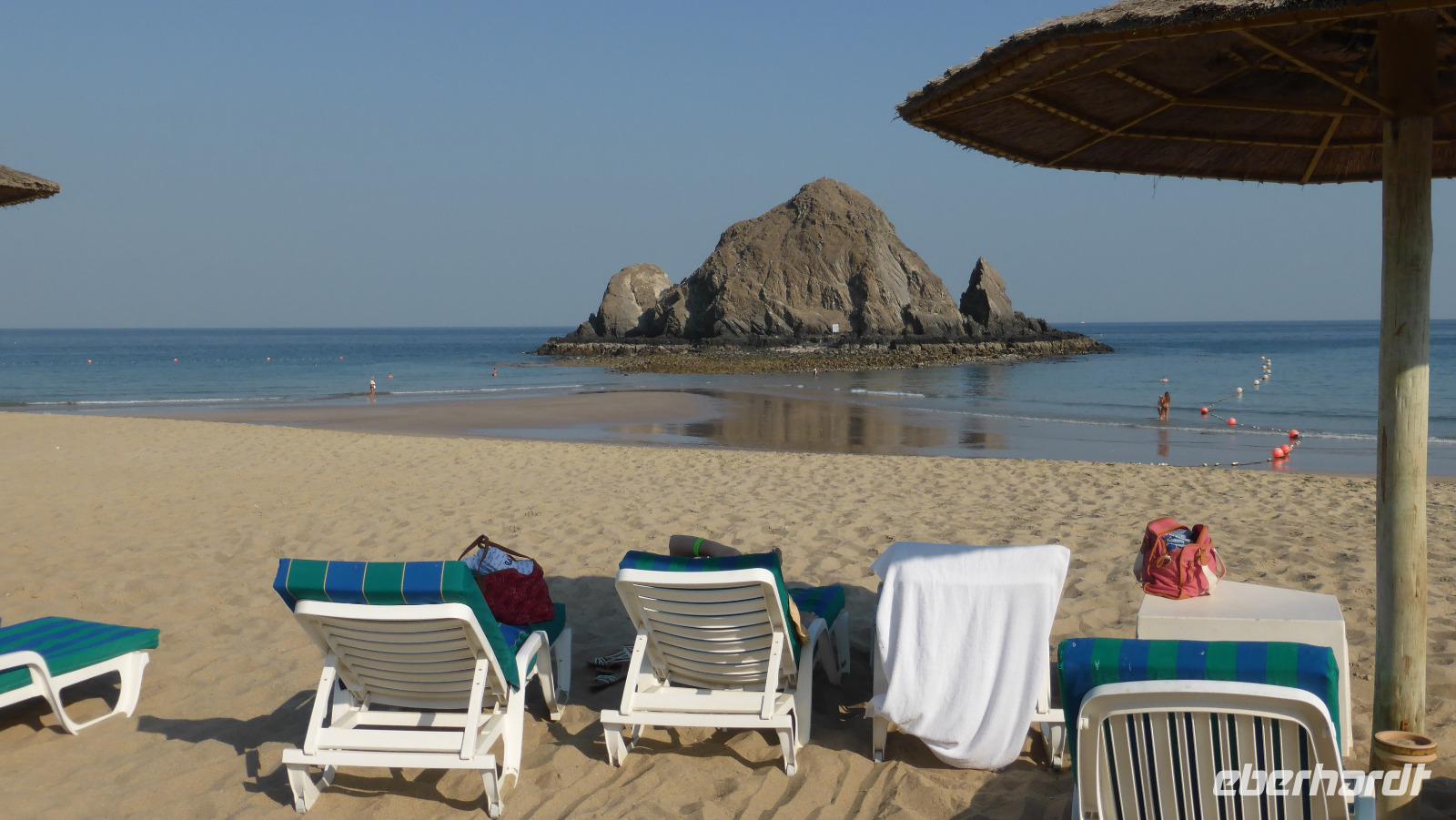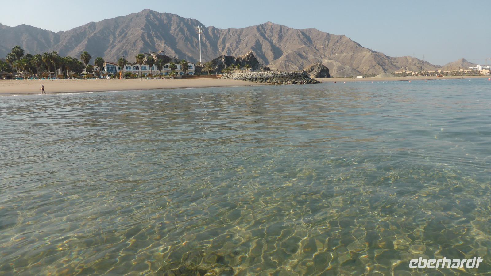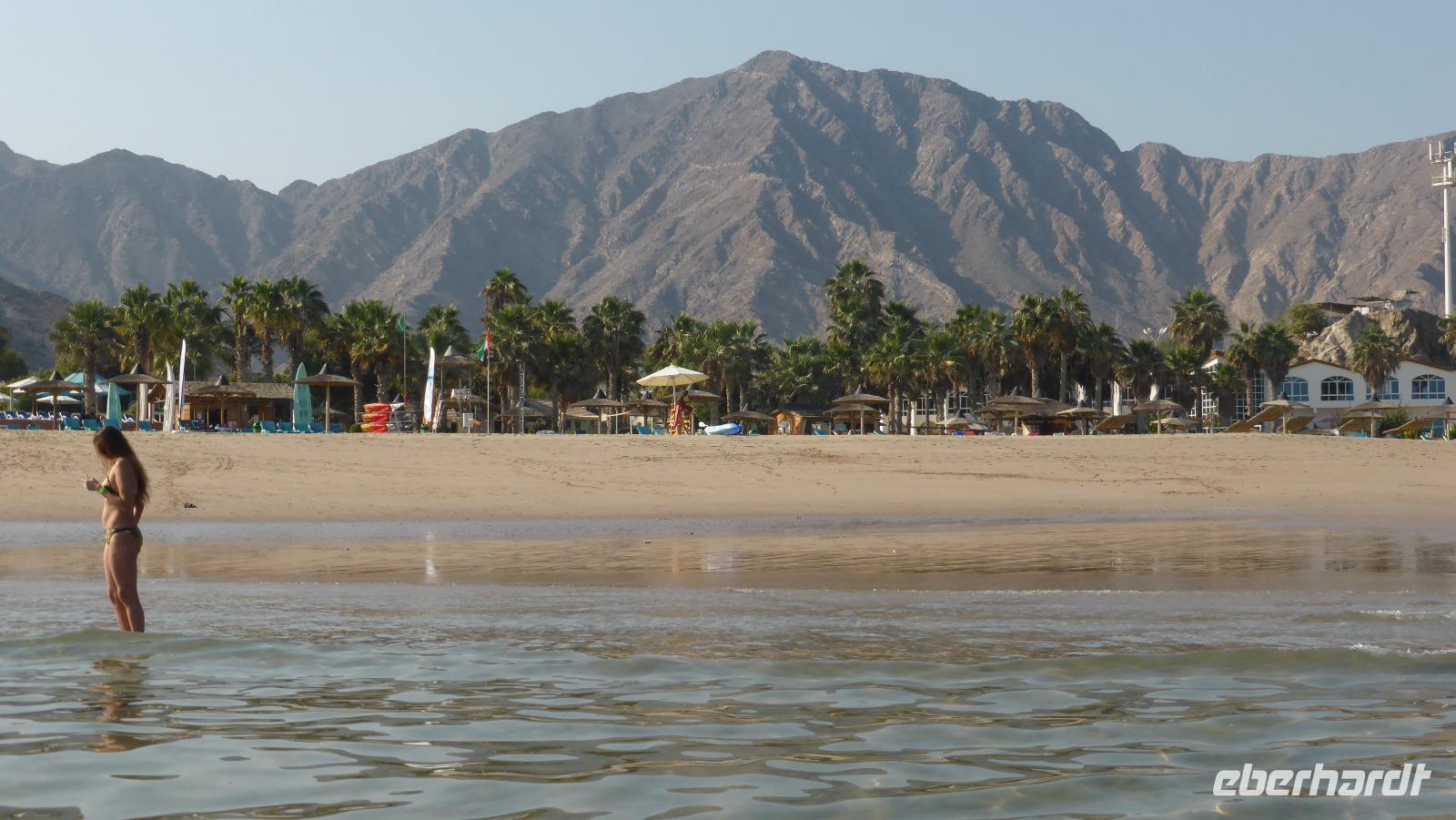 Den Nachmittag verbringen wir im Sandy Beach Hotel und genießen seine Annehmlichkeiten. Der Golf von Oman als Teil des Indischen Ozeans lädt mit klarem Wasser und Wassertemperaturen von ca. 26 Grad zum Baden ein. Nur ist heute der Weg zum Wasser etwas weiter als sonst, denn „Supermond" heißt auch „super" Gezeiten, in unserem Fall extreme Ebbe in einem Maße wie es die Einheimischen auch kaum kennen.