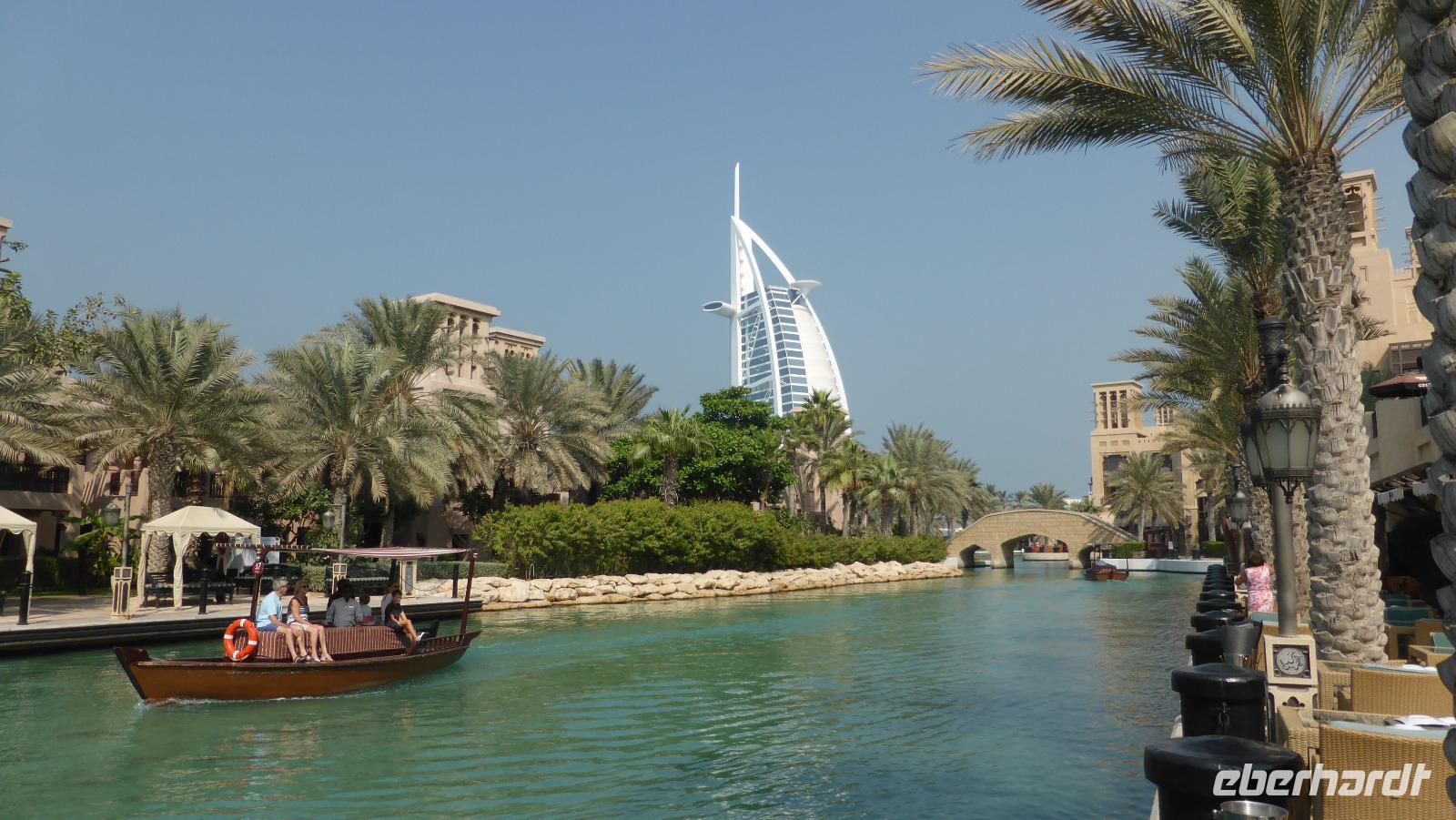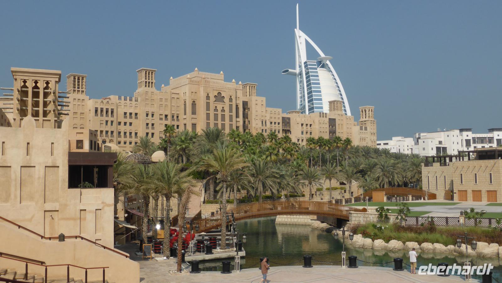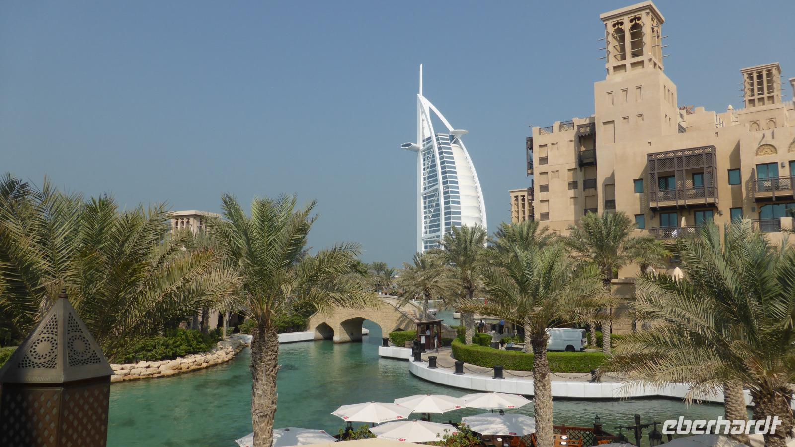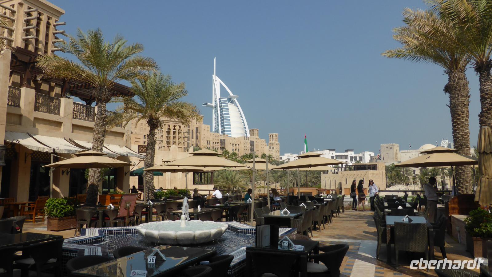 Für das Luxushotel entsprechend schick gekleidet brechen wir auf und halten vor dem Essen noch am sogenannten Madinat Souk (Madinat Jumairah). Das Viertel wurde 2004 eröffnet und liegt in unmittelbarer Nähe des Burj Al Arab. Es ist im traditionellen „Windturmstil" errichtet und besteht aus Lagunen, Hotels, Restaurants und Geschäften. Von hier ergeben sich tolle Ausblicke auf das Burj Al Arab was uns zu vielen Fotos verleidet.