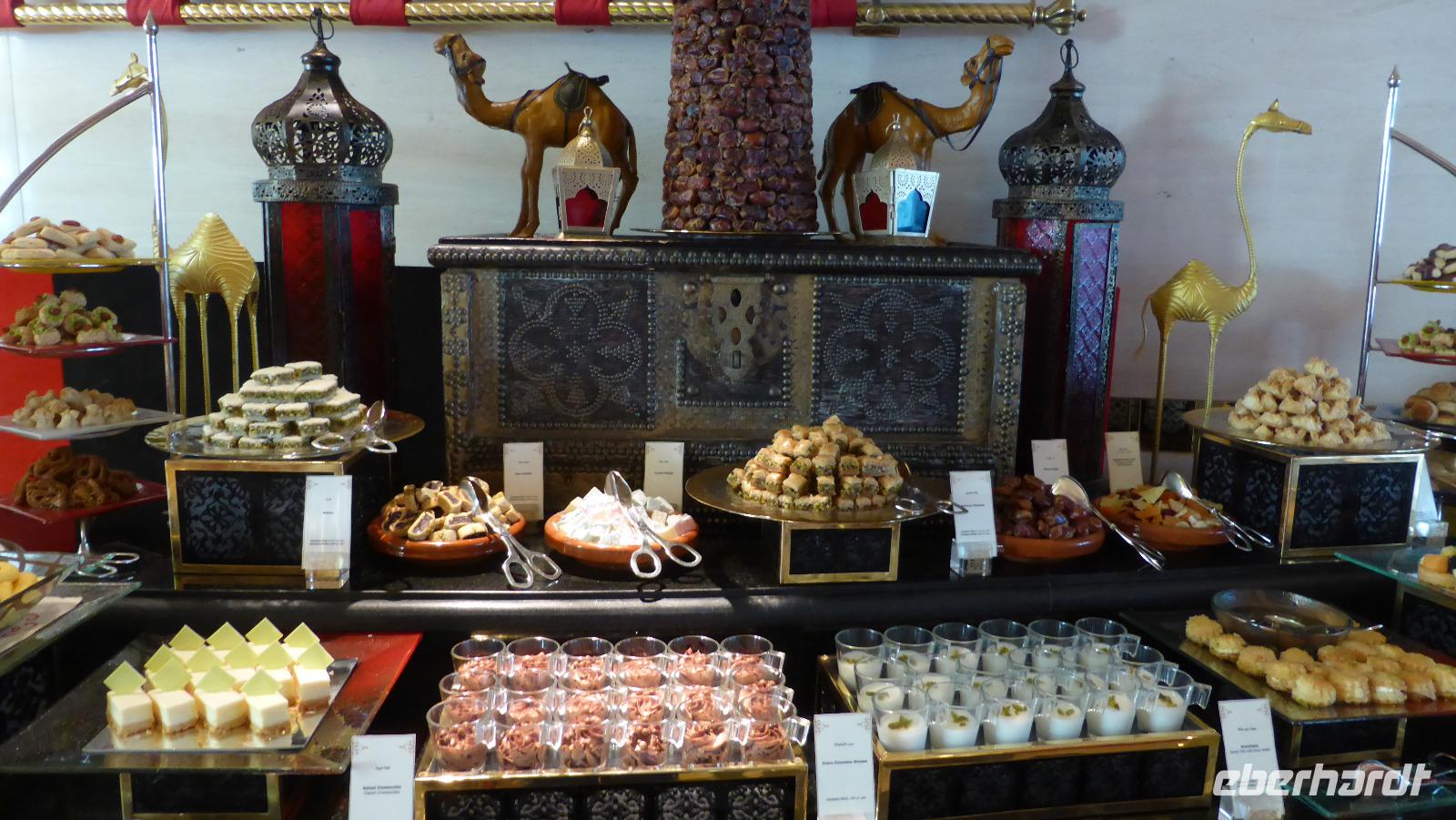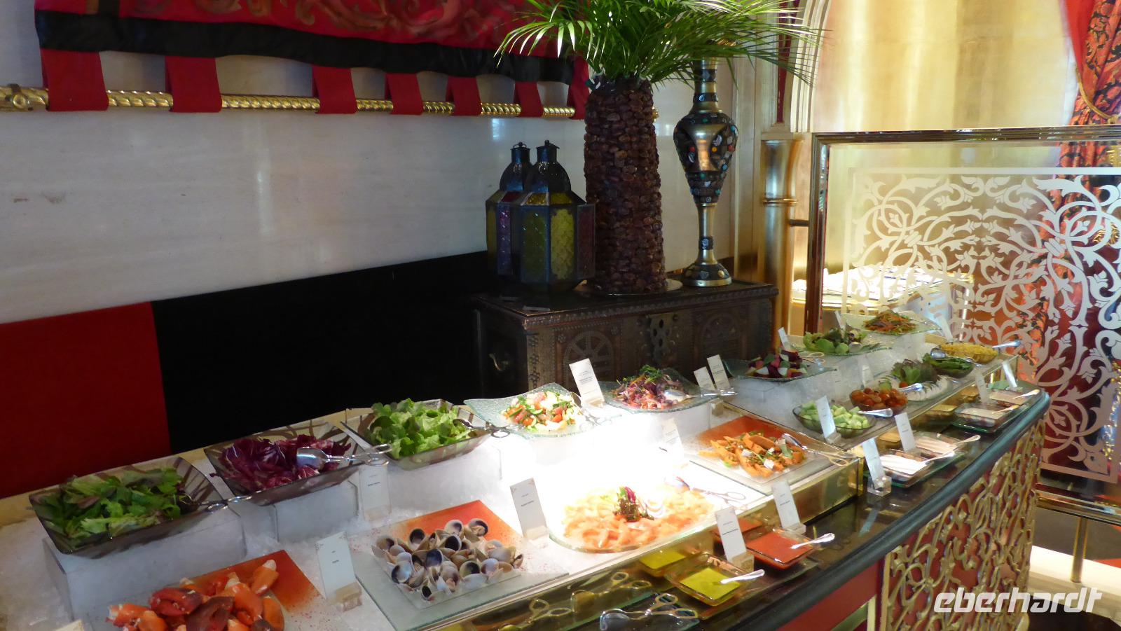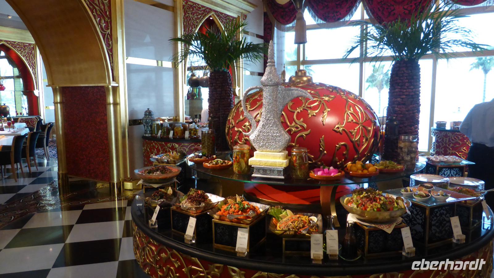 Dann fahren wir am Burj Al Arab vor. Den Weg bis zum Restaurant „Al Iwan" im ersten Obergeschoss ziehen wir bewusst in die Länge, denn schließlich vollen wir uns ja auch umsehen und Fotos machen. Der Restaurantname „Al Iwan" geht übrigens auf einen Begriff in der islamischen Architektur zurück und bezeichnet da das Eingangsportal einer Moschee. Aber das ist uns im Moment erstmal egal, wir inspizieren jetzt das Buffet und müssen erkennen, dass man hier Prioritäten setzen muss, alles durchprobieren wird hier nicht funktionieren...