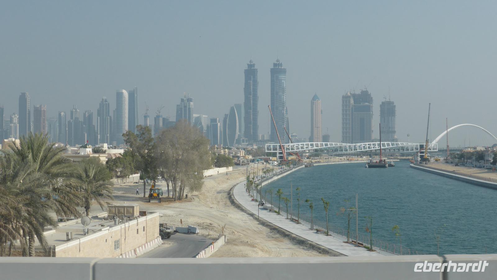 - Überquerung des neuen Kanals, des Dubai Creek Canals. Der Kanal wurde erst vor wenigen Tagen eröffnet, verlängert den natürlichen Creek bis zum Jumairah beach und macht Dubai so zur Insel.