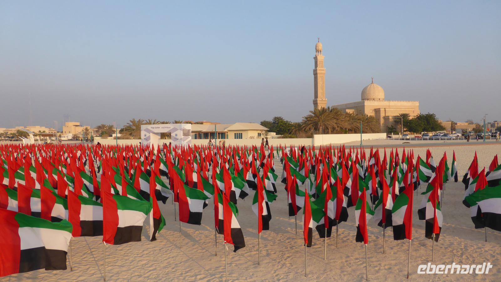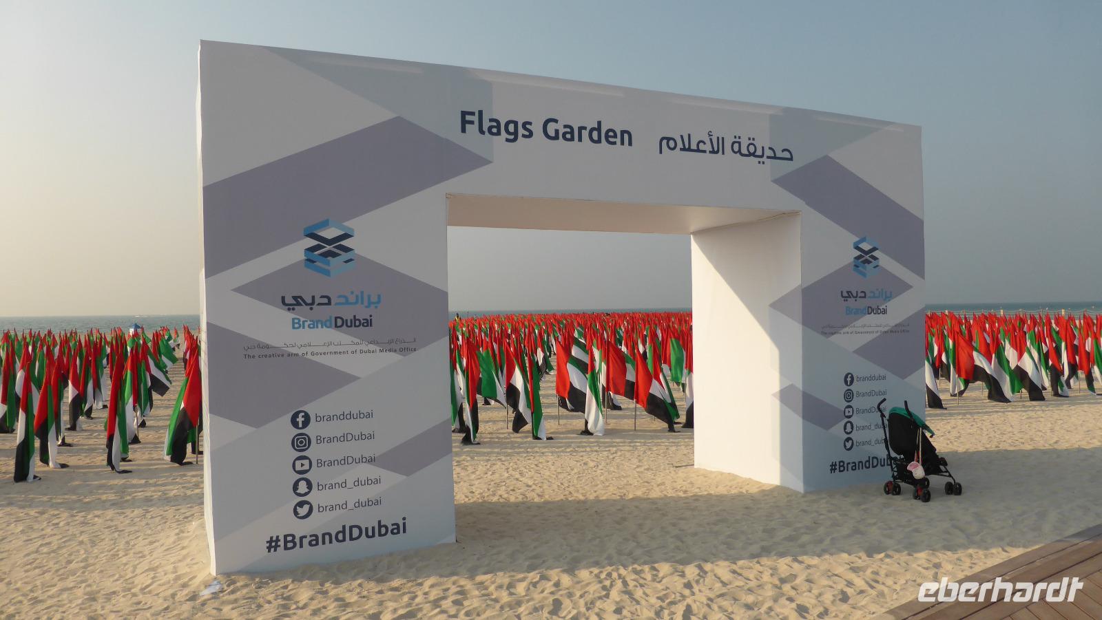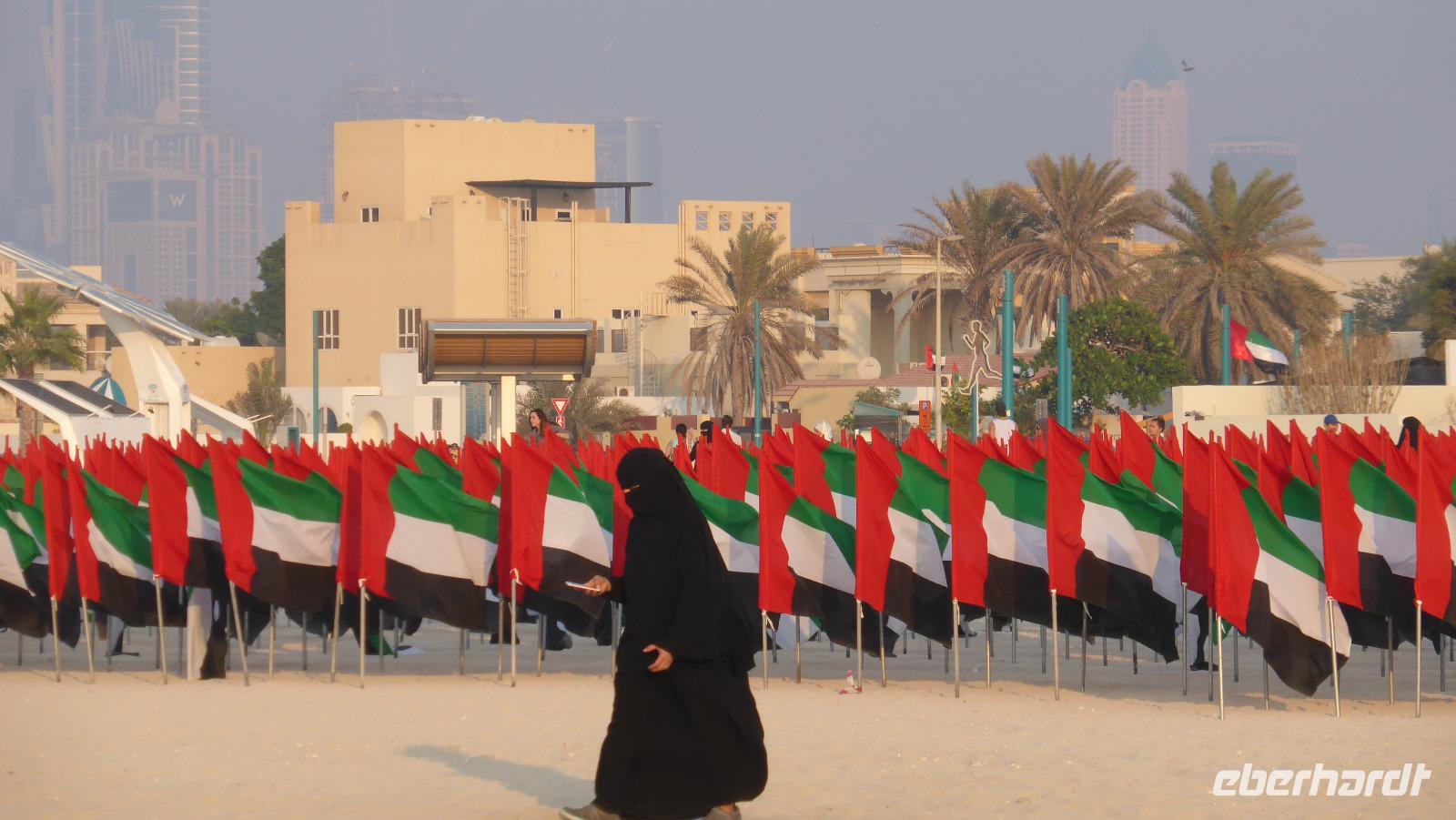 Die Rückfahrt zum Hotel führt uns am Kite Beach vorbei. An diesem Strandabschnitt Dubais wurden kürzlich zum „Flaggen Tag" über 4000 Nationalflaggen so aufgestellt, dass sie von oben betrachtet die Fläche der Vereinigten Arabischen Emirate darstellen.