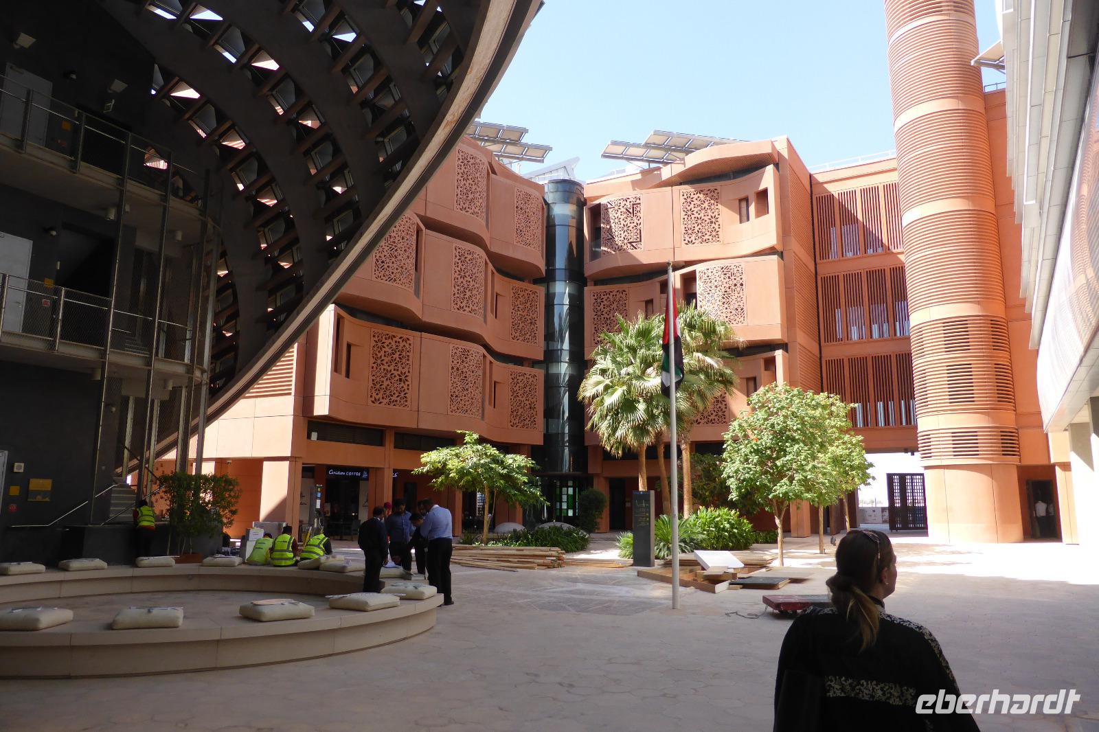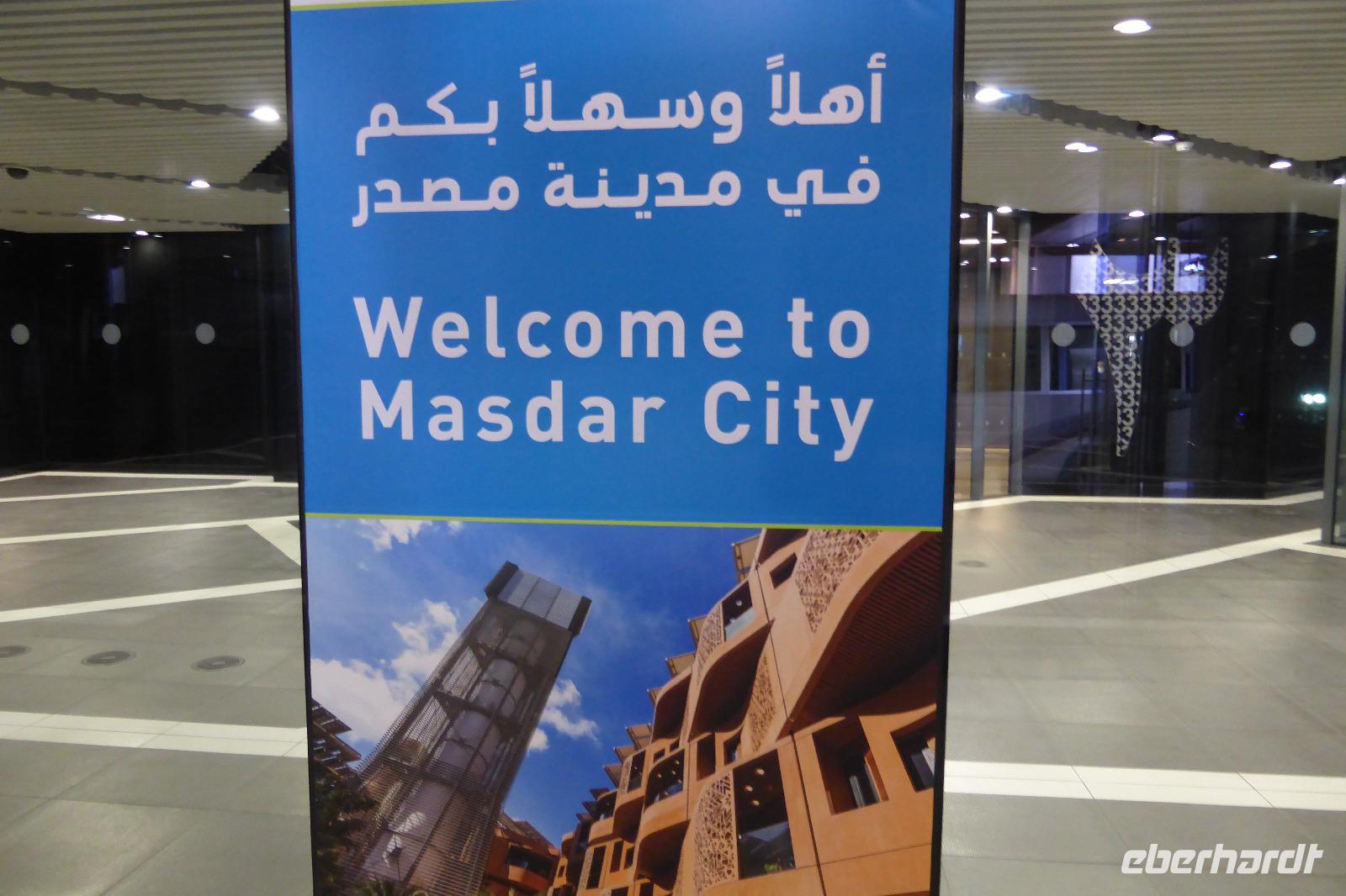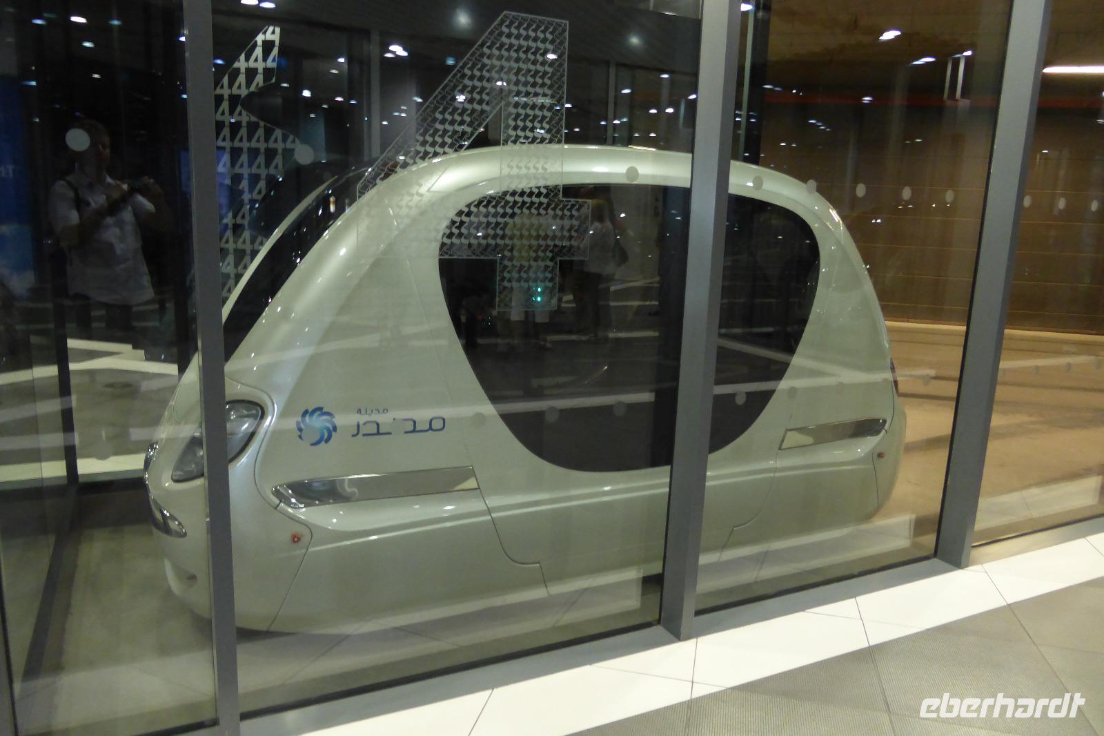 Am Vormittag verlassen wir durch den „Hochhauscanyon" der Shaikh Zayed Road Dubai und fahren Richtung Abu Dhabi. Erstes Ziel ist die Ökostadt Masdar City. Als erste CO2-freie Stadt der Welt konzipiert, wollen wir uns selbst ein Bild von dem Projekt machen. Zunächst braucht es Zeit, bis der richtige Zugang gefunden ist, denn was gestern noch bei Anjas Besuch galt, ist heute schon wieder ganz anders und wird morgen wahrscheinlich wieder geändert, irgendwie typisch für Abu Dhabi. Nach dem Baubeginn 2008 sollte Masdar City ursprünglich 2016 fertig sein. An einem Modell erkennen wir, wie winzig die fertiggestellte Kernstadt (ich schätze so 300m mal 400m) im Verhältnis zur Gesamtstadt (sechs Quadratkilometer) ist. Obwohl die Kernstadt überschaubare Ausmaße hat, fällt aufgrund der verwinkelten Gassen, die Orientierung doch etwas schwer. Die engen Gassen schützen vor der heißen Sonne - eine nicht wirklich neue Erfindung. Und ein Windturm sorgt für Belüftung. Diese einfachen Mittel, Windturm und enge schattige Gassen erzeugen ein angenehmes Klima, wie wir selbst deutlich spüren können. Als CO2-freie Stadt ist Masdar natürlich autofrei. Den Personentransport sollen sogenannte PRT´s (Personal Rapid Transit) übernehmen. Diese 4-sitzigen Fahrzeuge werden nach dem Prinzip einer Magnetbahn betrieben. Da es für dieses Beförderungssystem schon eine Teststrecke gibt, können wir selbst diese etwas futuristisch aussehenden Fahrzeuge benutzen.