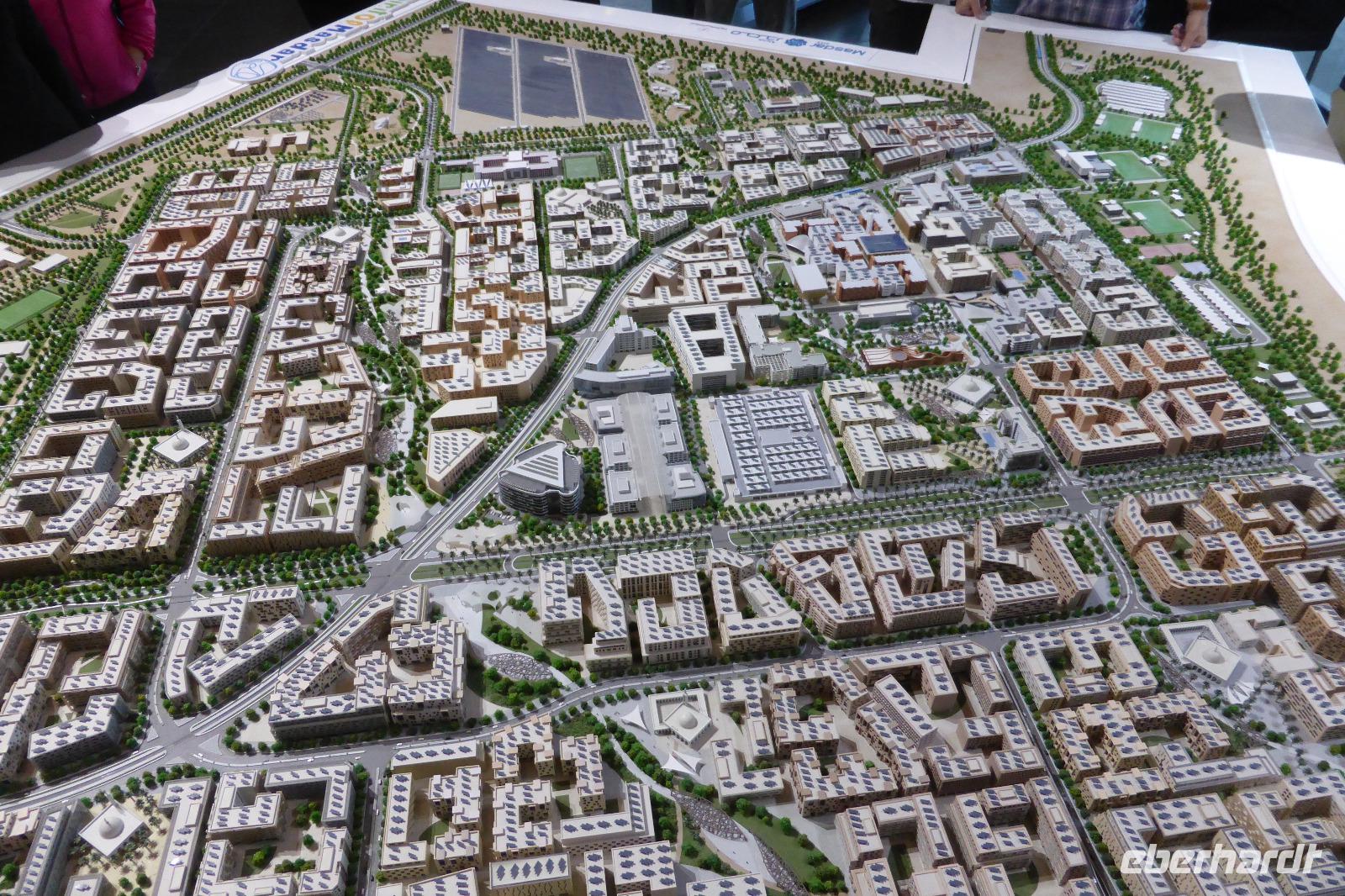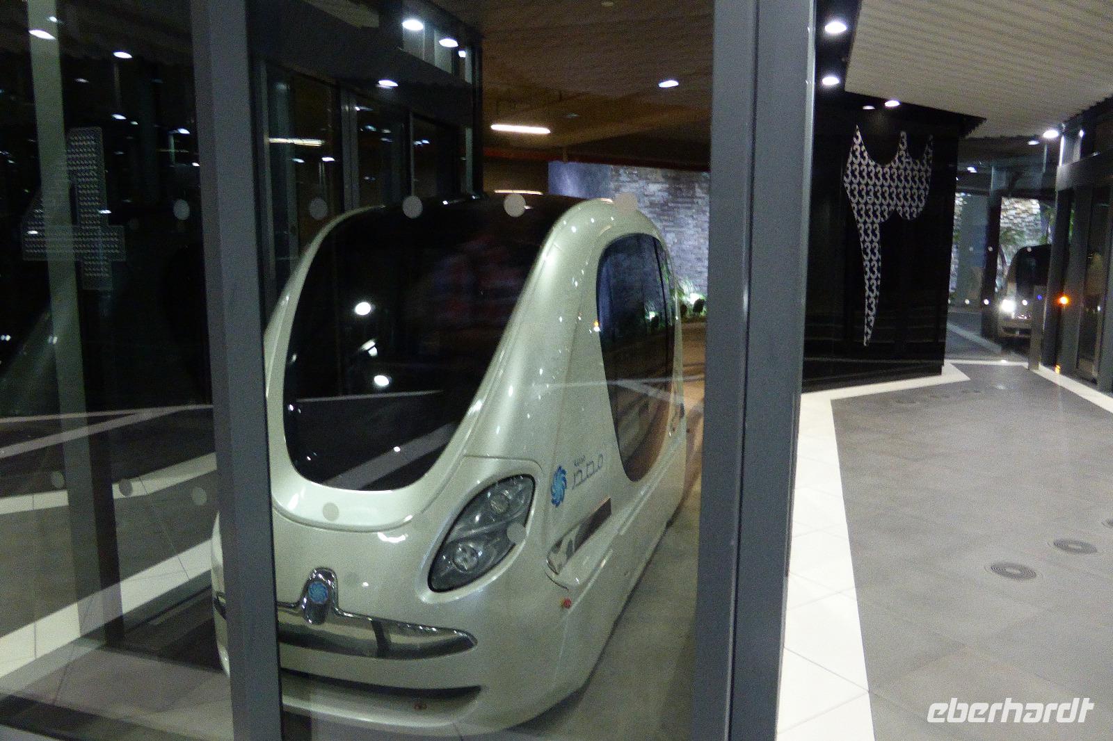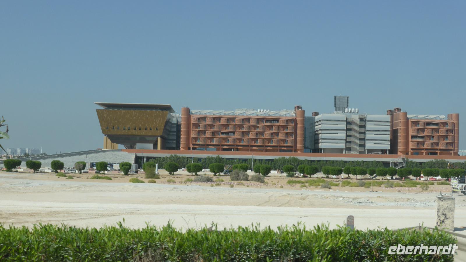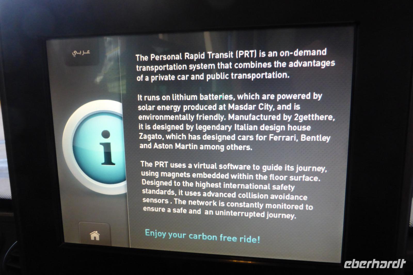 Am Vormittag verlassen wir durch den „Hochhauscanyon" der Shaikh Zayed Road Dubai und fahren Richtung Abu Dhabi. Erstes Ziel ist die Ökostadt Masdar City. Als erste CO2-freie Stadt der Welt konzipiert, wollen wir uns selbst ein Bild von dem Projekt machen. Zunächst braucht es Zeit, bis der richtige Zugang gefunden ist, denn was gestern noch bei Anjas Besuch galt, ist heute schon wieder ganz anders und wird morgen wahrscheinlich wieder geändert, irgendwie typisch für Abu Dhabi. Nach dem Baubeginn 2008 sollte Masdar City ursprünglich 2016 fertig sein. An einem Modell erkennen wir, wie winzig die fertiggestellte Kernstadt (ich schätze so 300m mal 400m) im Verhältnis zur Gesamtstadt (sechs Quadratkilometer) ist. Obwohl die Kernstadt überschaubare Ausmaße hat, fällt aufgrund der verwinkelten Gassen, die Orientierung doch etwas schwer. Die engen Gassen schützen vor der heißen Sonne - eine nicht wirklich neue Erfindung. Und ein Windturm sorgt für Belüftung. Diese einfachen Mittel, Windturm und enge schattige Gassen erzeugen ein angenehmes Klima, wie wir selbst deutlich spüren können. Als CO2-freie Stadt ist Masdar natürlich autofrei. Den Personentransport sollen sogenannte PRT´s (Personal Rapid Transit) übernehmen. Diese 4-sitzigen Fahrzeuge werden nach dem Prinzip einer Magnetbahn betrieben. Da es für dieses Beförderungssystem schon eine Teststrecke gibt, können wir selbst diese etwas futuristisch aussehenden Fahrzeuge benutzen.