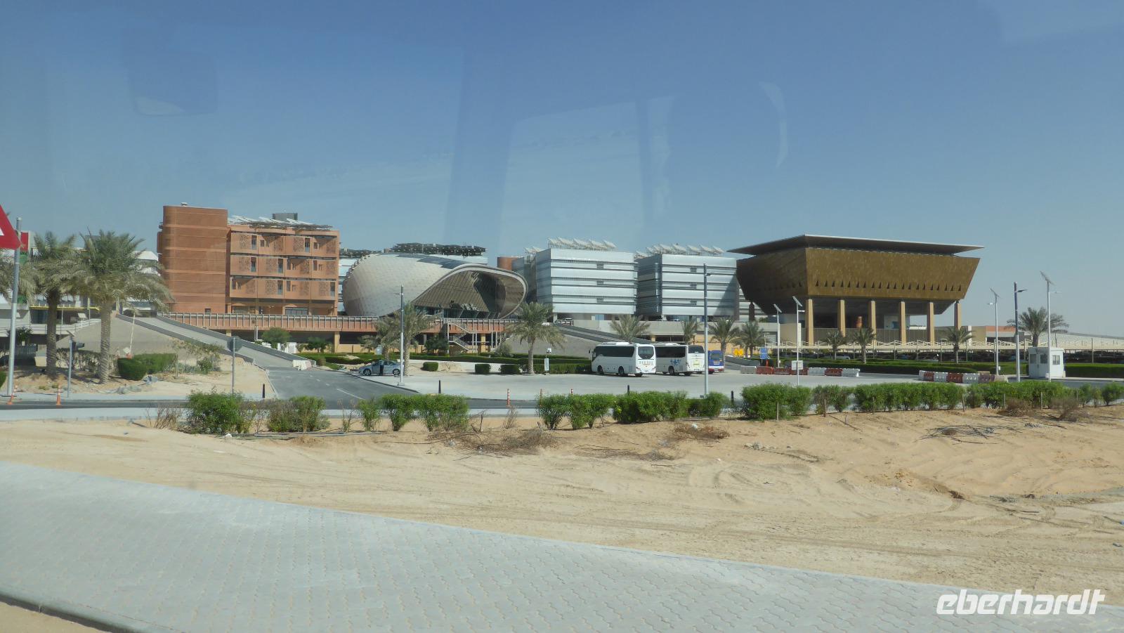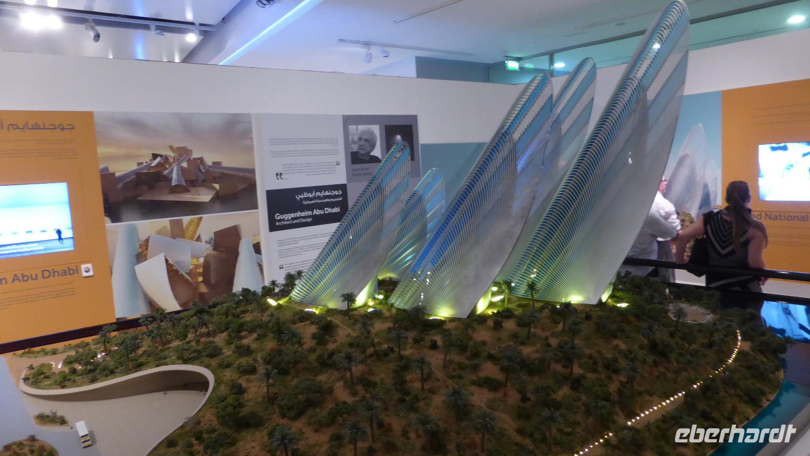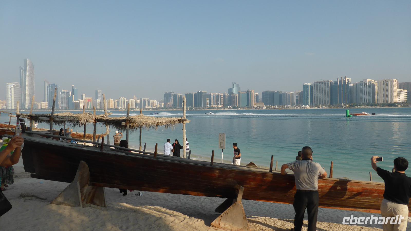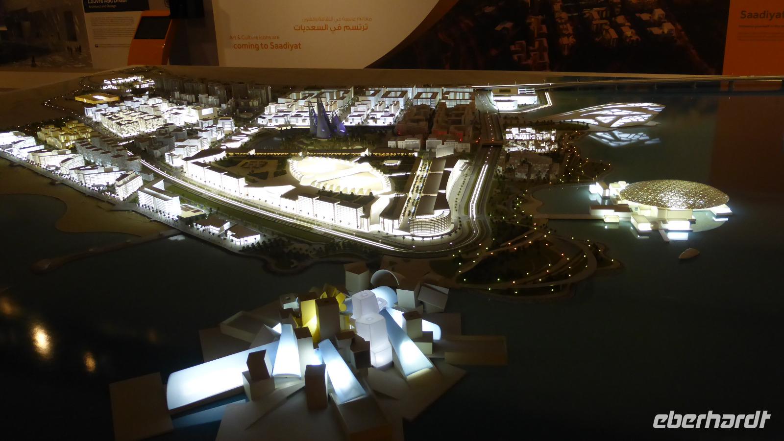 Wir kehren noch einmal auf die Wellenbrecherinsel zurück und halten am Heritage Village. Von hier aus bietet sich uns eine gute Aussicht auf die Skyline von Abu Dhabi und auf ein gerade stattfindendes Schnellbootrennen.Entlang an der mit Wolkenkratzern flankierten Corniche Abu Dhabis gelangen wir zur Nachbarinsel Saadiyat Island. Auf der "Insel der Glückseligkeit" soll mit den Ölmilliarden des Emirates Abu Dhabi eine große Kulturvisionen verwirklicht werden: Stararchitekten wie Frank Gerry, Jean Nouvel und Sir Norman Forster lassen ein neues Kulturzentrum von Weltrang entstehen. Die wichtigsten Projekte sind der Louvre Abu Dhabi, das Nationalmuseum in Form eines Falkennestes und ein Guggenheim Museum. In der Ausstellung „Manarat Saadiyat" besichtigen wir das vielleicht größte Kulturprojekt unserer Zeit.