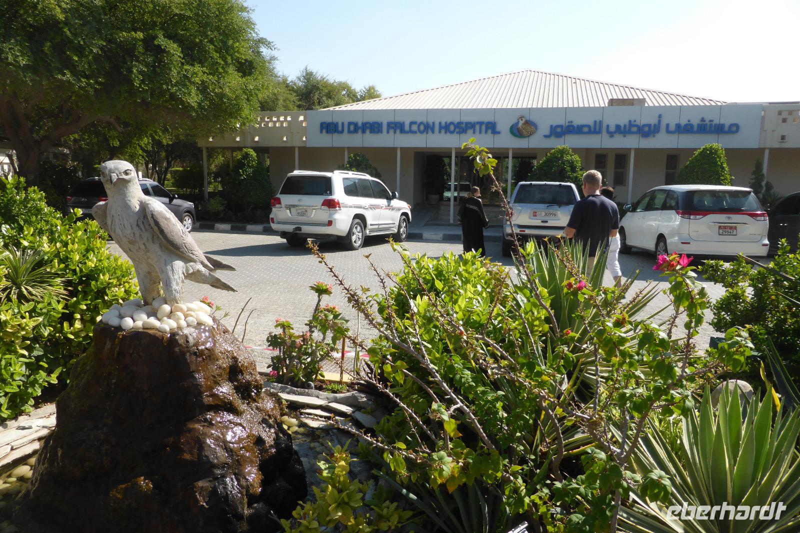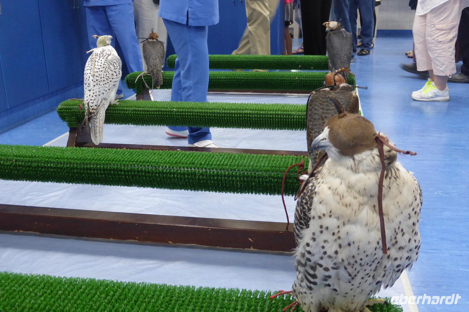 Unsere nächsten beiden Stationen gehören zu meinen großen Favoriten bei dieser Reise. Beginnen wir zunächst mit der Falkenklinik Abu Dhabi. Hier erfahren wir vieles über die drei geläufigen Falkenarten, über Fluggeschwindigkeiten, Reisepässe für Falken, die Gewöhnung an den Menschen u. a. m. In der weltgrößten Einrichtung dieser Art zeigen uns Mitarbeiter wie Schnäbel geschliffen und Krallen geschnitten werden. Jeder hat die Möglichkeit, mal einen Falken selbst auf dem Arm zu tragen. Wir sehen auch die vielen Auszeichnungen für Frau Dr. Müller, der Klinikleiterin. Und im Mauserkäfig erhalten wir weitere interessante Informationen.