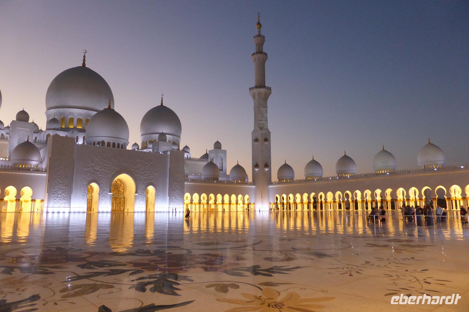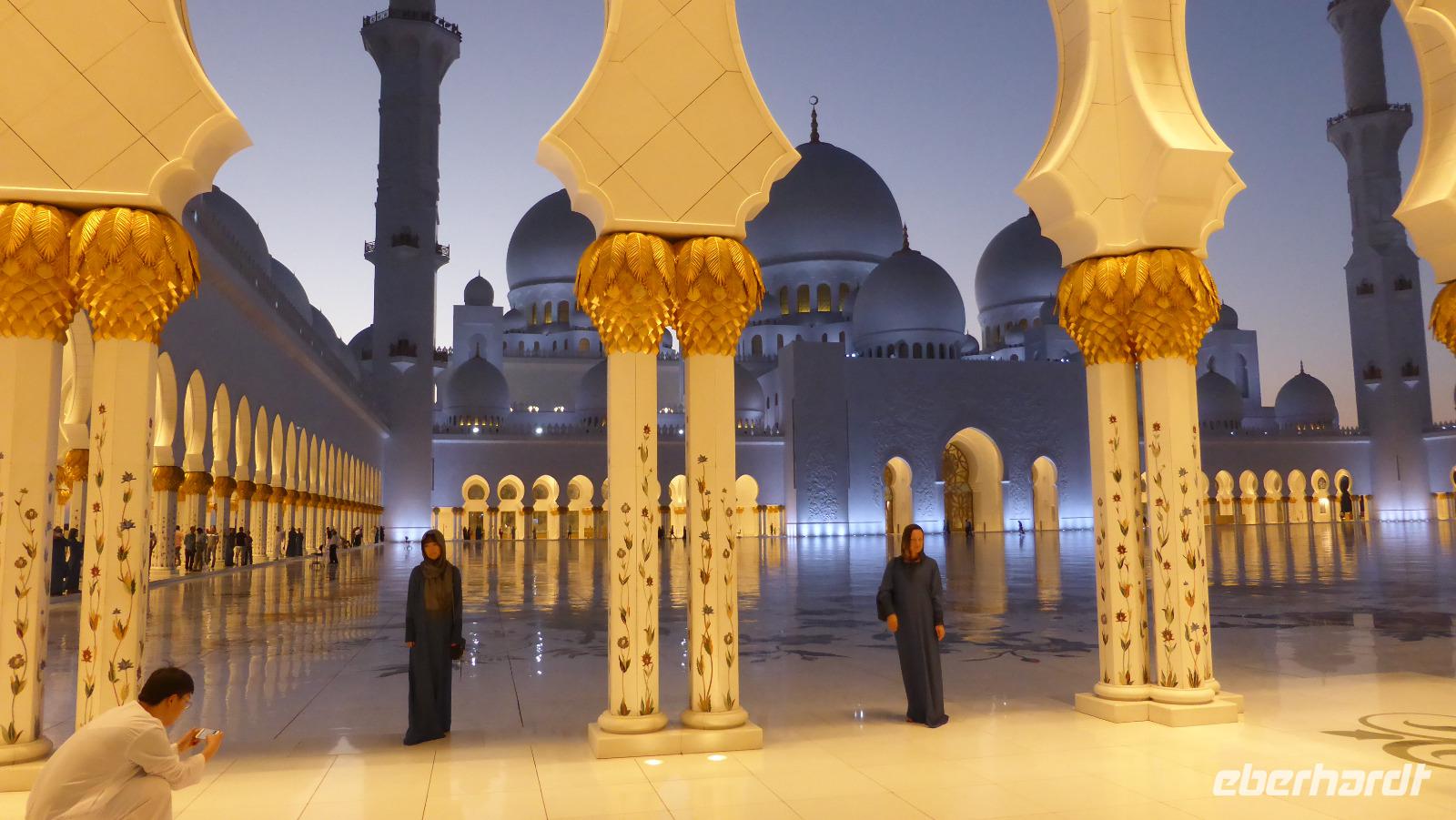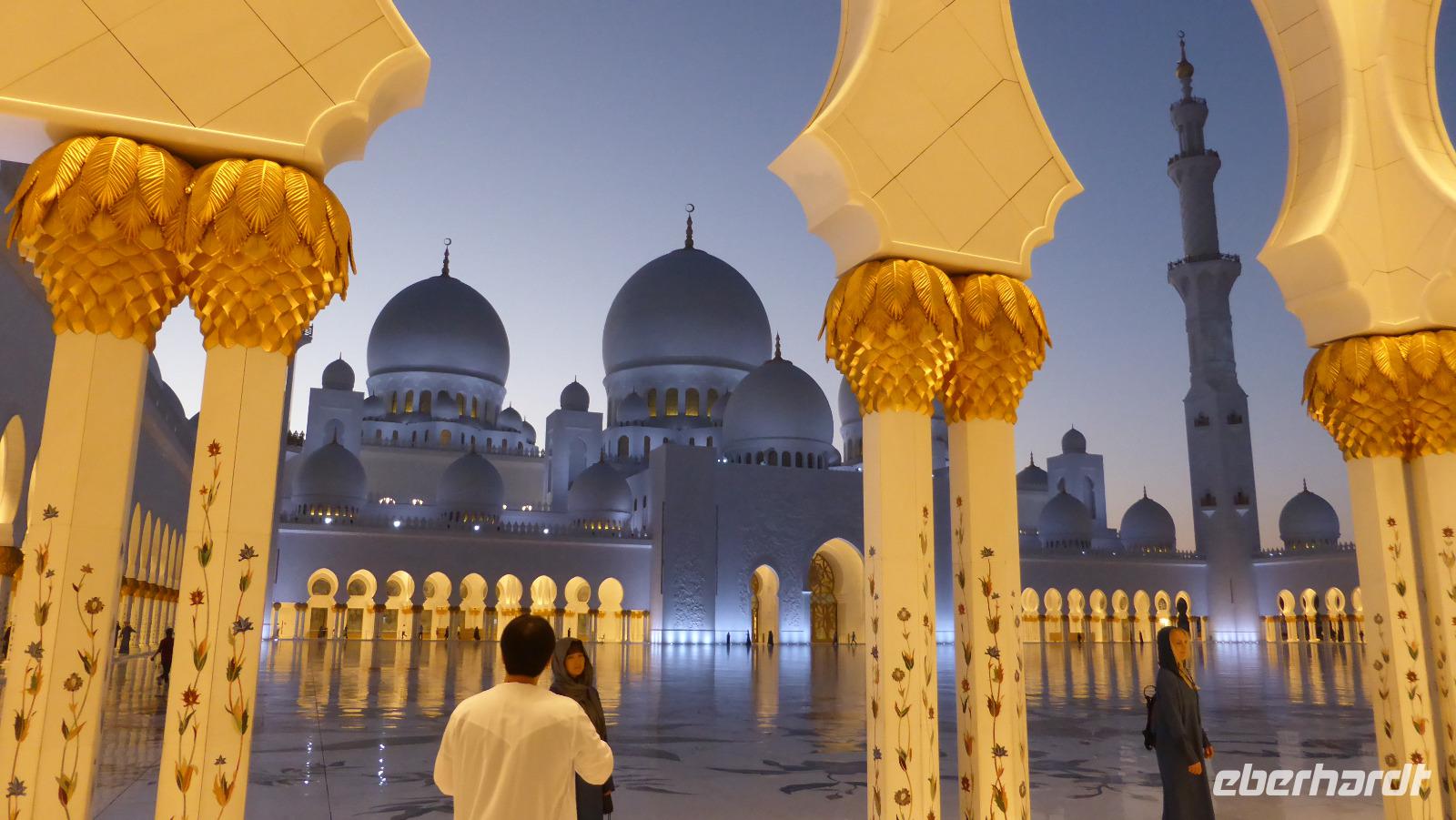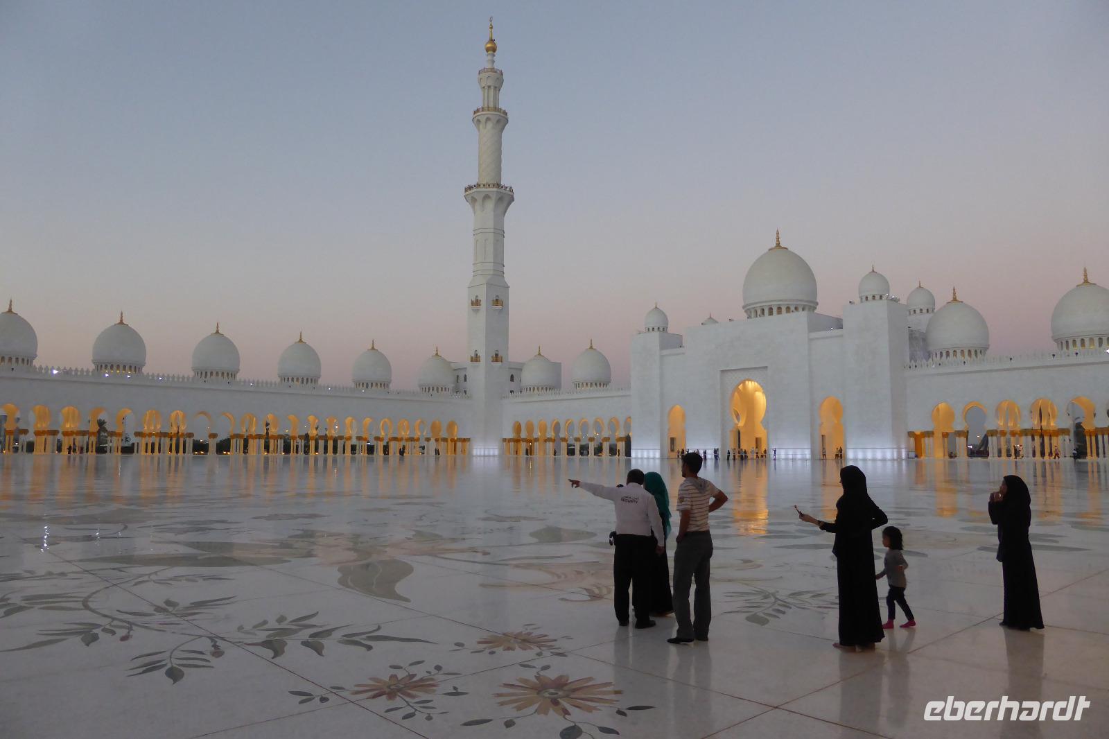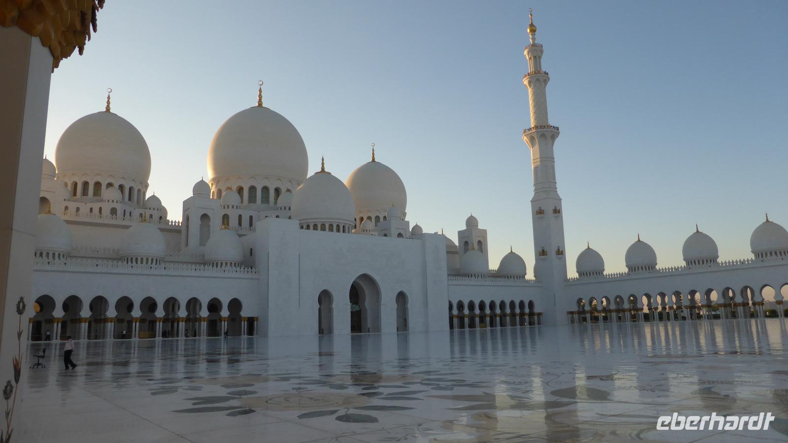Abwechslungsreicher kann der Tag nicht sein. Nach Ökostadt und Falkenklinik beenden wir das heutige Besichtigungsprogramm mit dem Besuch der Großen Shaikh Zayed Moschee, einer der weltgrößten Moscheen - hier haben etwa 40.000 Muslime Platz! Die Freitagsmoschee hat 82 Kuppeln in sieben verschiedenen Größen und strahlt im weißen Marmor, weshalb ich sie auch den „Taj Mahal Arabiens" nenne. Wir bleiben hier bis nach Sonnenuntergang. Gerade die Zeit der Abenddämmerung erzeugt eine ganz besondere Stimmung. Hinzu kommt noch der Ruf des Muezin zum Abendgebet. Nicht weit von der Moschee, gegenüber auf der Festlandseite, liegt unser Hotel, das Traders by Shangri La. Auf der Hotelterrasse wird für uns ein Tisch in toller Lage arrangiert, so dass wir uns bei milden Abendtemperaturen das Buffet schmecken lassen können