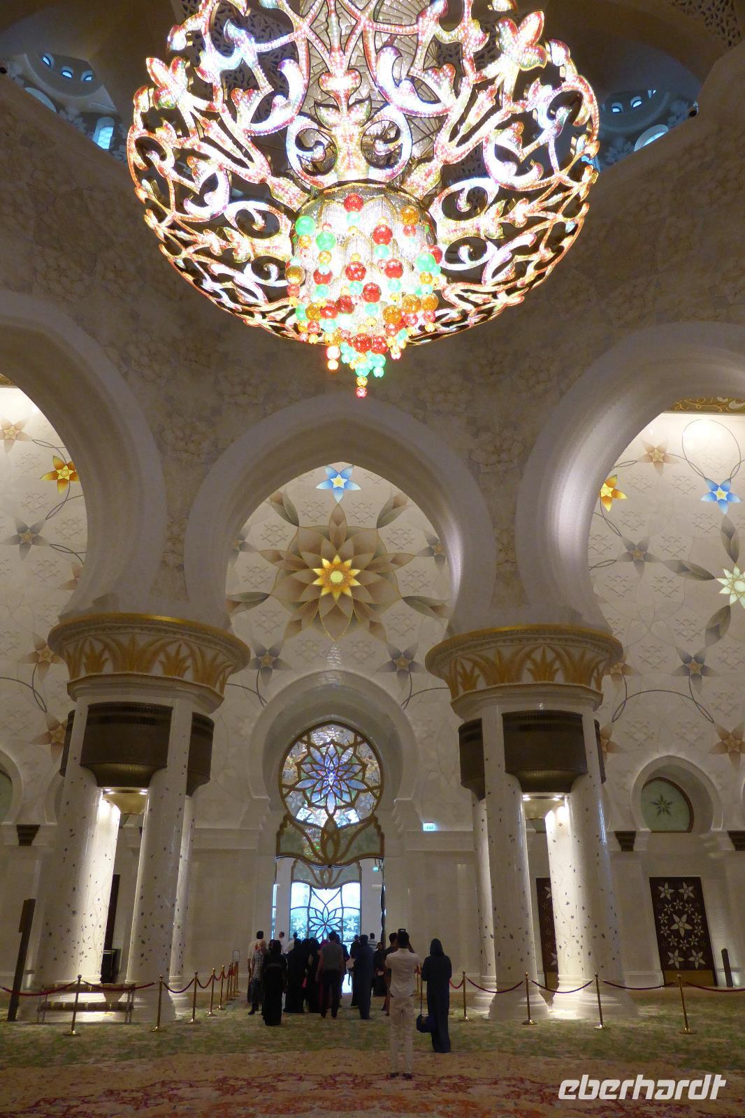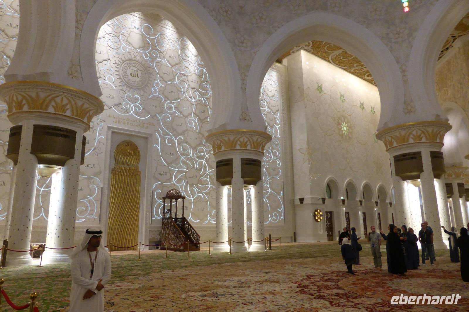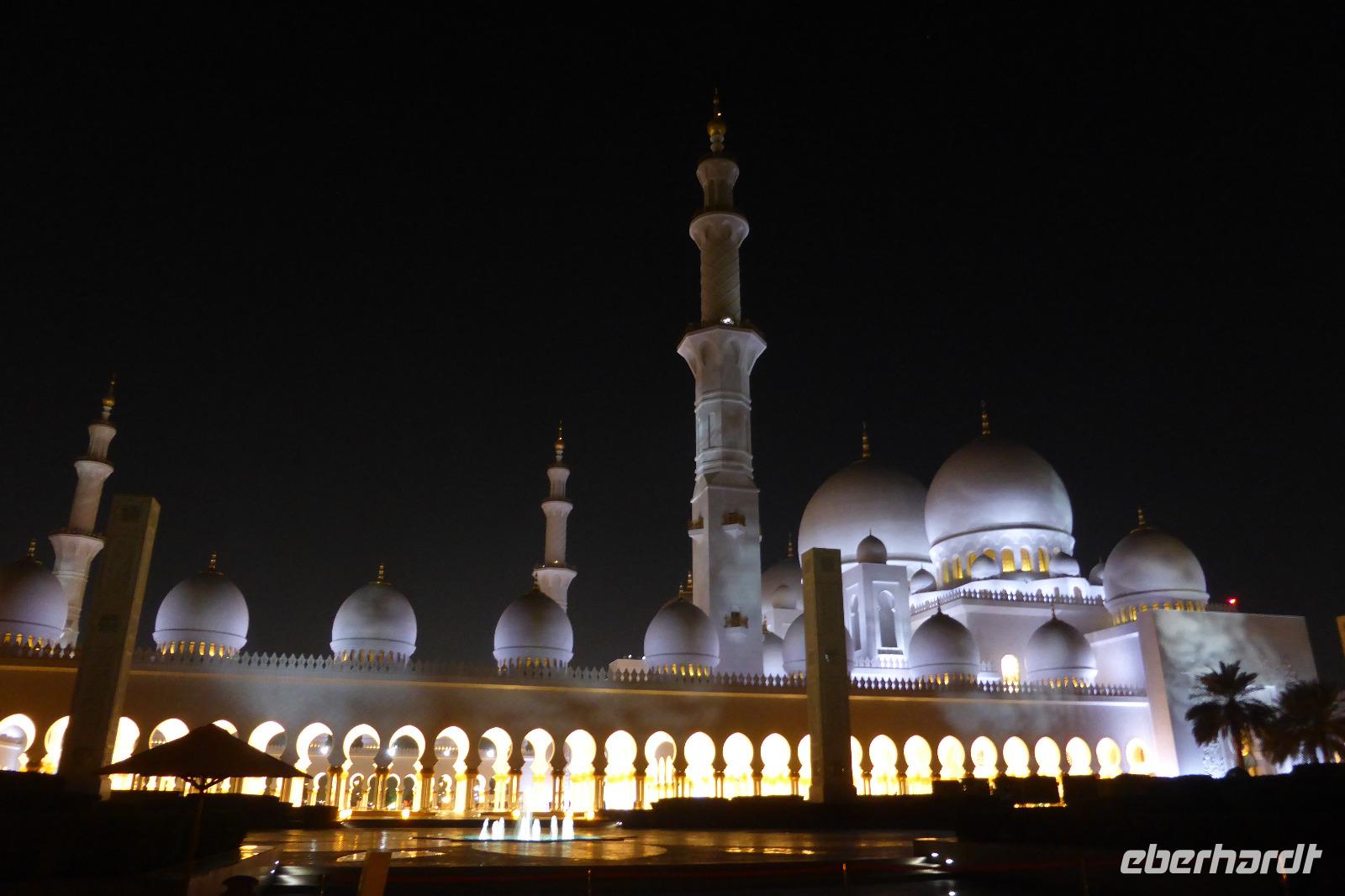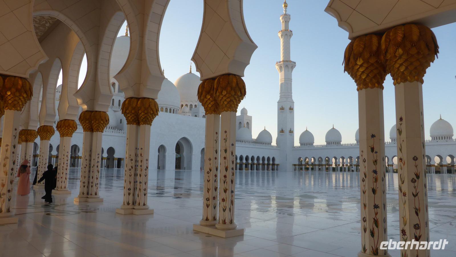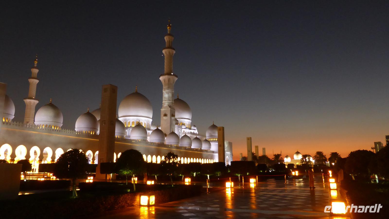 Abwechslungsreicher kann der Tag nicht sein. Nach Ökostadt und Falkenklinik beenden wir das heutige Besichtigungsprogramm mit dem Besuch der Großen Shaikh Zayed Moschee, einer der weltgrößten Moscheen - hier haben etwa 40.000 Muslime Platz! Die Freitagsmoschee hat 82 Kuppeln in sieben verschiedenen Größen und strahlt im weißen Marmor, weshalb ich sie auch den „Taj Mahal Arabiens" nenne. Wir bleiben hier bis nach Sonnenuntergang. Gerade die Zeit der Abenddämmerung erzeugt eine ganz besondere Stimmung. Hinzu kommt noch der Ruf des Muezin zum Abendgebet. Nicht weit von der Moschee, gegenüber auf der Festlandseite, liegt unser Hotel, das Traders by Shangri La. Auf der Hotelterrasse wird für uns ein Tisch in toller Lage arrangiert, so dass wir uns bei milden Abendtemperaturen das Buffet schmecken lassen können
