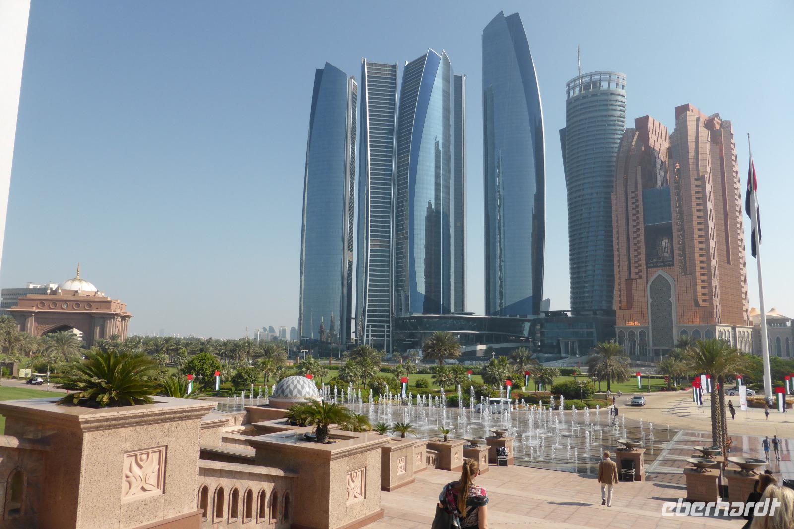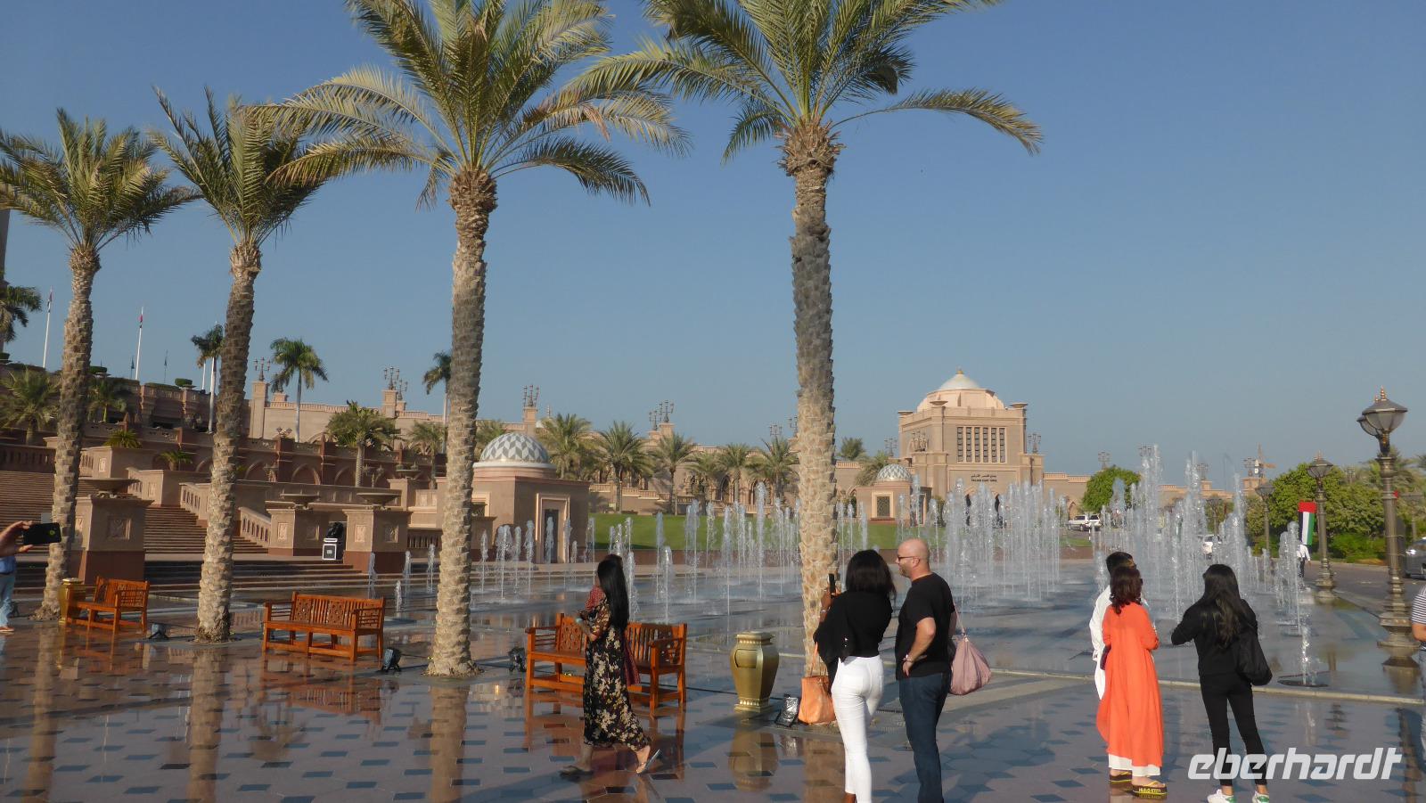 Bis zur Teestunde im Emirates Palace lernen wir bei einer Stadtrundfahrt Abu Dhabi näher kennen (schiefer Turm, Villenviertel Bateen, Wellenbrecherinsel) und Anja berichtet dabei vom Leben in den Emiraten wie z. B. den unterschiedlichen Lebensbedingungen von Gastarbeitern und Einheimischen. In der Marina Mall auf der Wellenbrecherinsel legen wir und Ismael eine Pause ein und mit einem Skylift fahren wir zum Aussichtscafe.Für 14.00 Uhr haben wir eine Reservierung im Palasthotel Emirates Palace. Es ist Luxushotel, Tagungsstätte der Herrscher des Golfkooperationsrates und heute Gastgeber für unseren Nachmittagstee Im luxuriösen Ambiente genießen wir reichlich Kaffee, Tee, Herzhaftes und Süßes. Auch nutzen wir die Zeit, um im Außenbereich zu fotografieren und einen Gruppenbild zu machen.