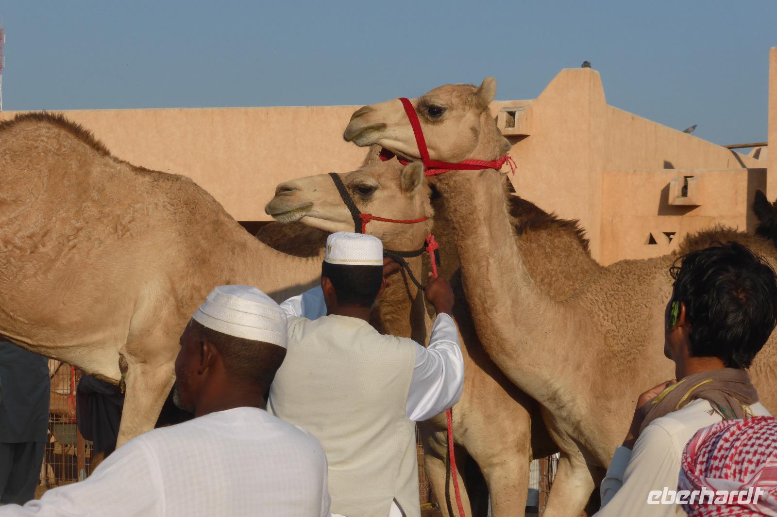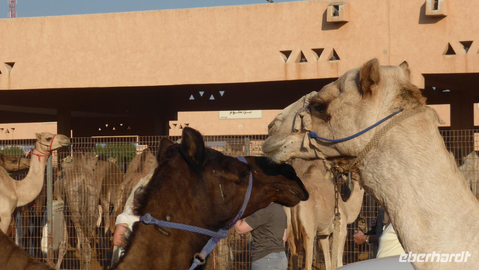 Am Rande der Stadt liegt der größte Kamelmarkt des Landes. Früher waren Kamele wichtige Begleiter der Beduinen und sicherten ihnen das Überleben in der Wüste. Heute dienen sie als Rennkamele bei hochdotierten Rennen oder sie werden als Nutztier für die Milch- und Fleischgewinnung auf dem Kamelmarkt zum Verkauf angeboten. Auch Kamele aus Nachbarländern kann man hier finden: eine kleine Rasse stammt aus dem Oman, schwarze Kamele aus Saudi Arabien. Als wir den Kamelmarkt besuchen, werden gerade zwei Laster mit Kamelen entladen, was wir gut aus der Nähe verfolgen können.