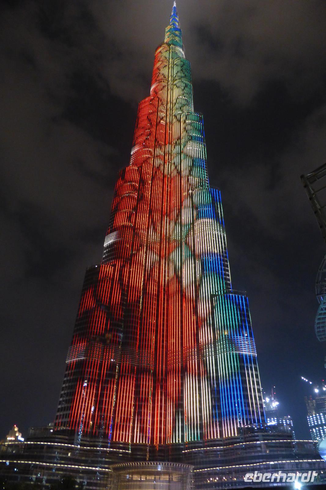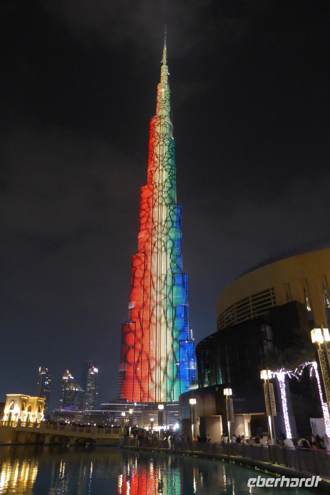 Am Abend kommen wir zurück nach Dubai und treffen Anja in der Dubai Mall. Im Cafe Blanc haben wir unser letztes gemeinsames Abendessen. Es bleibt noch Zeit, um die Wasserspiele und die Lichtershow am Burj Khalifa anzuschauen. Dann sorgen wir im Supermarkt noch für einen sprunghaften Absatz von Schokodatteln. Ich bringe sie selbst gern als Geschenk mit nach Deutschland, schließlich steht ja Weihnachten vor der Tür