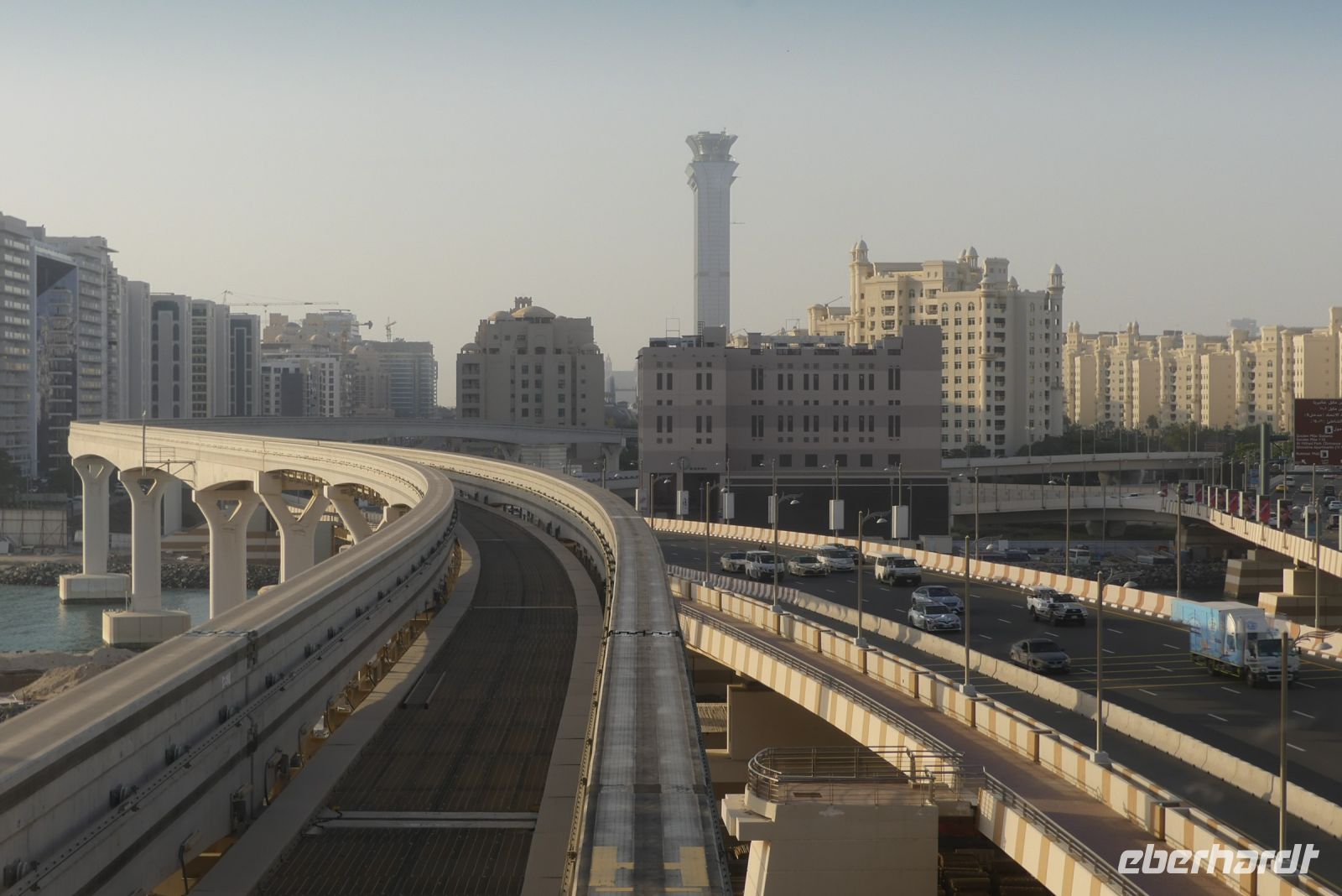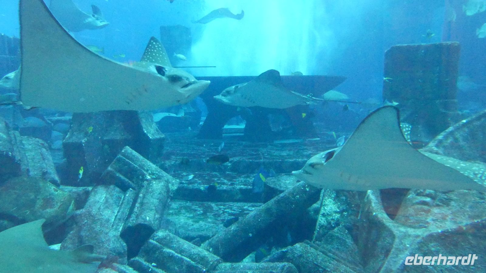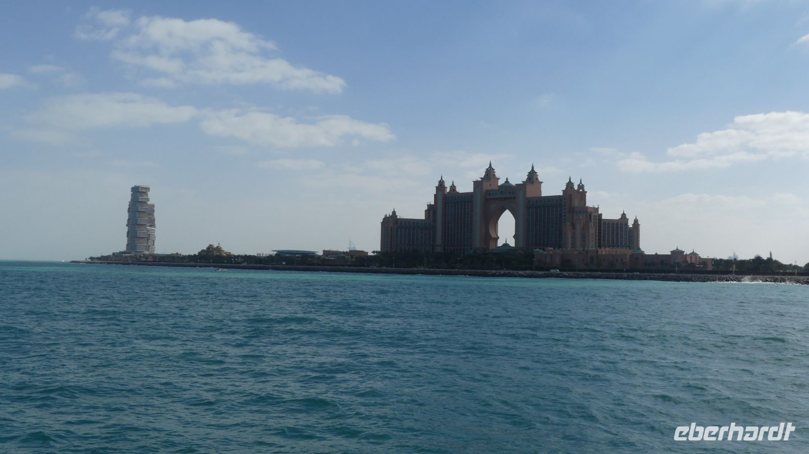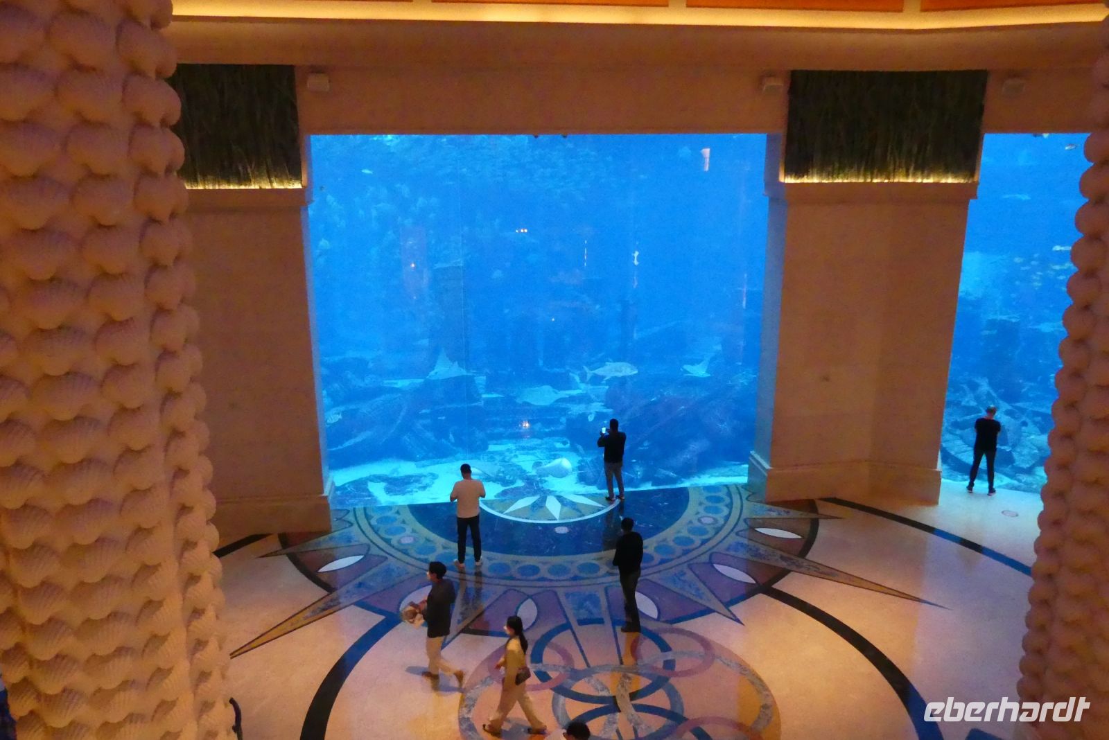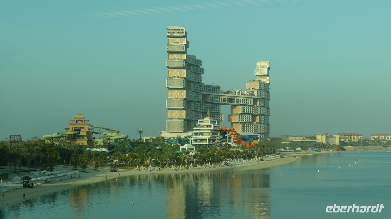 Auf dem Stamm der Palmeninsel Palm Jumairah befindet sich eine Hochbahn. Mit dieser Monorailbahn fahren wir rund 5 Kilometer Richtung Atlantis Hotel. Von der Hochbahn aus haben wir einen guten Ausblick auf Form und Bebauung der Palminsel. Von der Endhaltestelle aus gelangen wir in die Einkaufspassage des Atlantis Hotels und weiter zum Aquarium. Das Hotel trägt den Namen der sagenumwobenen versunkenen Stadt Atlantis. Auch das riesige Aquarium nimmt dieses Thema auf, indem es einen versunkenen Thron, antike Säulen und andere Symbole einer antiken Stadt integriert.