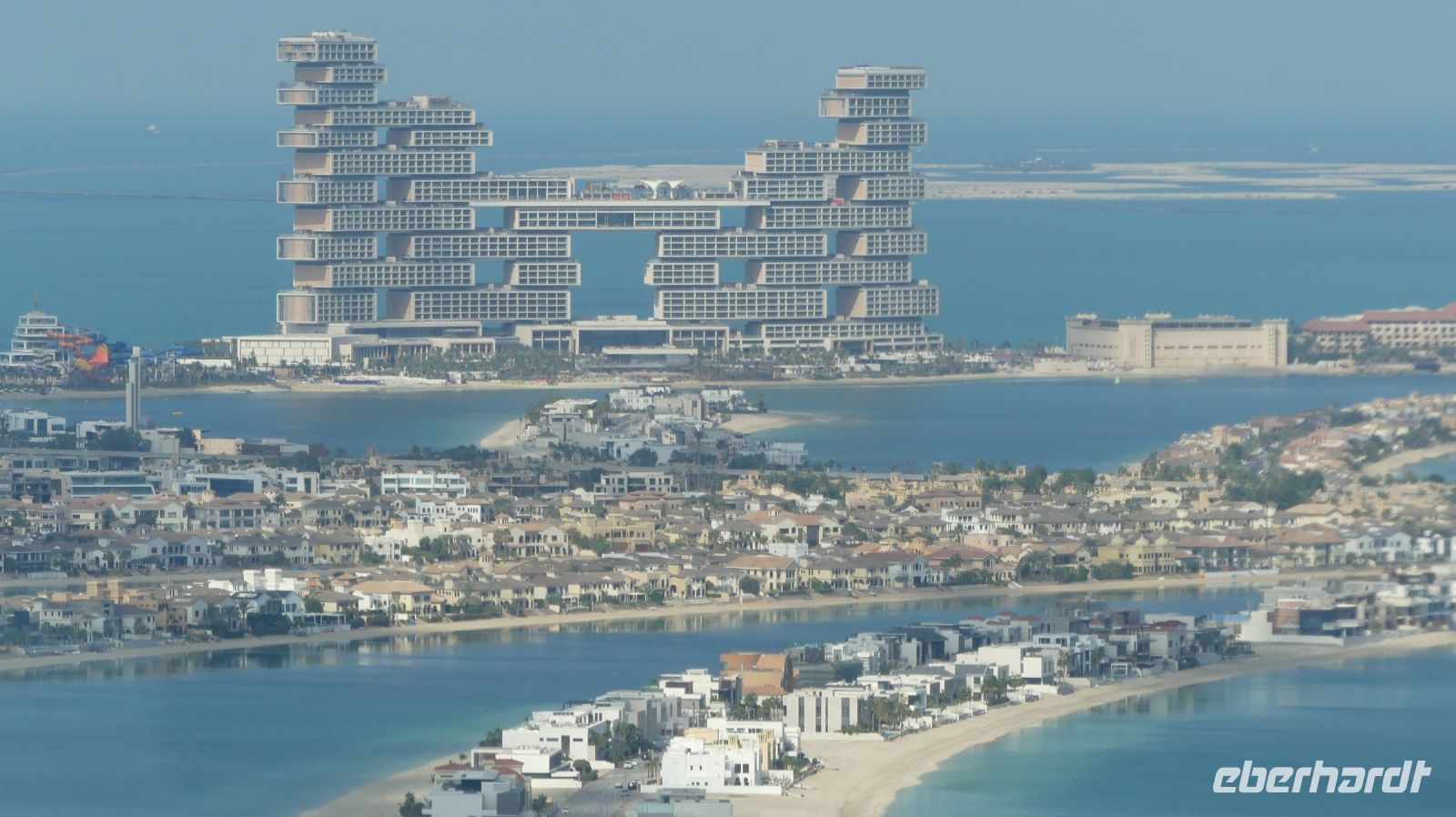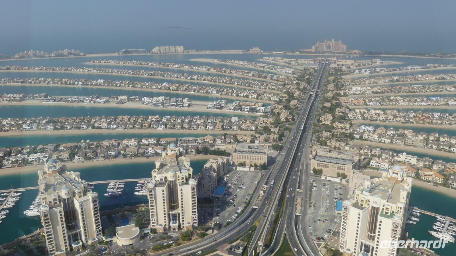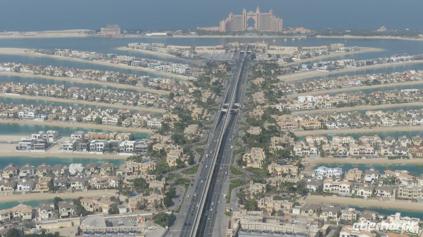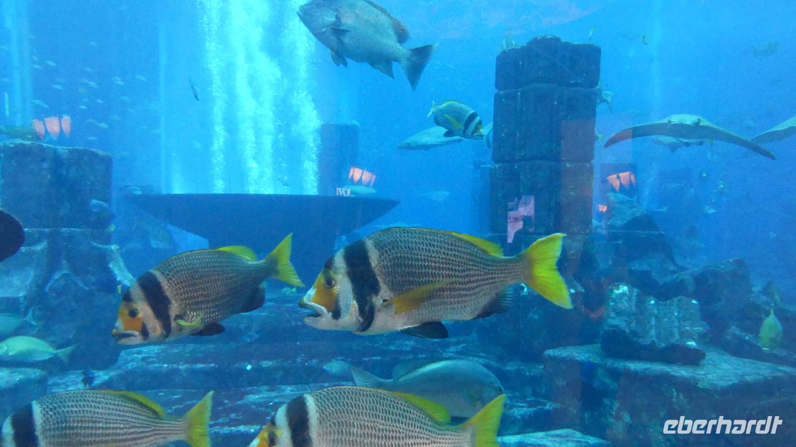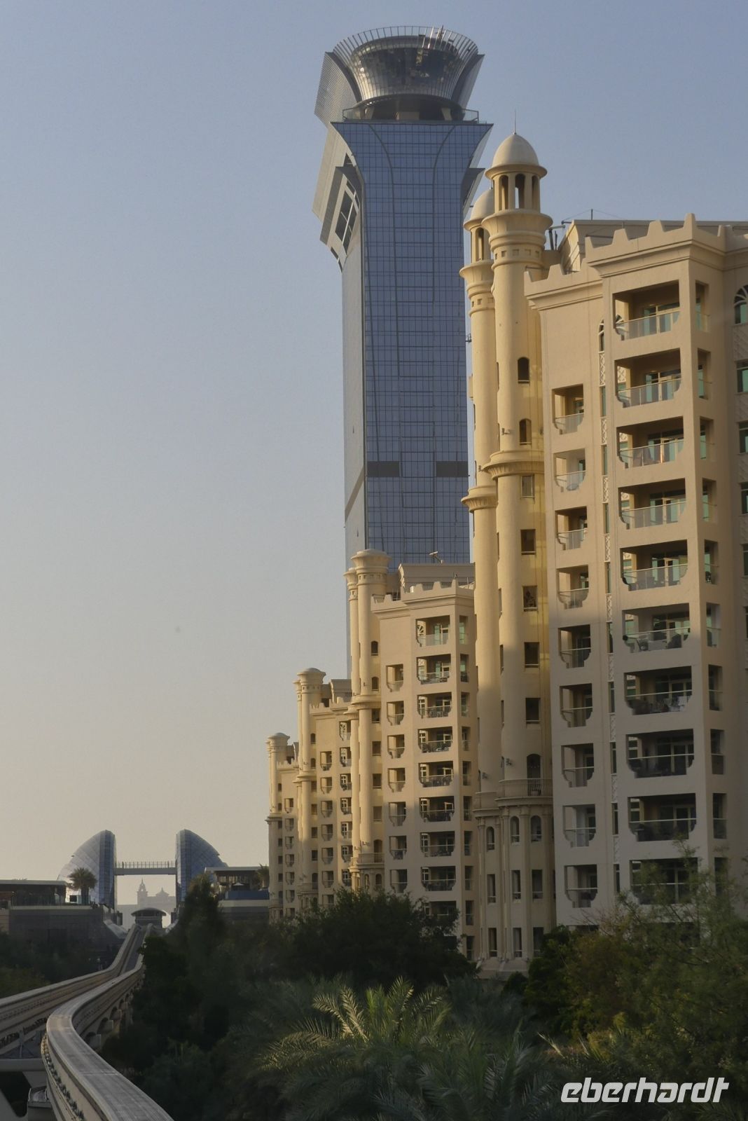 Auf dem Stamm der Palmeninsel Palm Jumairah befindet sich eine Hochbahn. Mit dieser Monorailbahn fahren wir rund 5 Kilometer Richtung Atlantis Hotel. Von der Hochbahn aus haben wir einen guten Ausblick auf Form und Bebauung der Palminsel. Von der Endhaltestelle aus gelangen wir in die Einkaufspassage des Atlantis Hotels und weiter zum Aquarium. Das Hotel trägt den Namen der sagenumwobenen versunkenen Stadt Atlantis. Auch das riesige Aquarium nimmt dieses Thema auf, indem es einen versunkenen Thron, antike Säulen und andere Symbole einer antiken Stadt integriert.
