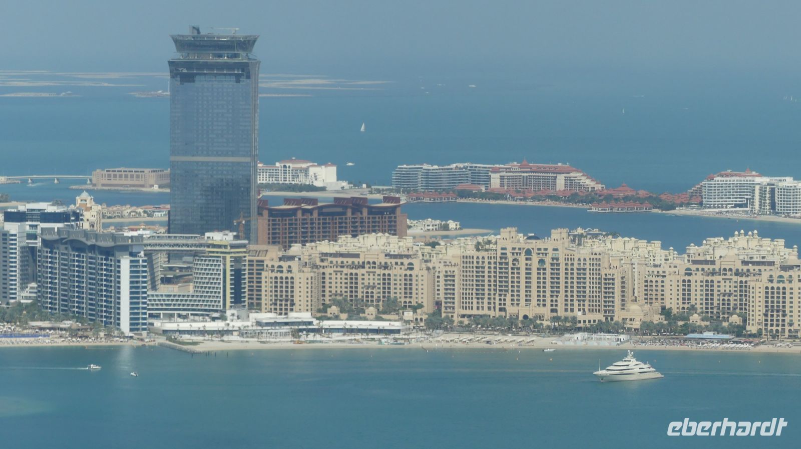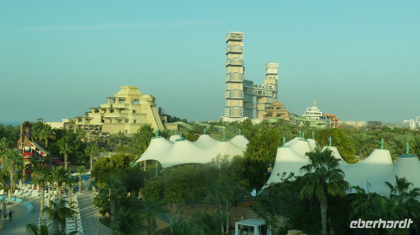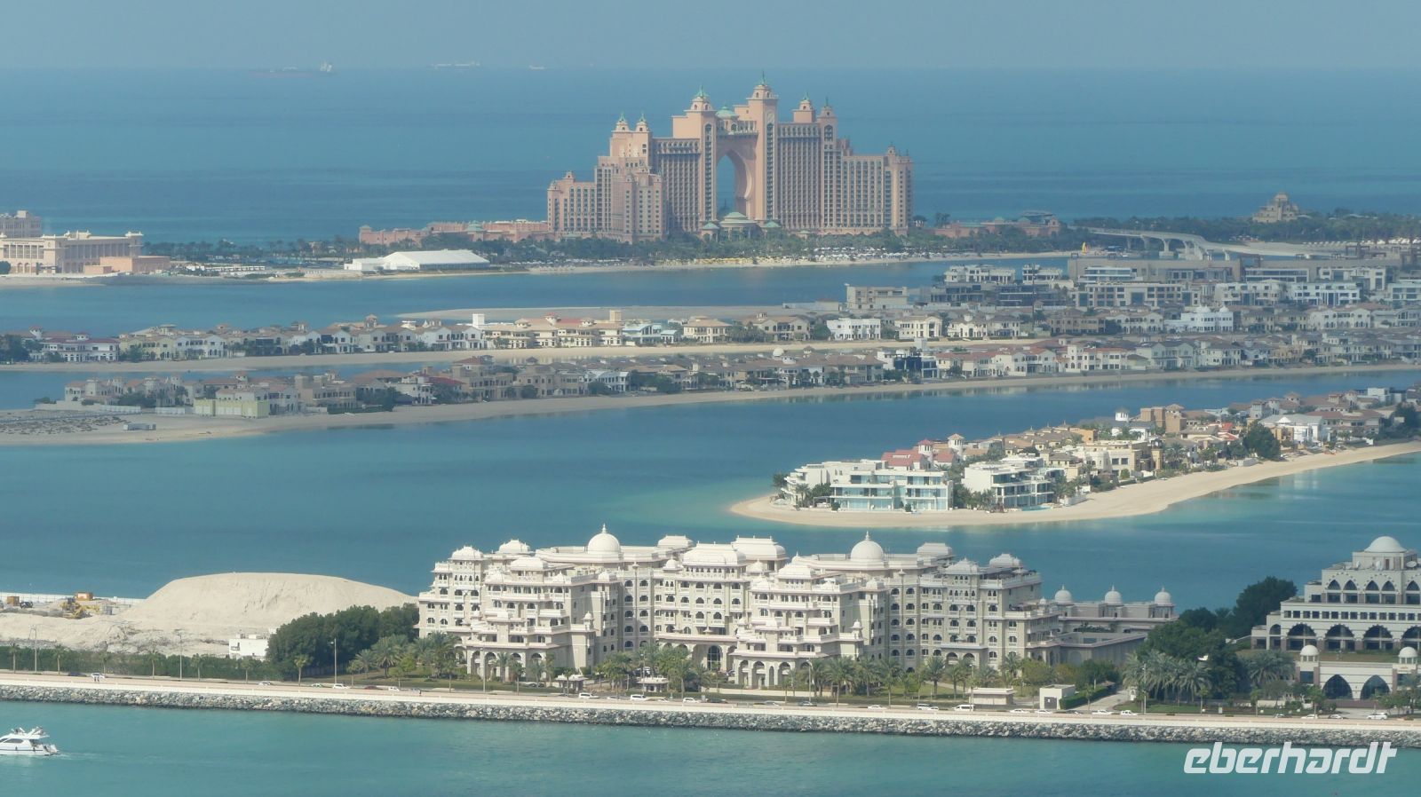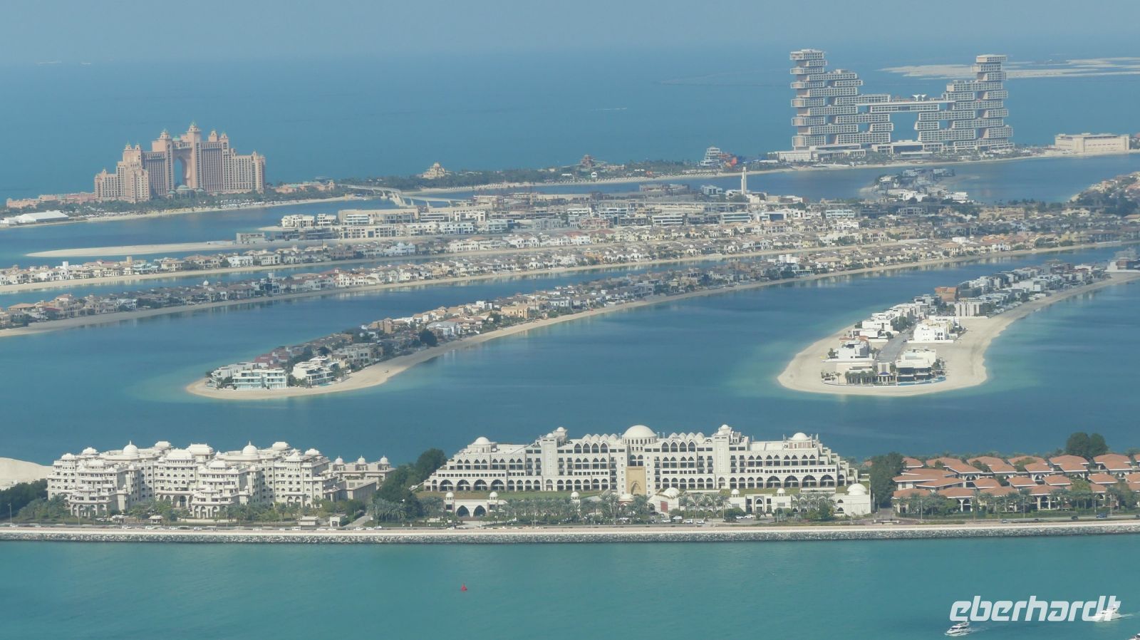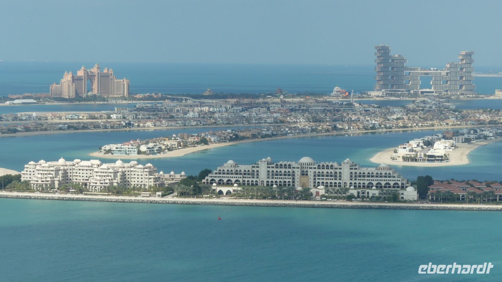 Auf dem Stamm der Palmeninsel Palm Jumairah befindet sich eine Hochbahn. Mit dieser Monorailbahn fahren wir rund 5 Kilometer Richtung Atlantis Hotel. Von der Hochbahn aus haben wir einen guten Ausblick auf Form und Bebauung der Palminsel. Von der Endhaltestelle aus gelangen wir in die Einkaufspassage des Atlantis Hotels und weiter zum Aquarium. Das Hotel trägt den Namen der sagenumwobenen versunkenen Stadt Atlantis. Auch das riesige Aquarium nimmt dieses Thema auf, indem es einen versunkenen Thron, antike Säulen und andere Symbole einer antiken Stadt integriert.