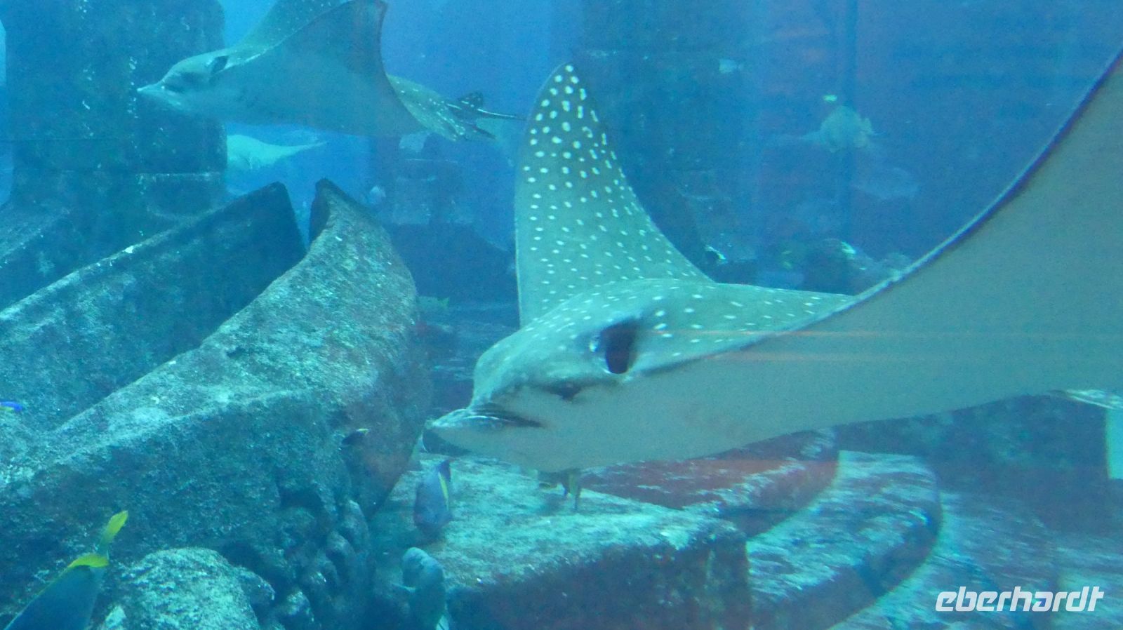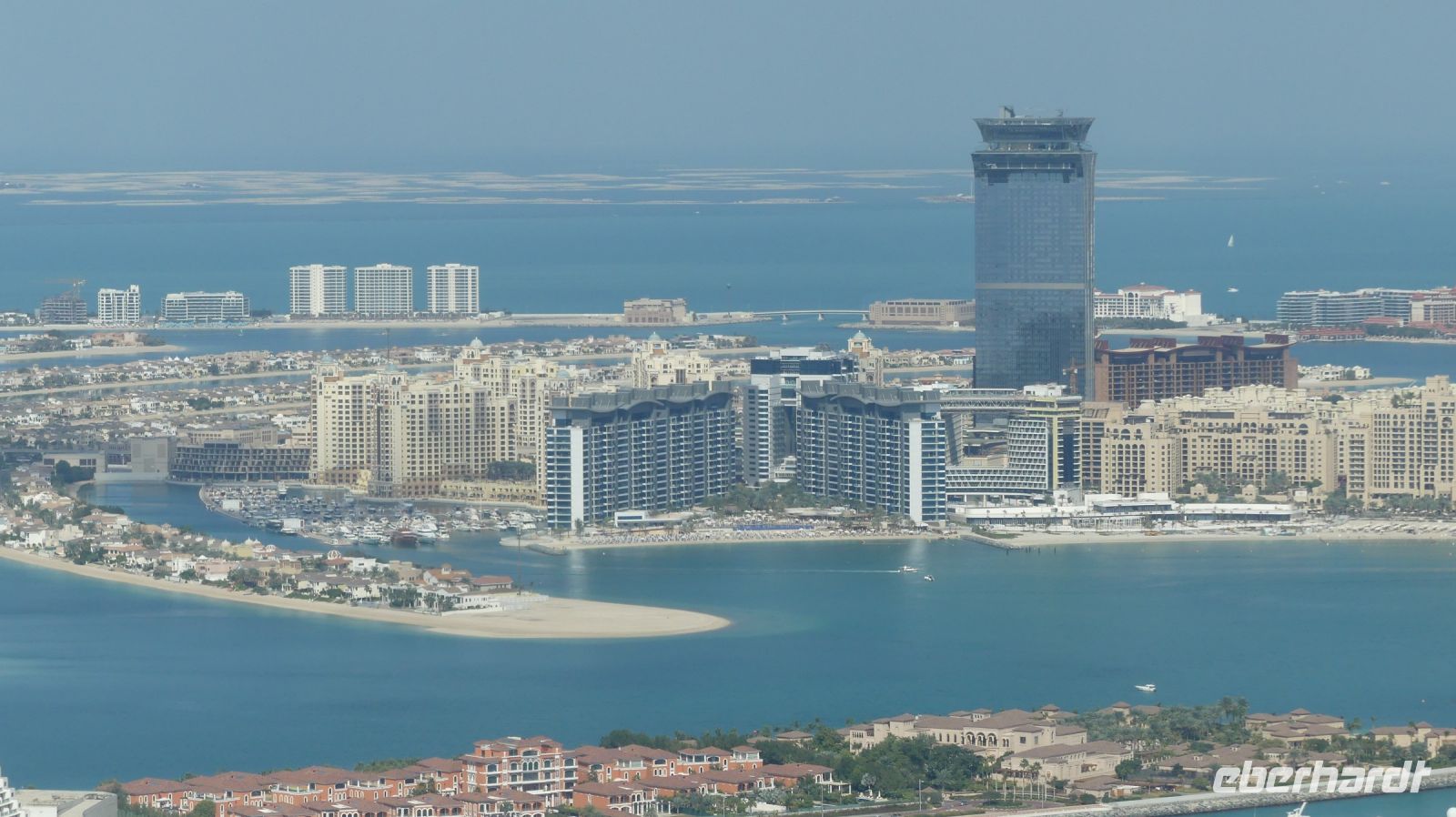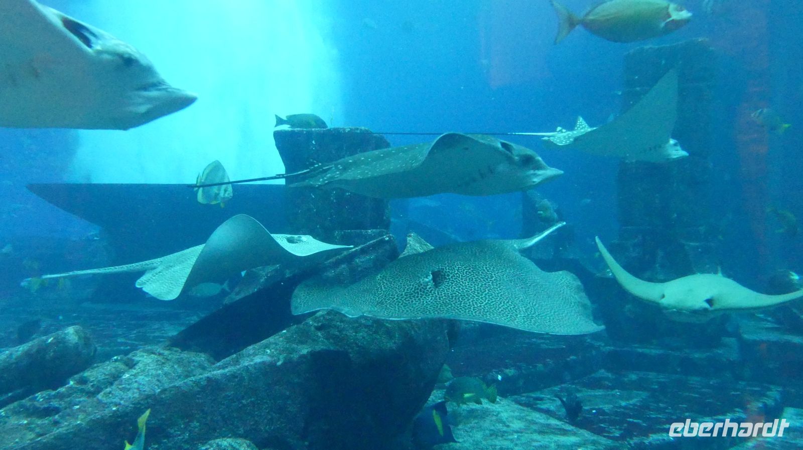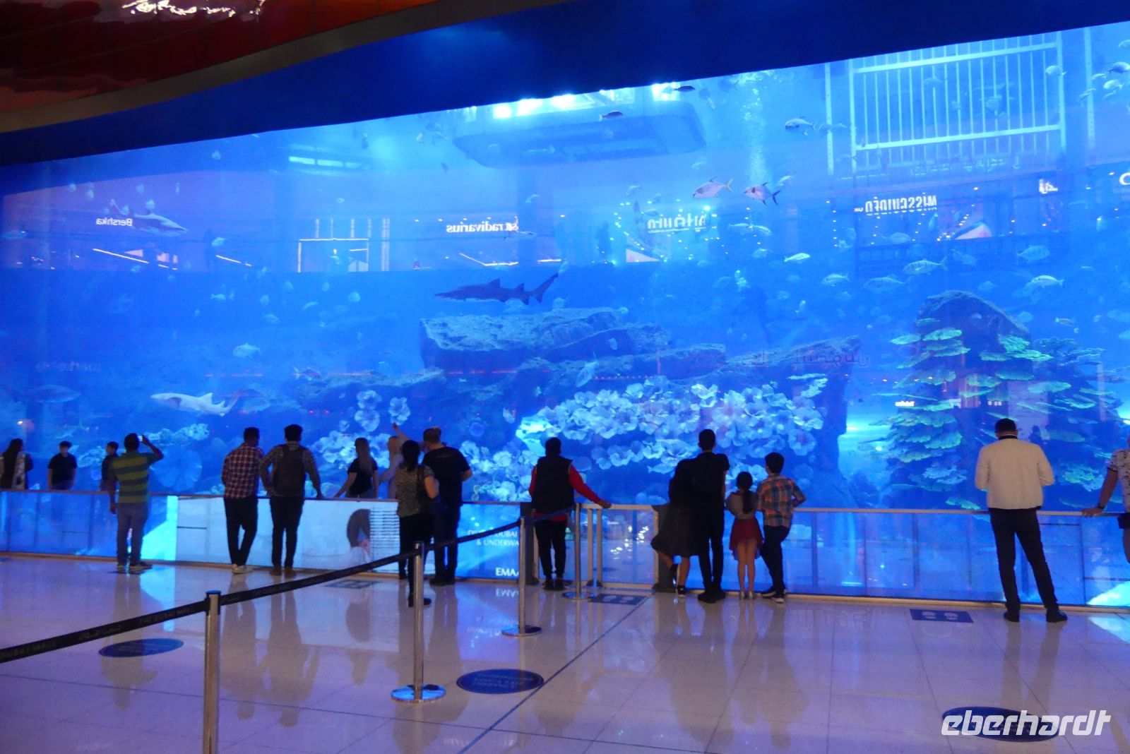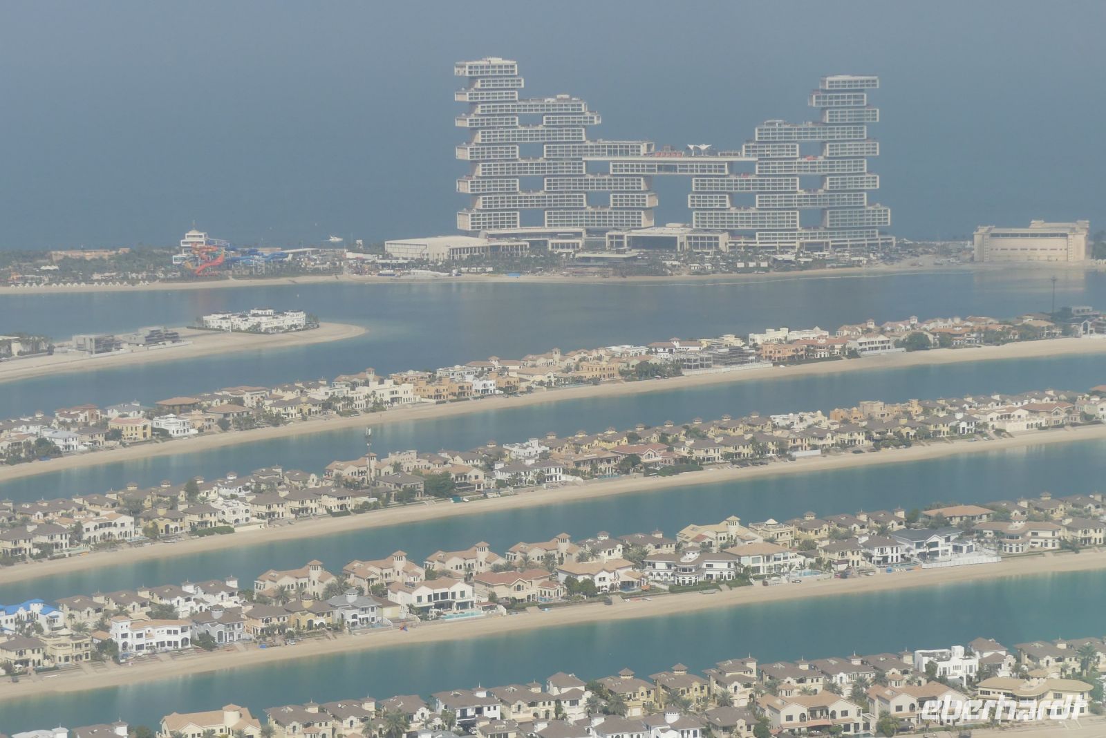 Auf dem Stamm der Palmeninsel Palm Jumairah befindet sich eine Hochbahn. Mit dieser Monorailbahn fahren wir rund 5 Kilometer Richtung Atlantis Hotel. Von der Hochbahn aus haben wir einen guten Ausblick auf Form und Bebauung der Palminsel. Von der Endhaltestelle aus gelangen wir in die Einkaufspassage des Atlantis Hotels und weiter zum Aquarium. Das Hotel trägt den Namen der sagenumwobenen versunkenen Stadt Atlantis. Auch das riesige Aquarium nimmt dieses Thema auf, indem es einen versunkenen Thron, antike Säulen und andere Symbole einer antiken Stadt integriert.