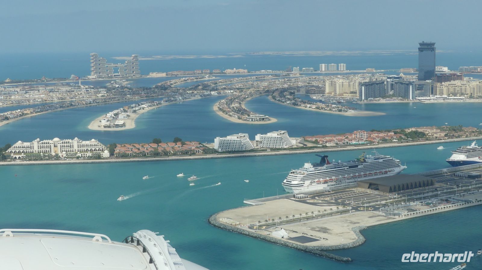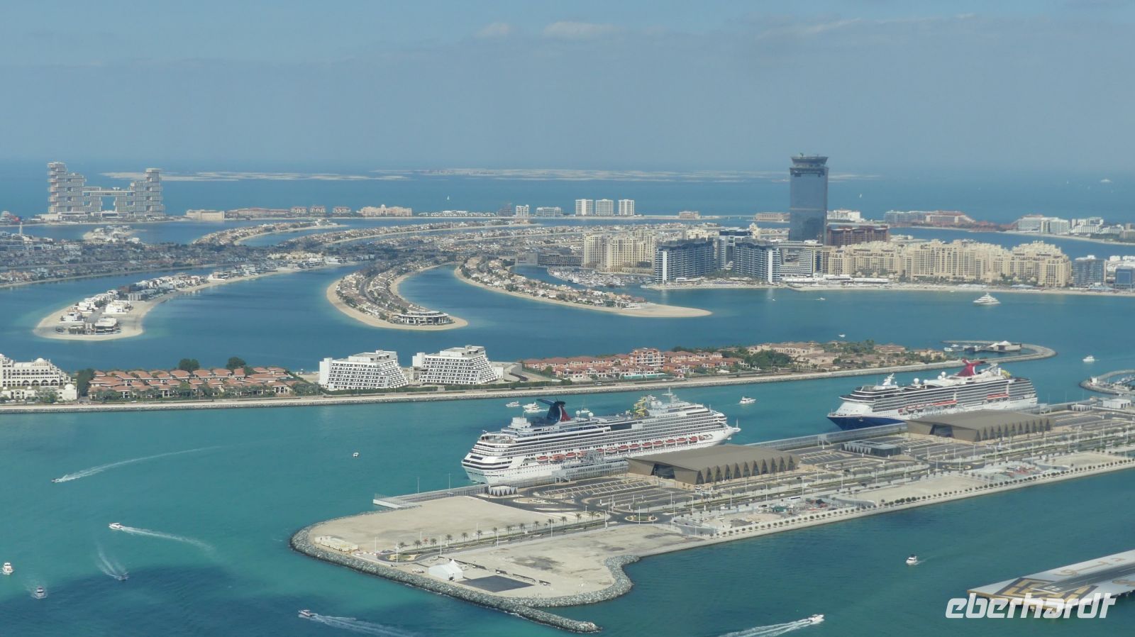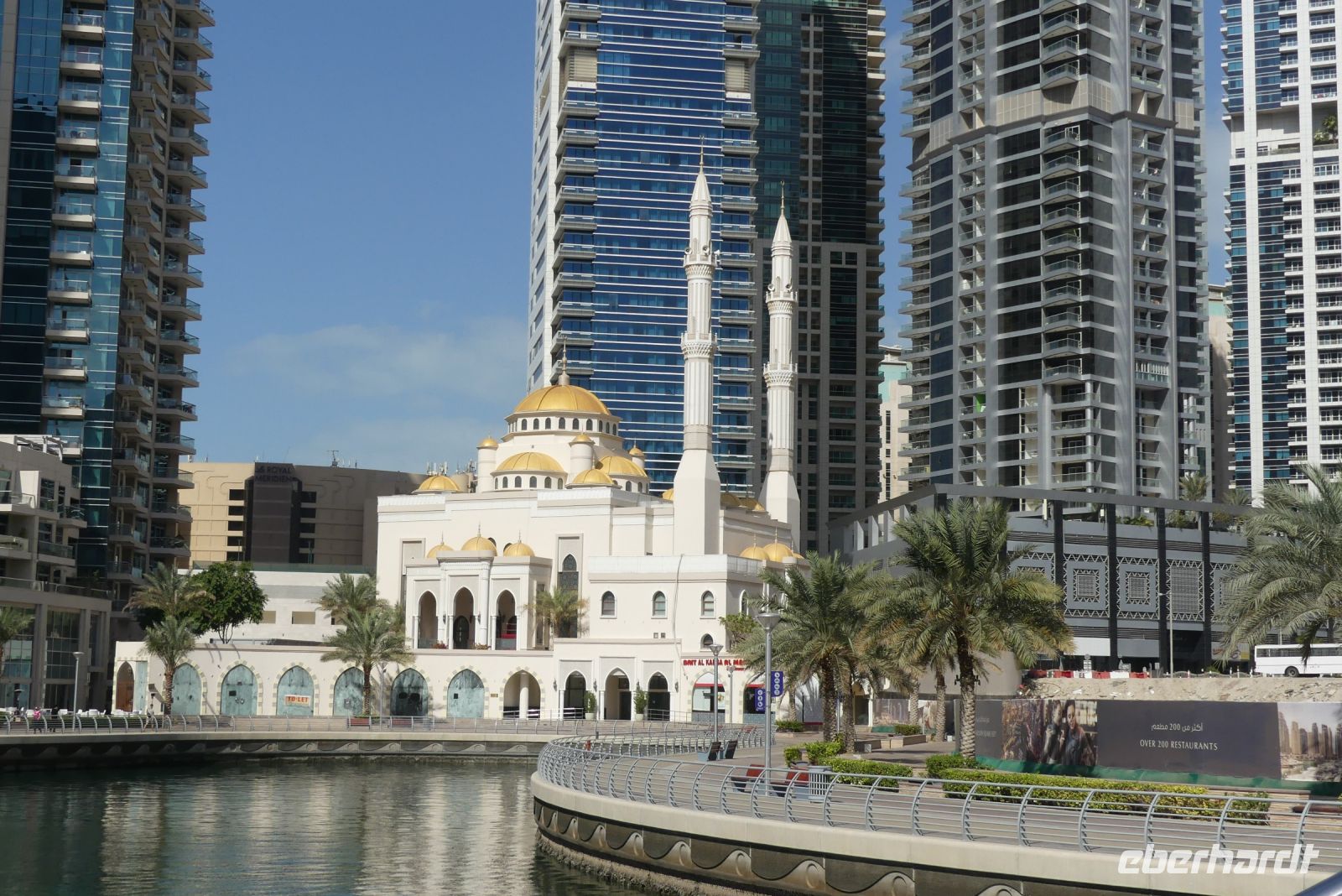 Unser Hotel befindet sich im Stadtteil Dubai Marina. Als ich vor 20 Jahren an diesem Ort war, wurde hier gerade der 2,5 Kilometer lange Kanal ausgehoben. Gebäude gab es da noch nicht. Heute stehen hier die Appartementhäuser mit Höhen von über 200 und 300 Meter dicht nebeneinander. Der Kanal ist vom Meer geflutet und schiffbar. Wir betreten am Vormittag im Yachthafen eine Yacht, welche für uns exklusiv bereit steht. Bei strahlendem Sonnenschein können wir die Skyline der Marina bewundern. Die zweistündige Fahrt führt uns weiter, vorbei an Blue Water Island mit dem Riesenrad Dubai Eye und dem Kreuzfahrtterminal, zur Palmeninsel Palm Jumairah. Am äußeren Palmenring stechen besonders die markanten Bauten des Atlantis Hotels und es Royal Atlantis ins Auge. Mit an Bord ist unser örtliche Reiseleiter Ibrahim, der mit dem leichten Seegang allerdings so seine Probleme hat (Ihr habt das nicht so mitbekommen, aber ihn hatte es ganz schön erwischt!). Ibrahim ist froh, als er wieder festen Boden unter den Füßen hat. Weiter geht´s zu einem Zwischenstopp in die Marina Mall zum Geld Wechseln.