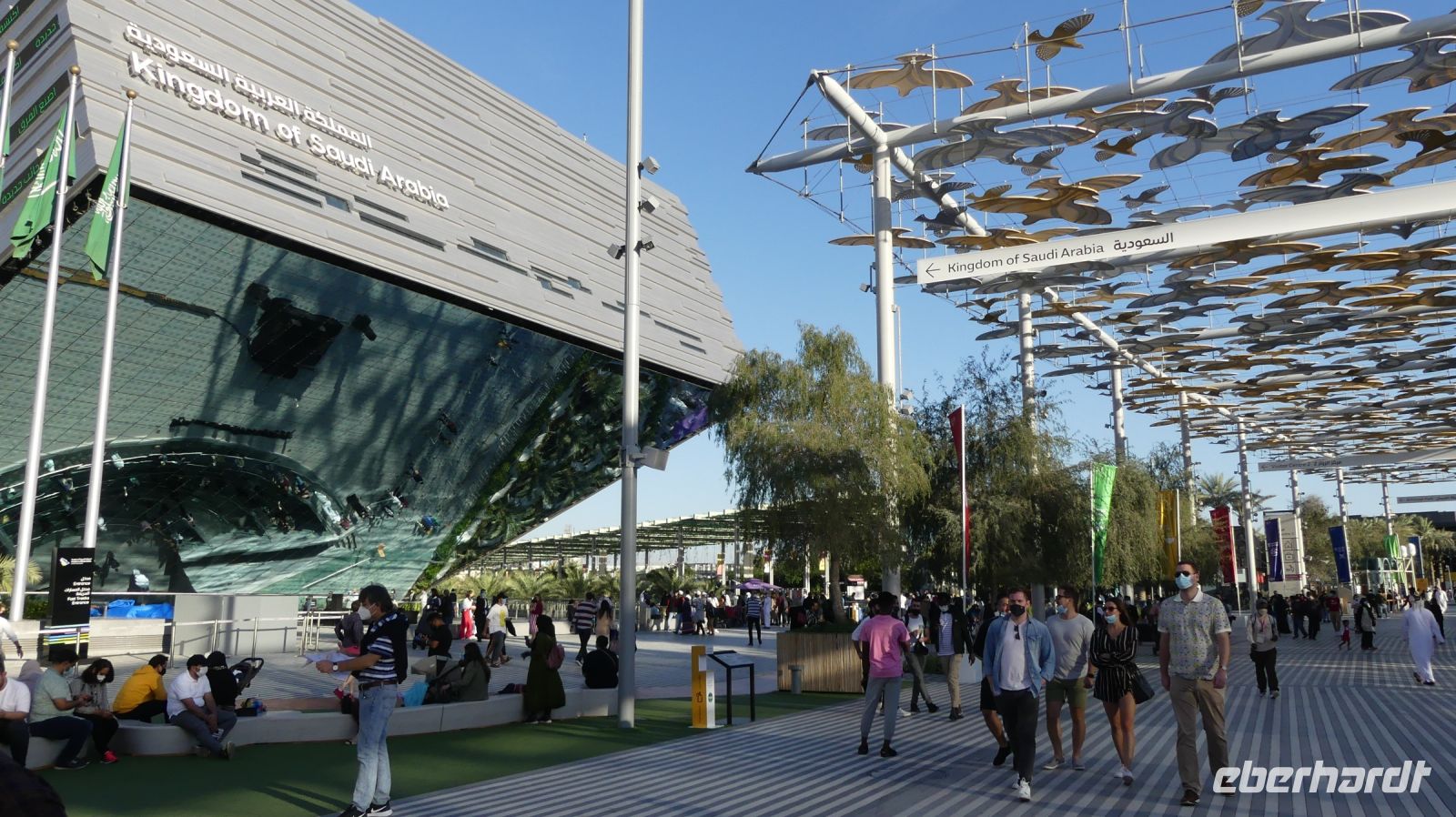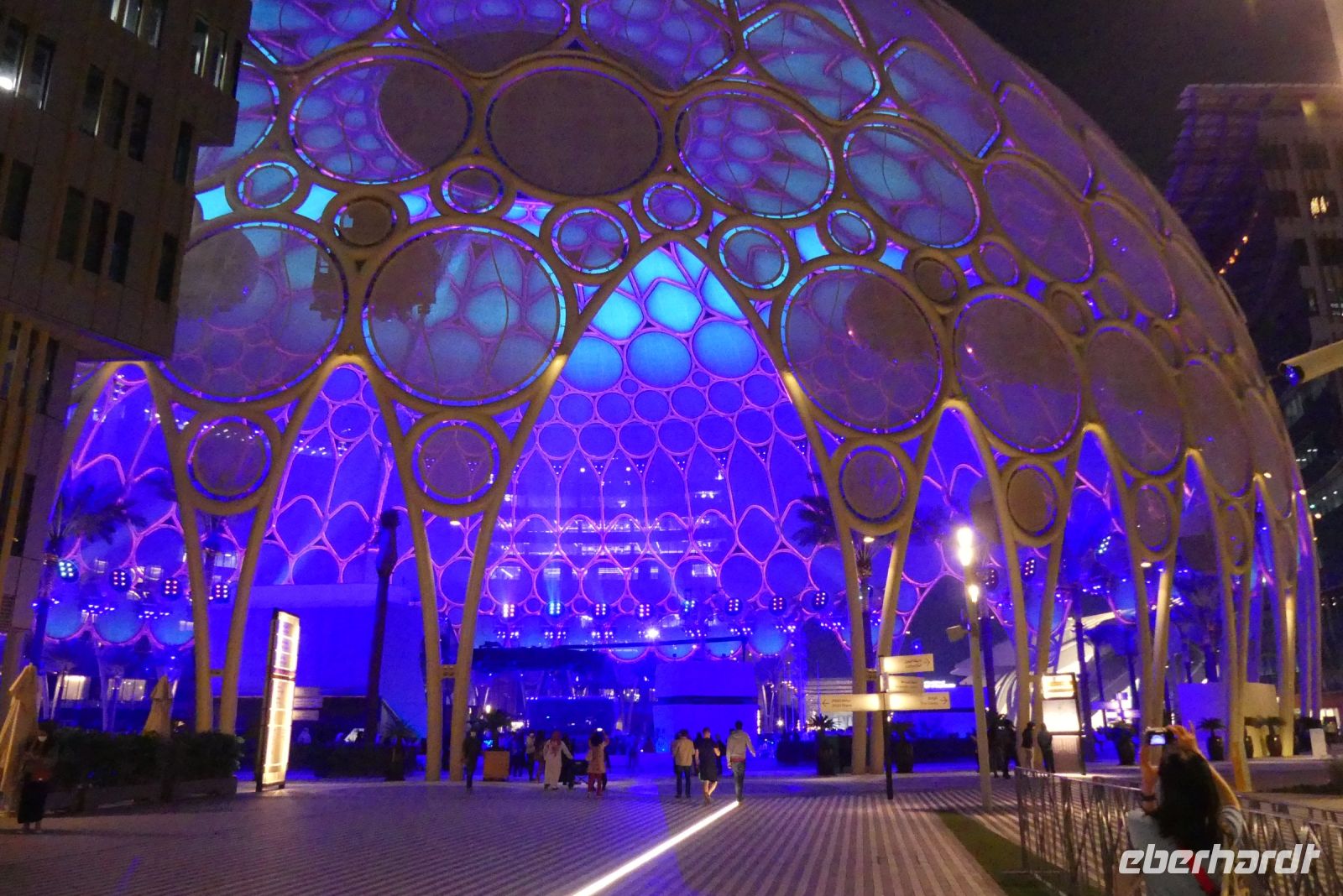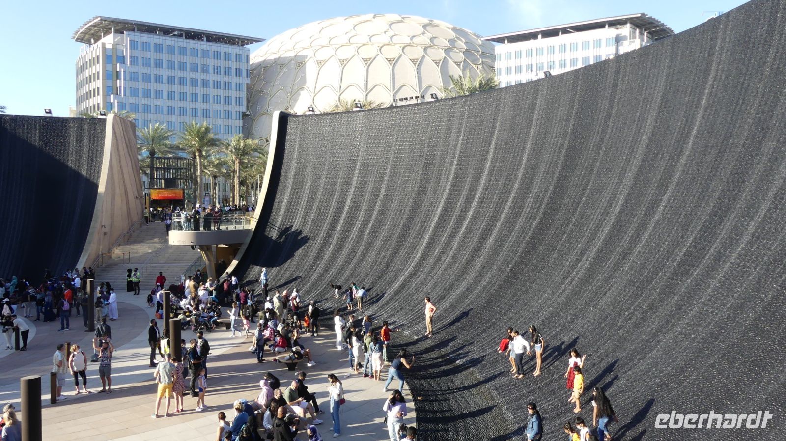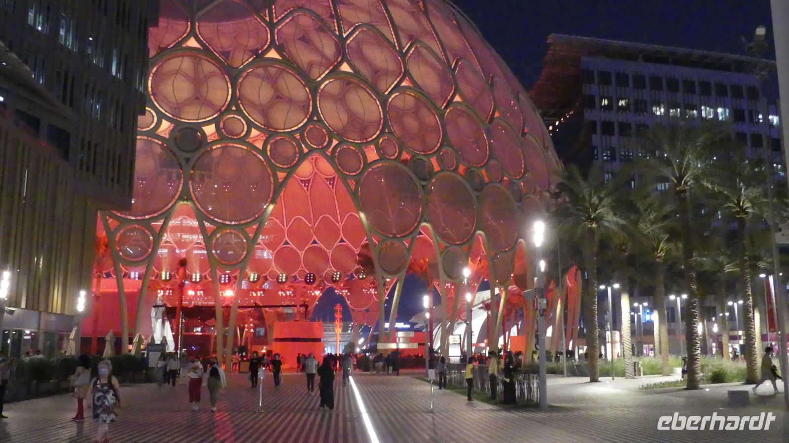 Den Rest des Tages bis in den Abend hinein verbringen wir auf der EXPO 2020. Es ist die erste Weltausstellung in einem arabischen Land. Neu ist auch, dass die Länderpavillons nicht nach ihrer geographischen Lage angeordnet, sondern nach einem der drei Themen Nachhaltigkeit, Mobilität oder Zukunftschancen angeordnet wurden. Es ist Sonntag. Mit Beginn dieses Jahres bilden in den VAE wie bei uns der Sonnabend und der Sonntag das Wochenende. Es ist nach 2006 die zweite Reform hinsichtlich der Verteilung von Arbeitstagen und Wochenende. Gleichzeitig wurde für den staatlichen Sektor die 4,5 Tage eingeführt. So endet die Arbeitswoche des öffentlichen Sektors Freitagmittag und das wichtige Freitagsgebet markiert den Beginn des Wochenendes. Ich erwähne die Wochenendreform deshalb, weil wir heute die Auswirkungen auf der EXPO zu spüren bekommen: Es sind viele Familien mit ihren Kinder und insgesamt überdurchschnittlich viele Besucher auf der Weltausstellung anzutreffen.