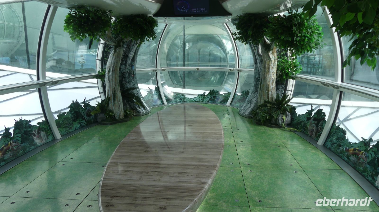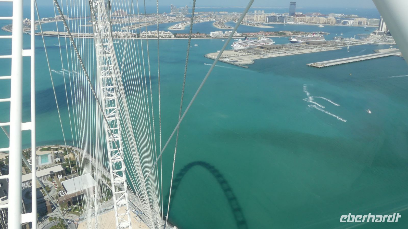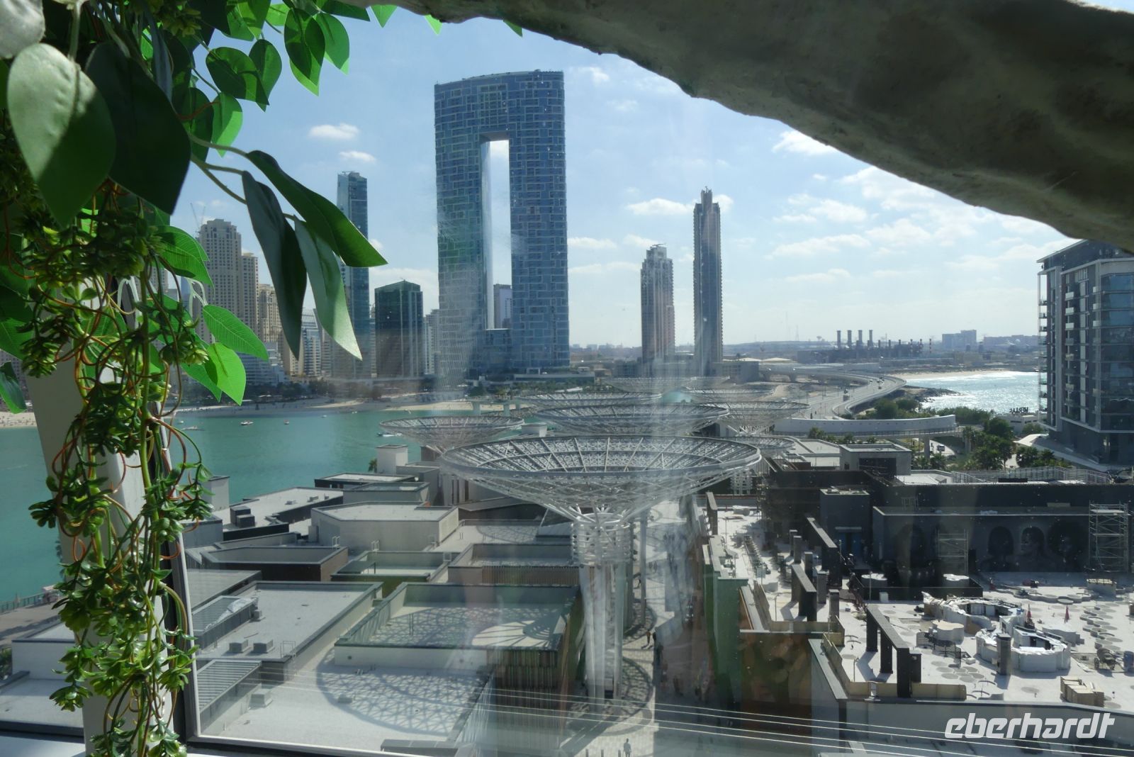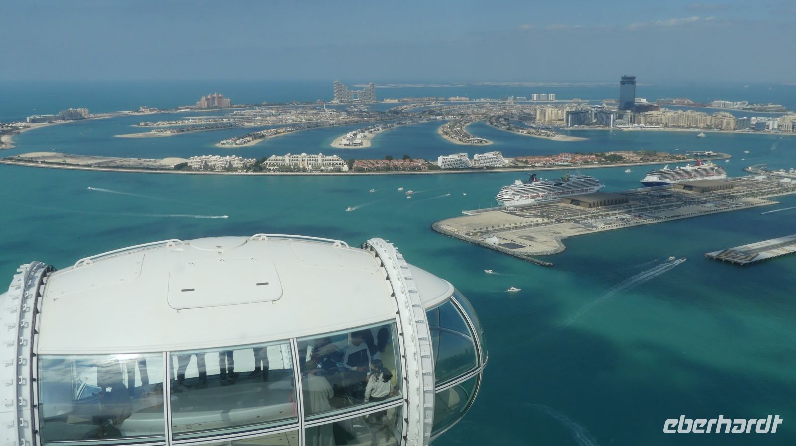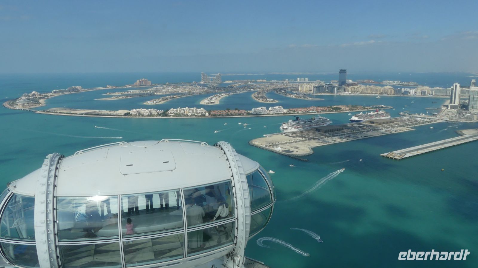 Erst vor wenigen Wochen, im Oktober 2021 hat das neue Riesenrad in Dubai unter dem Namen Ain Dubai (arab.) bzw. Dubai Eye (engl.) eröffnet. Es ist mit 250 Meter das weltgrößte Riesenrad. Glücklicherweise können wir ohne Wartezeit das Eingangsgebäude des Riesenrades betreten. Nach der Sicherheitskontrolle steigen wir in eine der 48 Gondeln. Diese haben wir exklusiv für uns allein. Und zufällig haben wir keine gewöhnliche Gondel, sondern eine „Dschungelgondel“. Das bedeutet, dass unsere Gondel mit üppiger künstlicher Regenwaldvegetation sowie typischen Bewohnern wie Affen und Papageien ausgestattet ist. Nettes Kontrastprogramm zum Ausblick auf Wolkenkratzer, auf den Arabischen Golf und die Palminsel. Es scheint unser Glückstag zu sein. Denn die Aussicht heute ist gut wie nur selten. In den ca. 40 Minuten für eine Umdrehung bieten sich uns tolle Ausblicke auch in die Ferne.