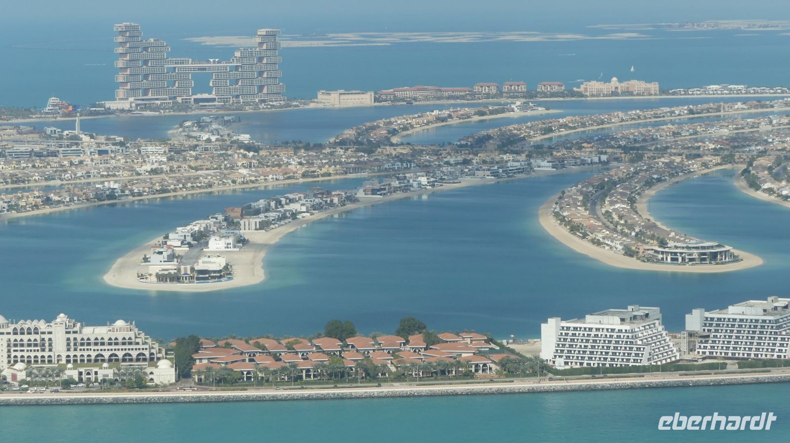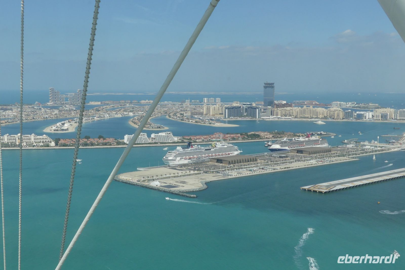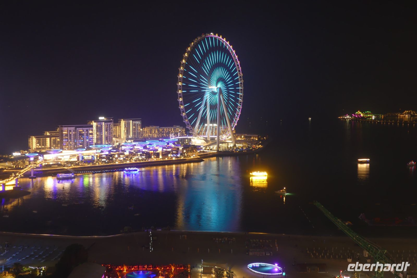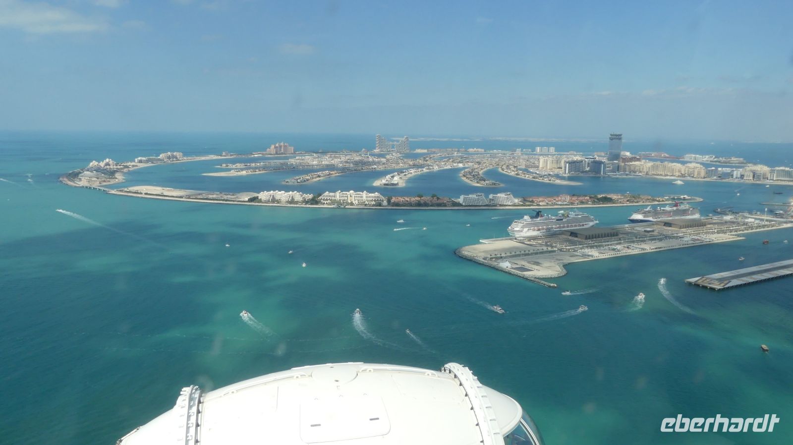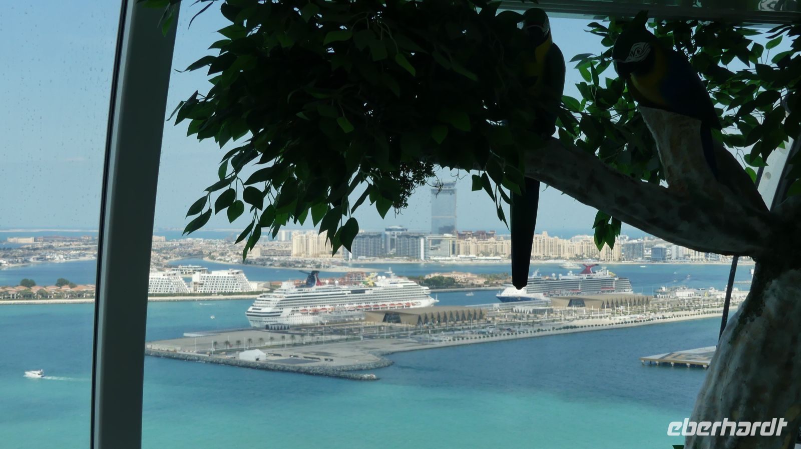Erst vor wenigen Wochen, im Oktober 2021 hat das neue Riesenrad in Dubai unter dem Namen Ain Dubai (arab.) bzw. Dubai Eye (engl.) eröffnet. Es ist mit 250 Meter das weltgrößte Riesenrad. Glücklicherweise können wir ohne Wartezeit das Eingangsgebäude des Riesenrades betreten. Nach der Sicherheitskontrolle steigen wir in eine der 48 Gondeln. Diese haben wir exklusiv für uns allein. Und zufällig haben wir keine gewöhnliche Gondel, sondern eine „Dschungelgondel“. Das bedeutet, dass unsere Gondel mit üppiger künstlicher Regenwaldvegetation sowie typischen Bewohnern wie Affen und Papageien ausgestattet ist. Nettes Kontrastprogramm zum Ausblick auf Wolkenkratzer, auf den Arabischen Golf und die Palminsel. Es scheint unser Glückstag zu sein. Denn die Aussicht heute ist gut wie nur selten. In den ca. 40 Minuten für eine Umdrehung bieten sich uns tolle Ausblicke auch in die Ferne.