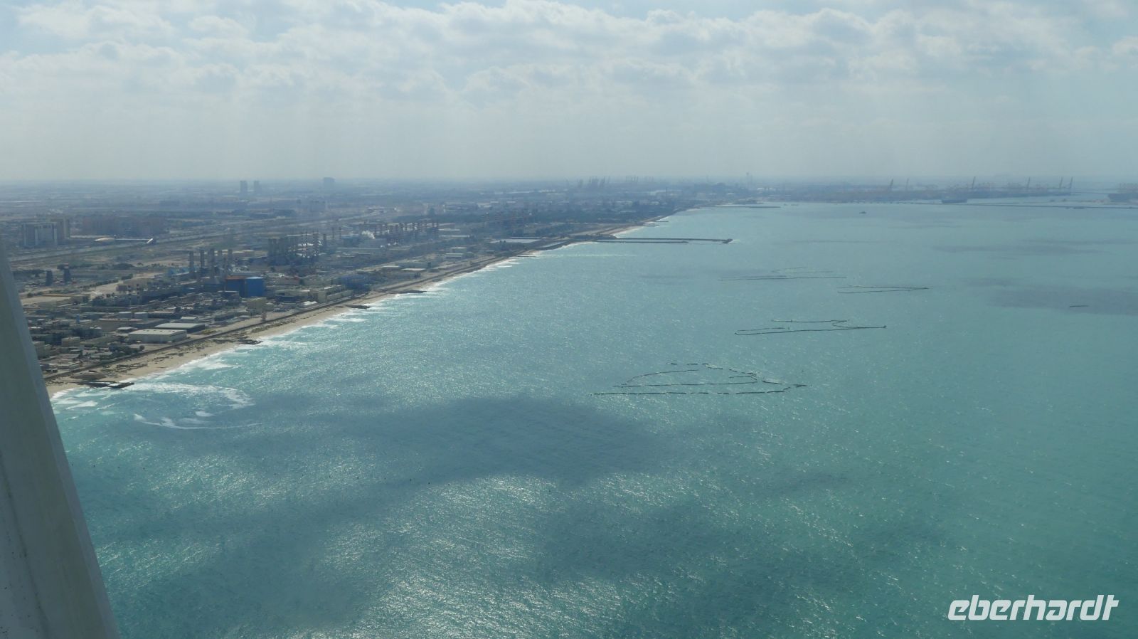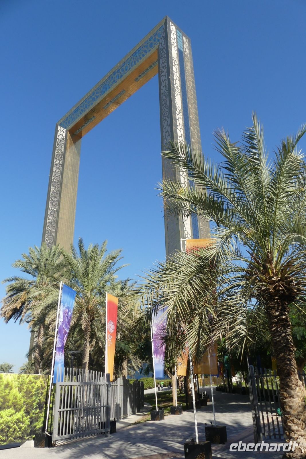Auch dieser Tag beginnt sonnig. Der Morgen ist noch etwas frisch, das heißt noch unter 20 Grad. Das wird sich aber bald ändern. Zunächst besuchen wir „The Frame“, ein 150 Meter hohes Aussichtsgebäude in Form eines Bilderrahmens. Ohne Wartezeit gelangen wir ins Gebäude. Der Weg zum Aufzug ist ideenreich gestaltet – ein illustrierter Weg durch Dubais Geschichte. Von der Aussicht in 150 Meter Höhe haben wir sehr gute Sichtverhältnisse. Wir können weite Teile der Stadt gut erkennen, sowohl die Creekseite mit dem Hafen bis Sharjah als auch Teile der künstlichen Inseln und die neueren Stadtteile wie zum Beispiel Dubai Down Town und die Wolkenkratzer entlang der Shaikh Zayed Road. Auch der Herrscherpalst der Al Maktoums ist gut zu sehen. Für Aufmerksamkeit sorgt bei einigen der teilweise verglaste Fußboden in dieser Höhe.