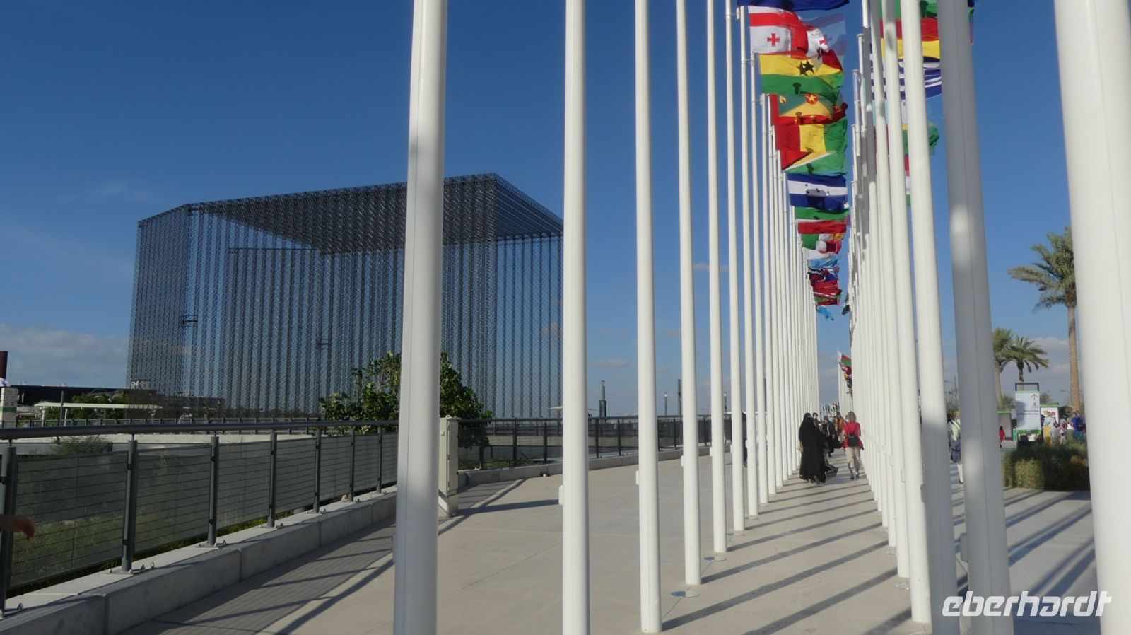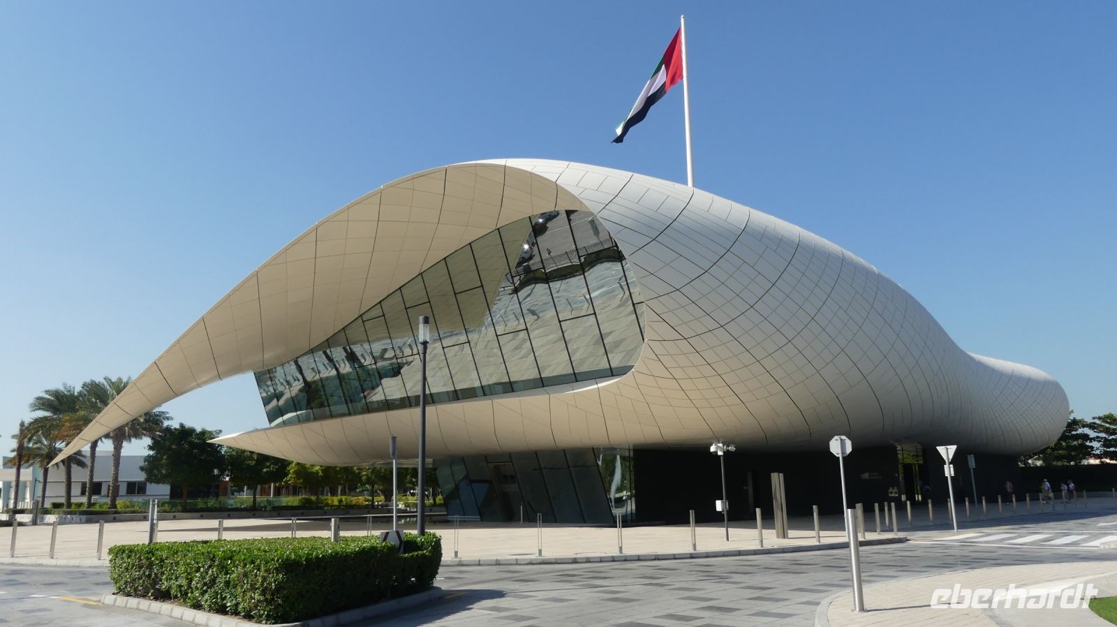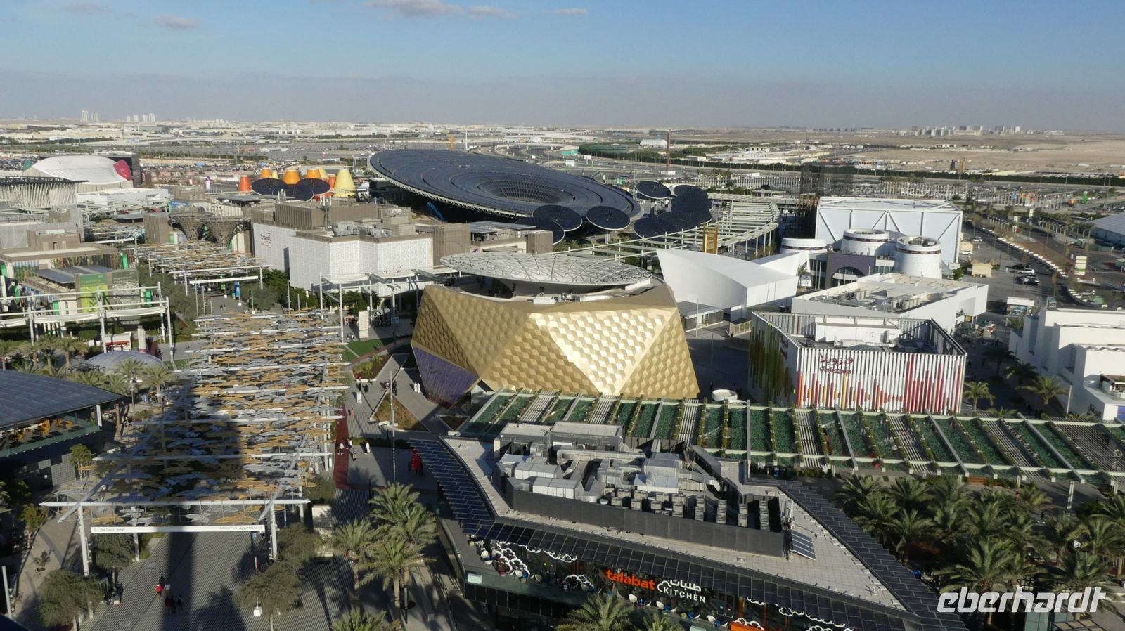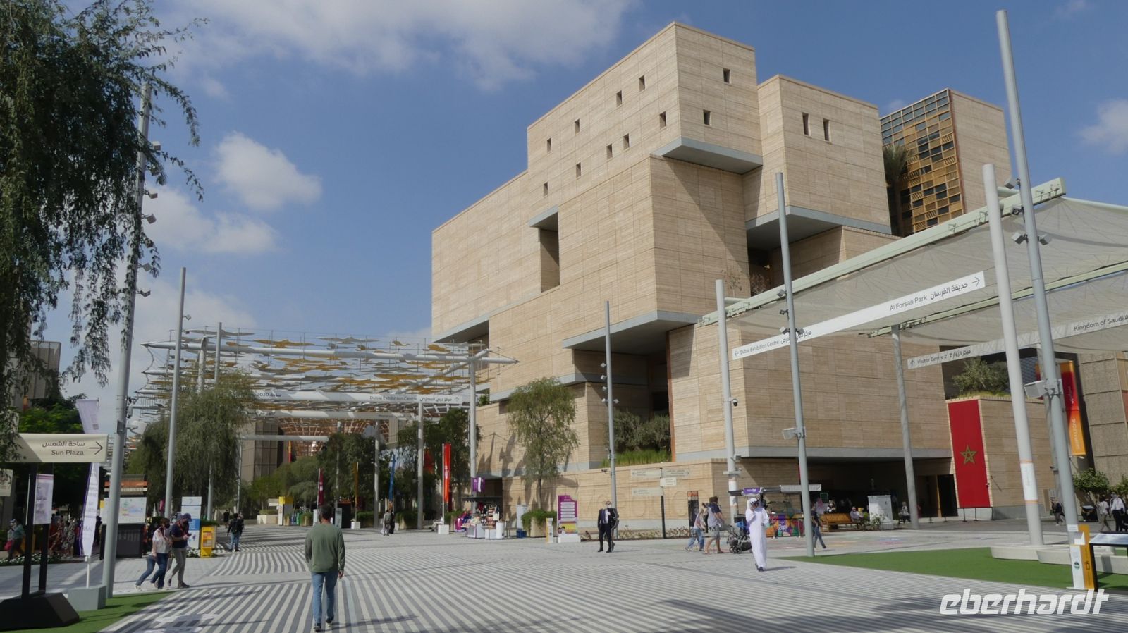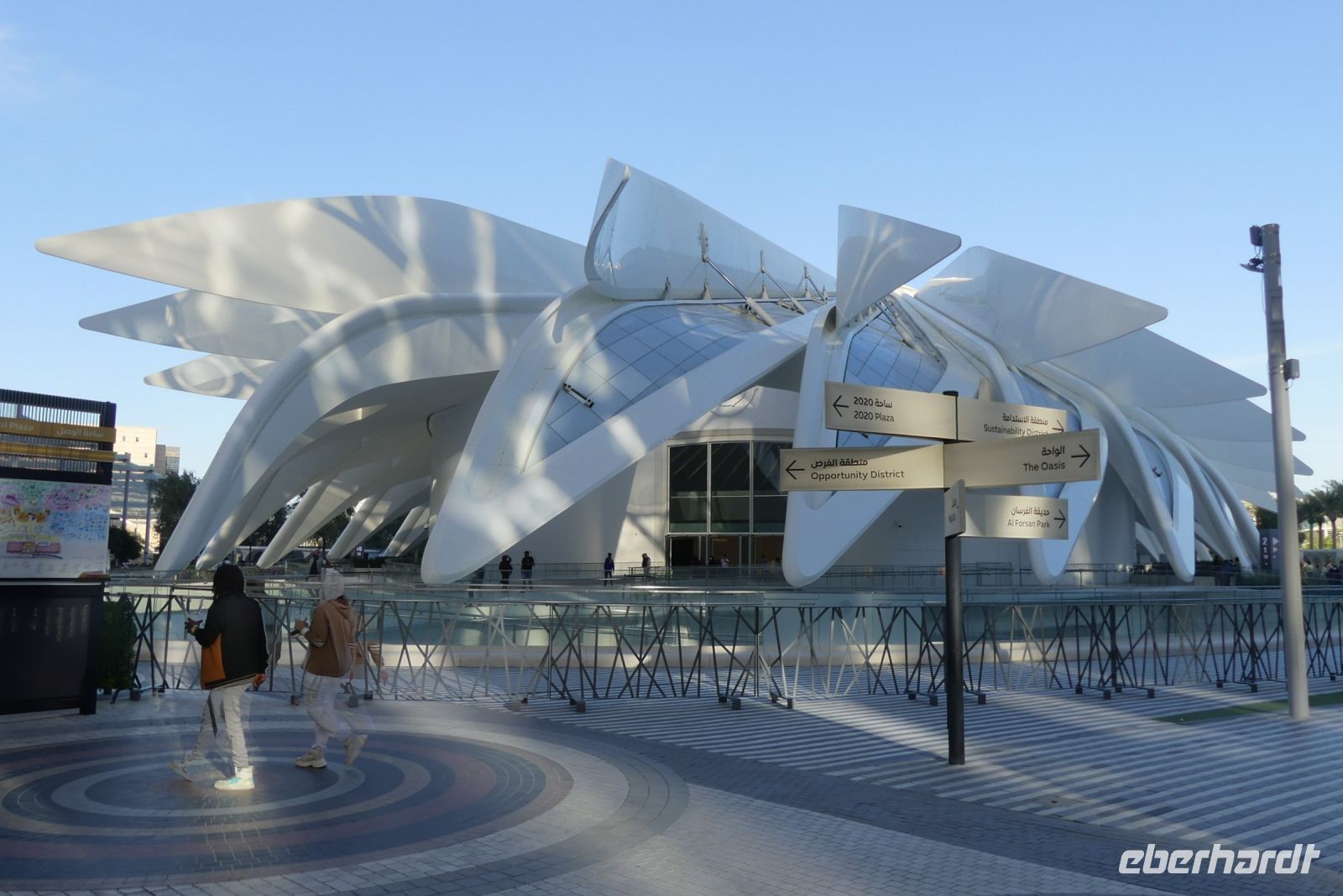 - Pavillon der VAE; das „Land of Dreamers who do“ präsentiert sich in einem architektonisch interessanten Gebäude. Der größte Pavillon der EXPO, wurde vom Gefieder eines sitzenden Falken inspiriert. Im Innern sind rotschimmernde Sanddünen aufgeschüttet, welche als Projektionsflächen dienen.