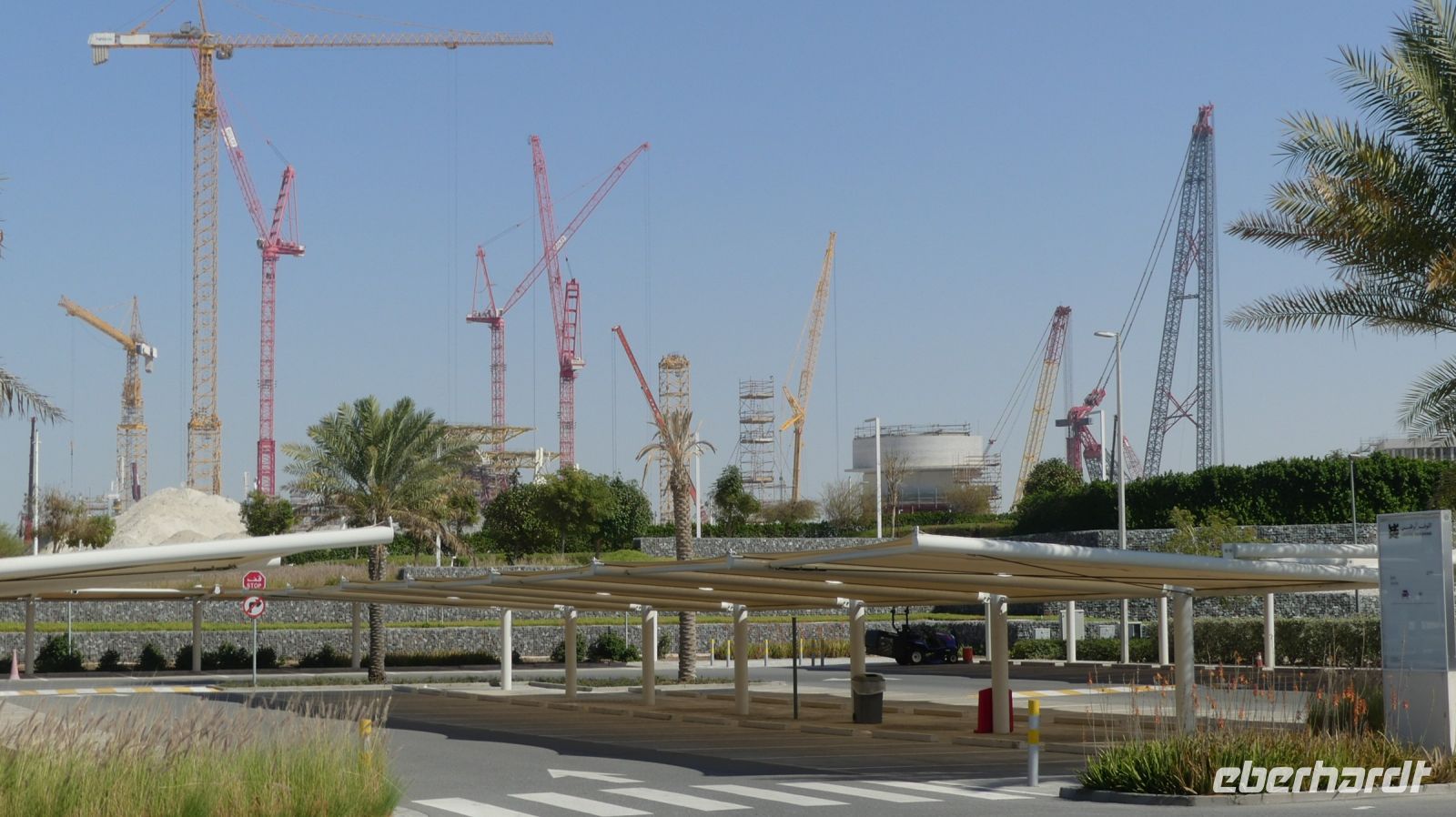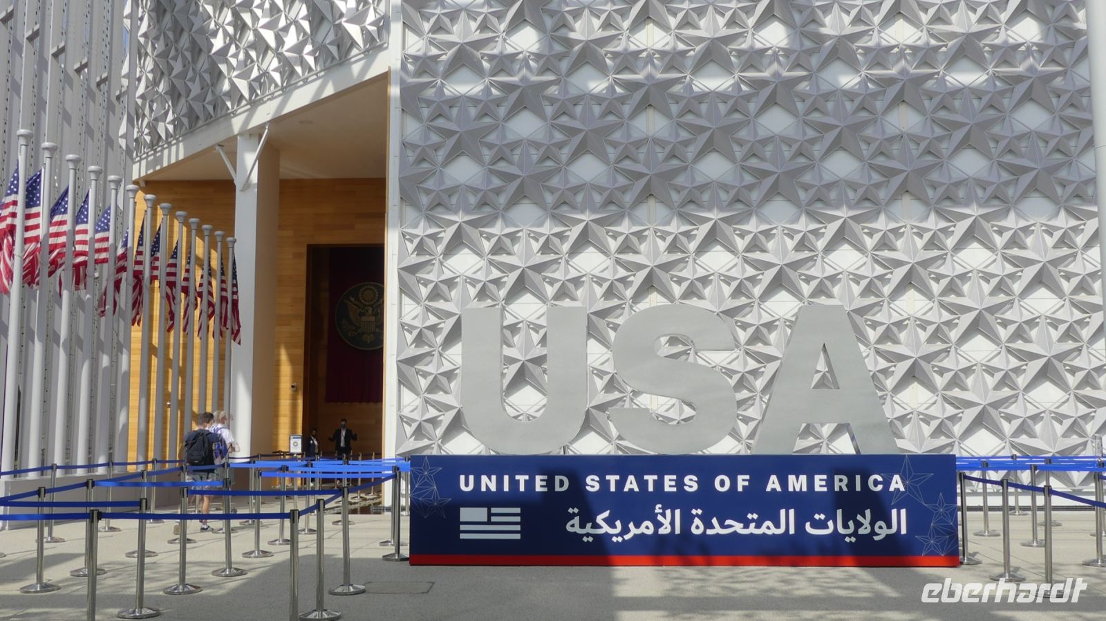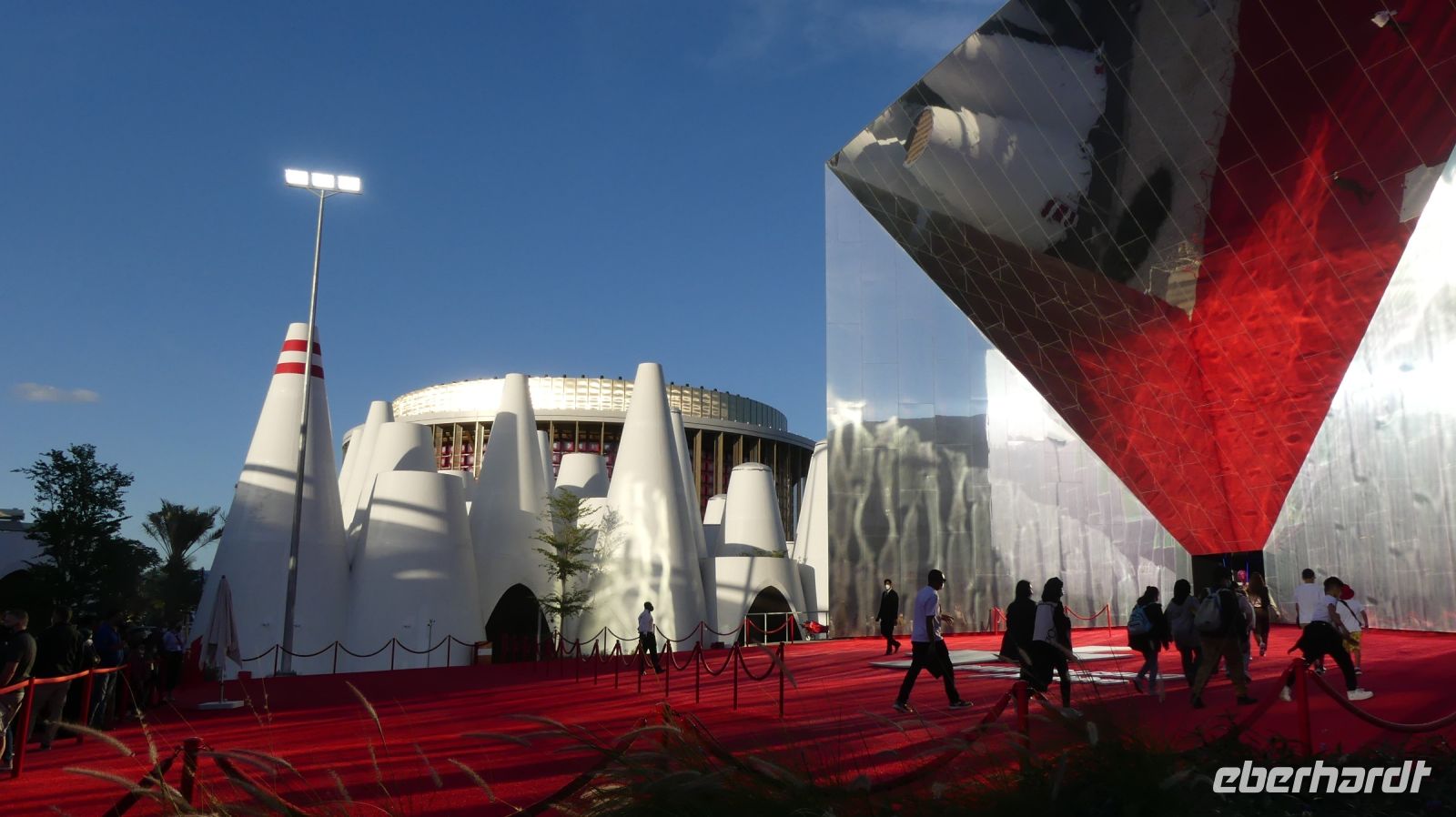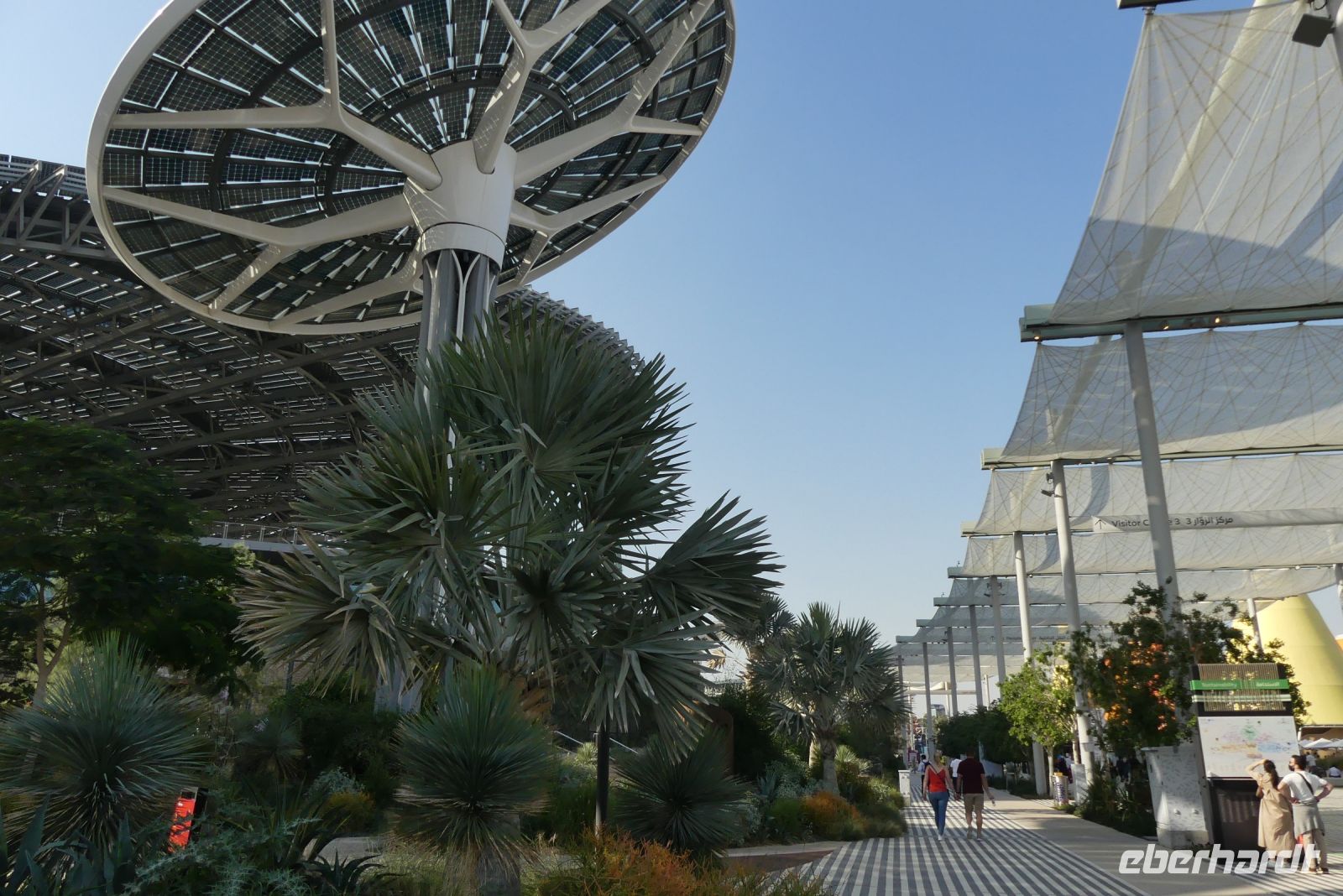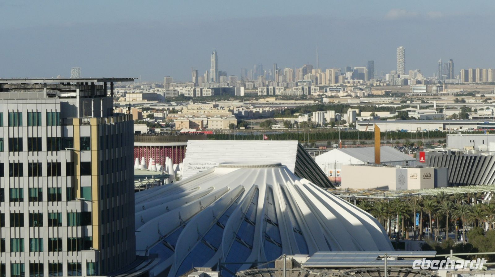 - Pavillon der VAE; das „Land of Dreamers who do“ präsentiert sich in einem architektonisch interessanten Gebäude. Der größte Pavillon der EXPO, wurde vom Gefieder eines sitzenden Falken inspiriert. Im Innern sind rotschimmernde Sanddünen aufgeschüttet, welche als Projektionsflächen dienen.