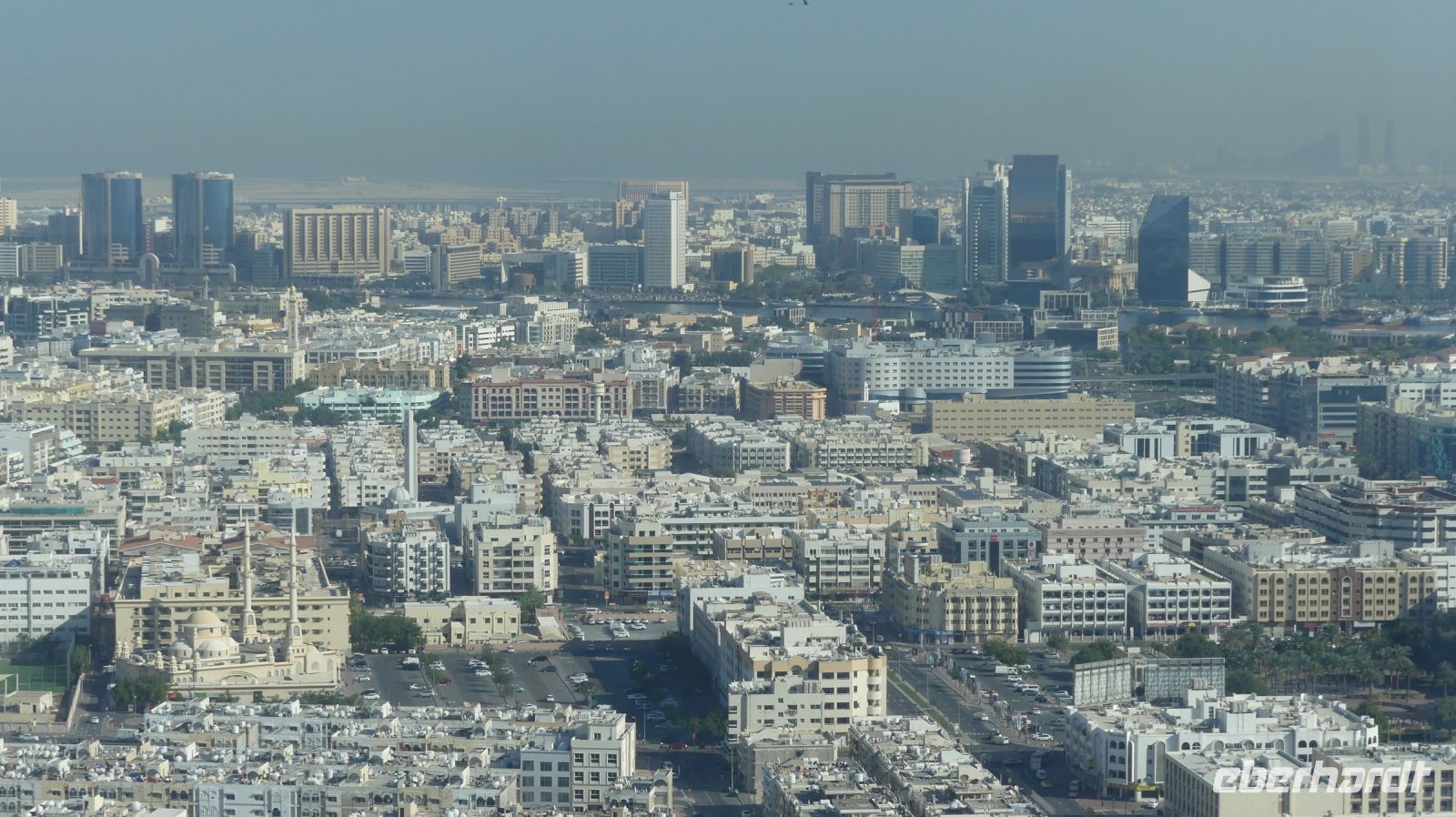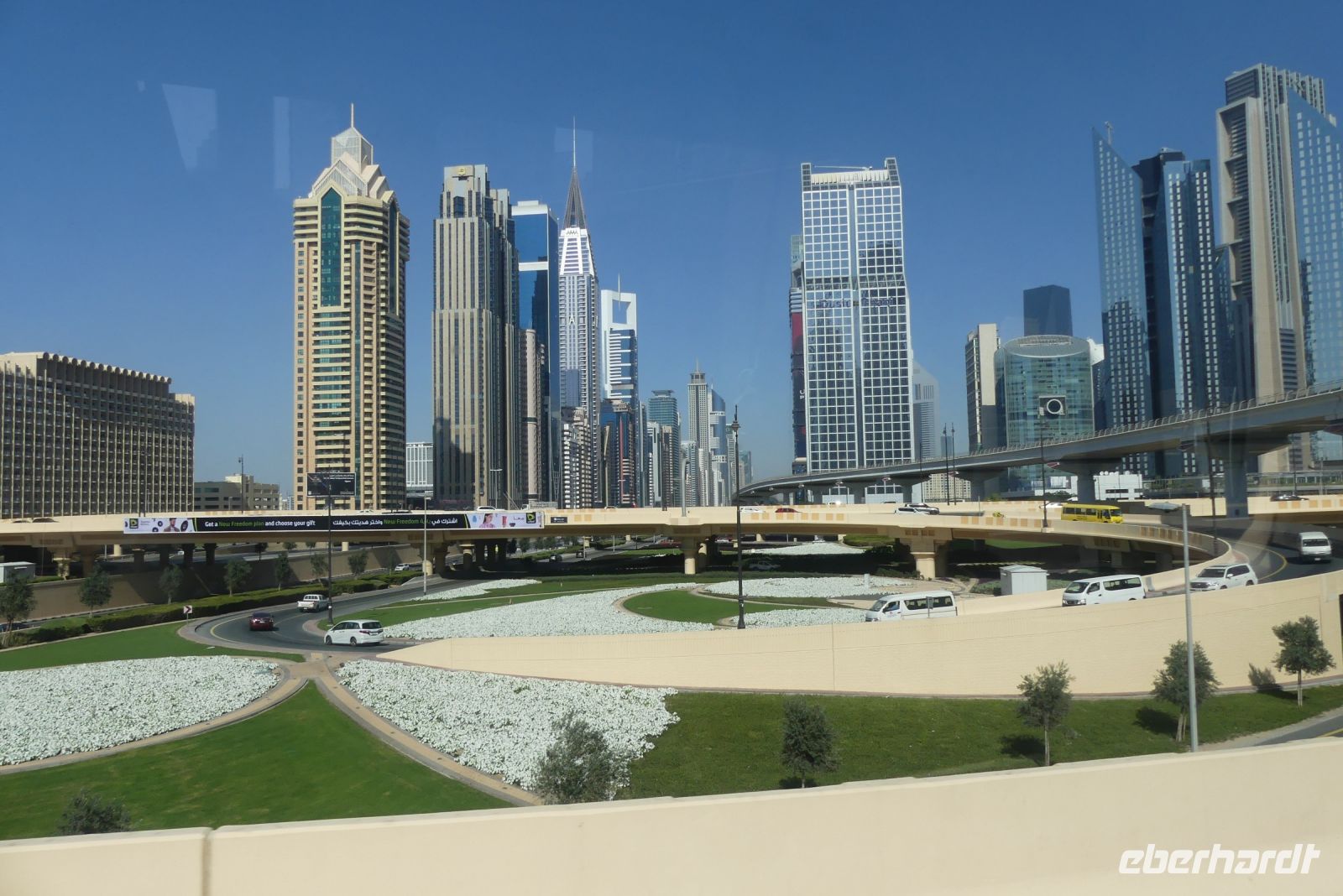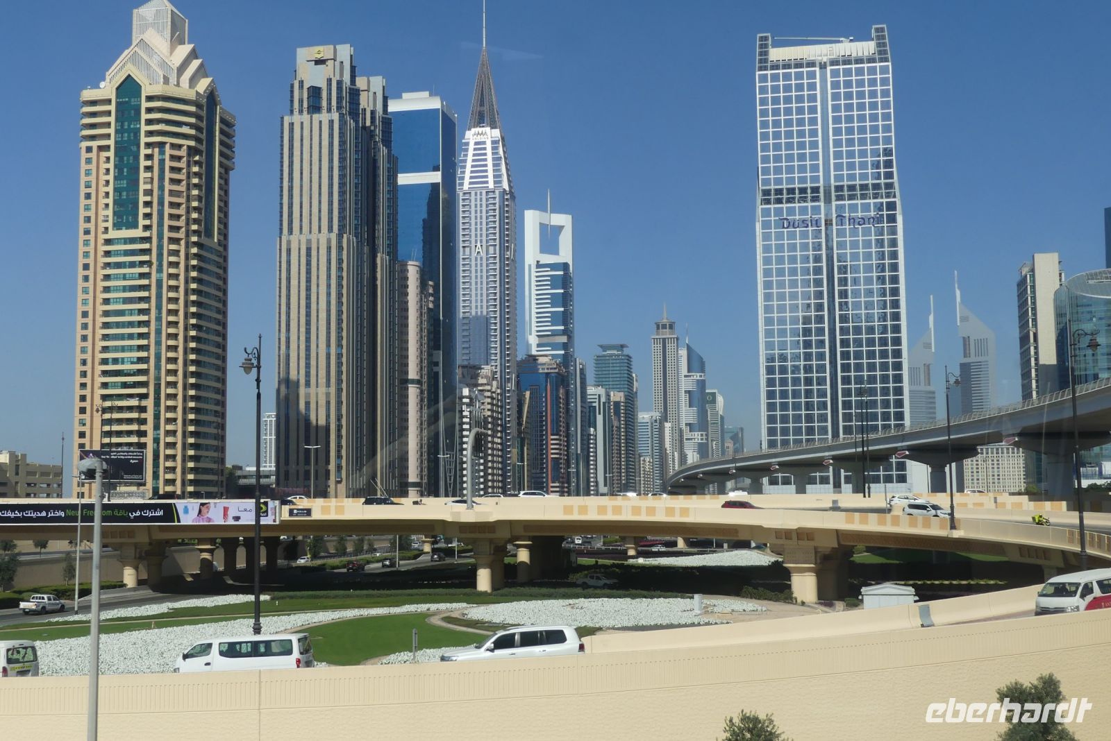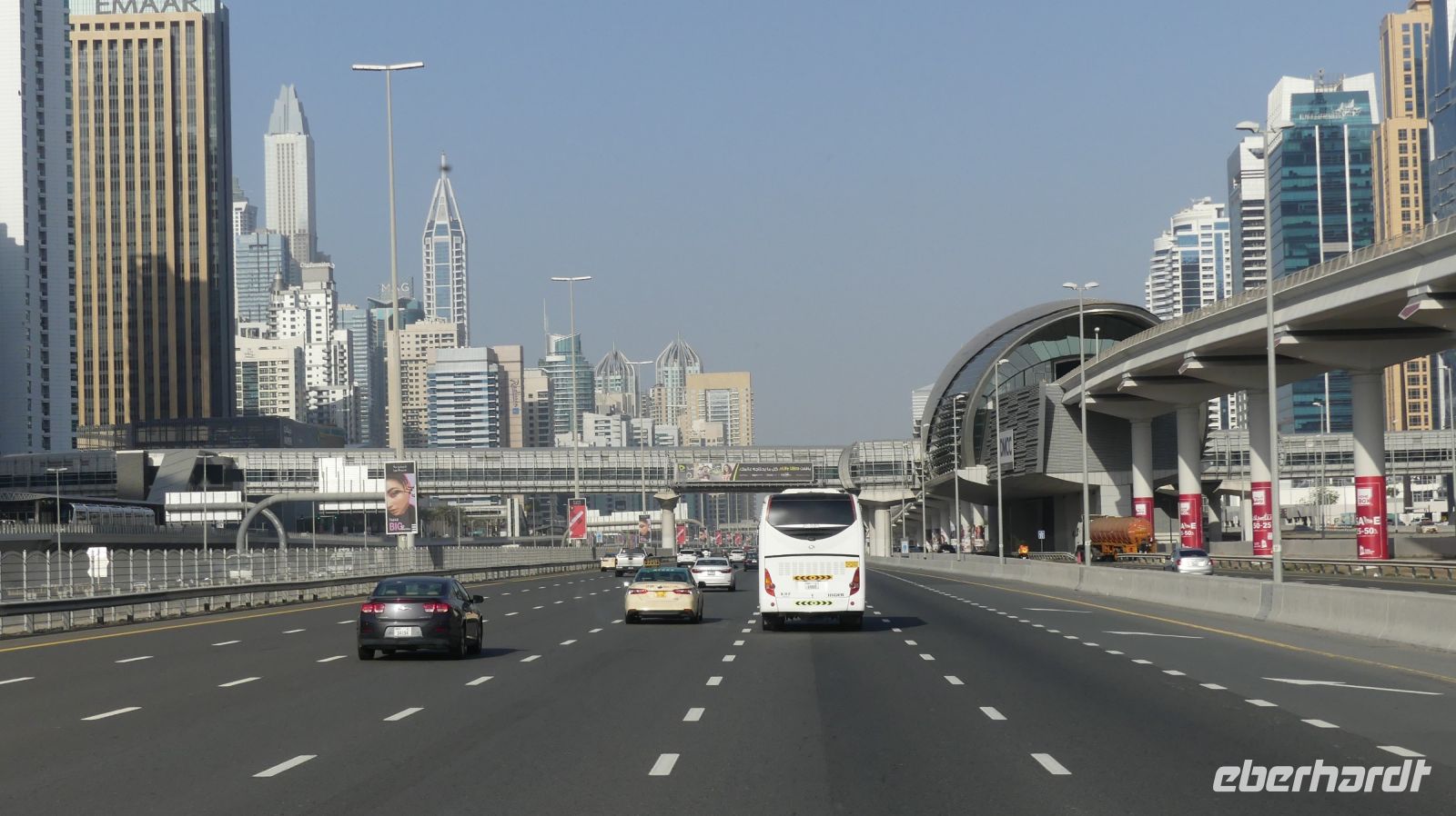 Der Flug nach Dubai dauert etwa 6 Stunden. Auf der halbstündigen Fahrt vom Flughafen zum Hotel überqueren wir dem Meeresarm (Creek) und kommen am Burj Khalifa vorbei. So bekommen wir schon mal einen ersten Eindruck von der Stadt und ihren Ausmaßen.