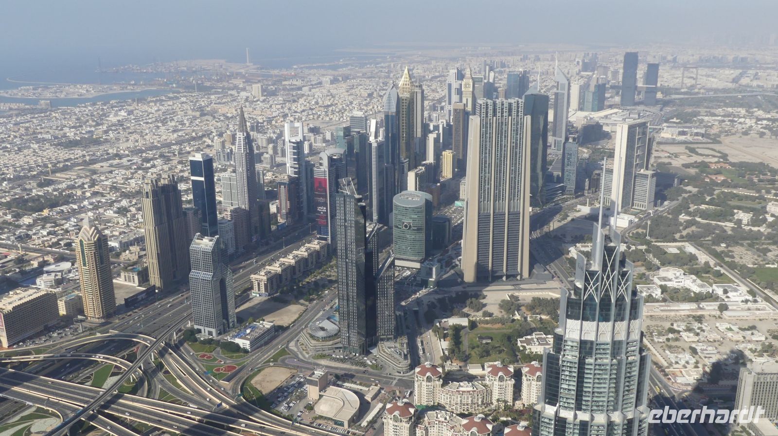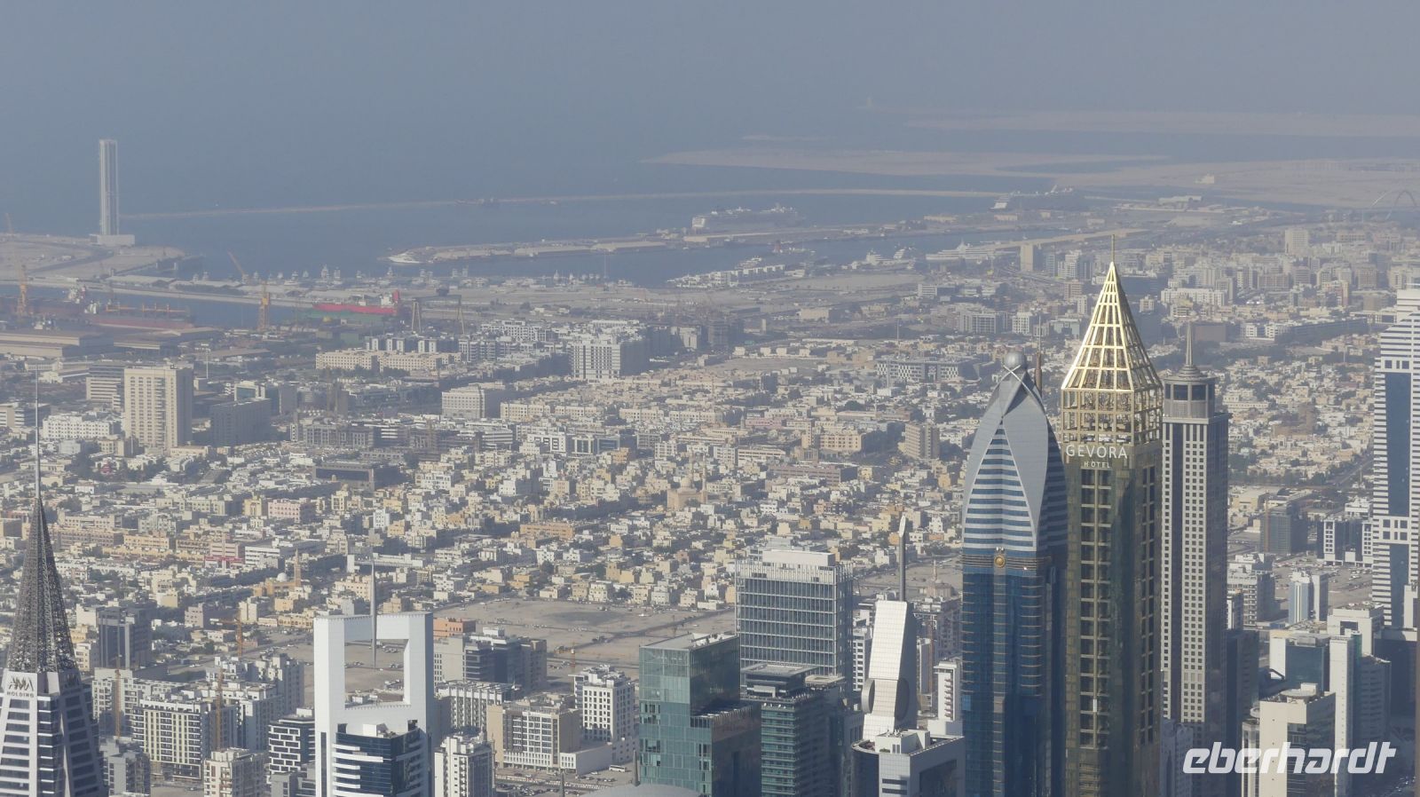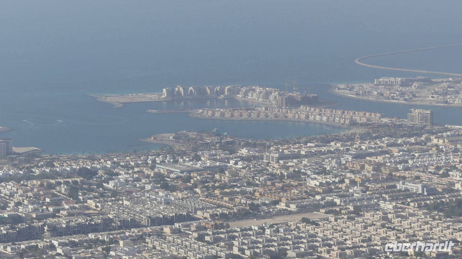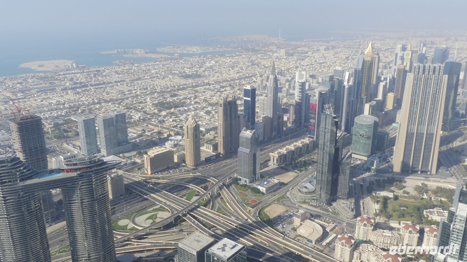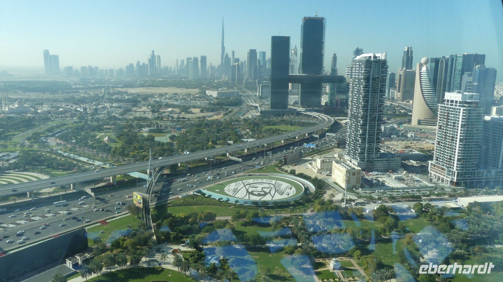 Der Flug nach Dubai dauert etwa 6 Stunden. Auf der halbstündigen Fahrt vom Flughafen zum Hotel überqueren wir dem Meeresarm (Creek) und kommen am Burj Khalifa vorbei. So bekommen wir schon mal einen ersten Eindruck von der Stadt und ihren Ausmaßen.