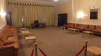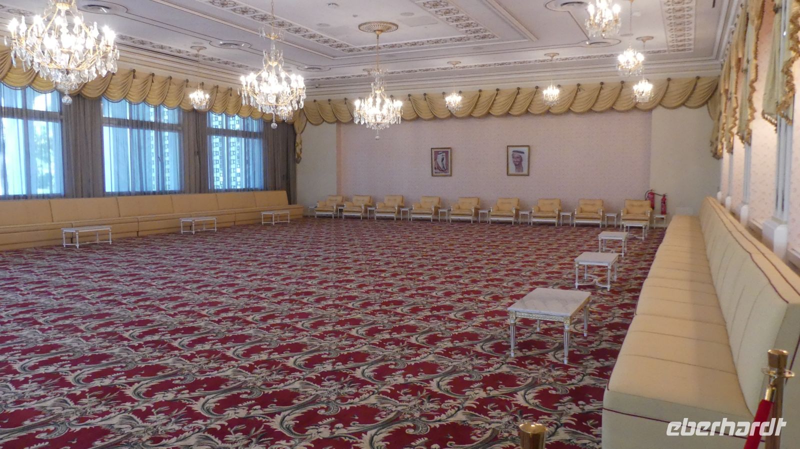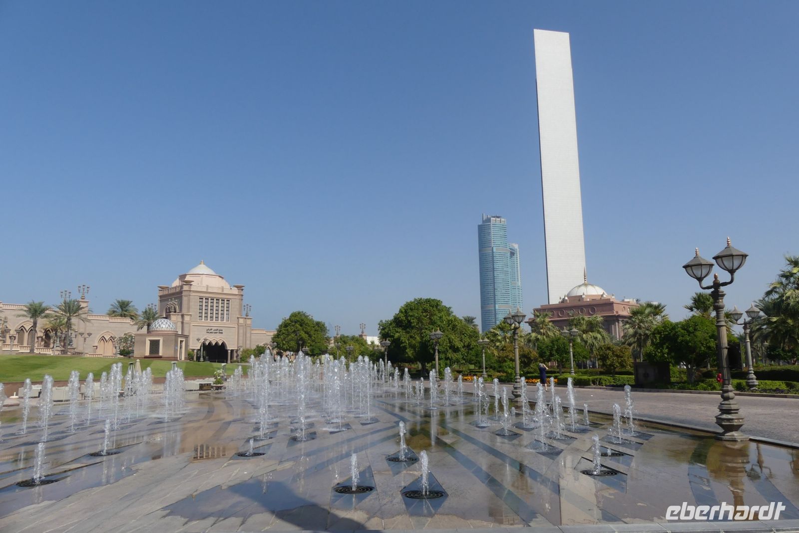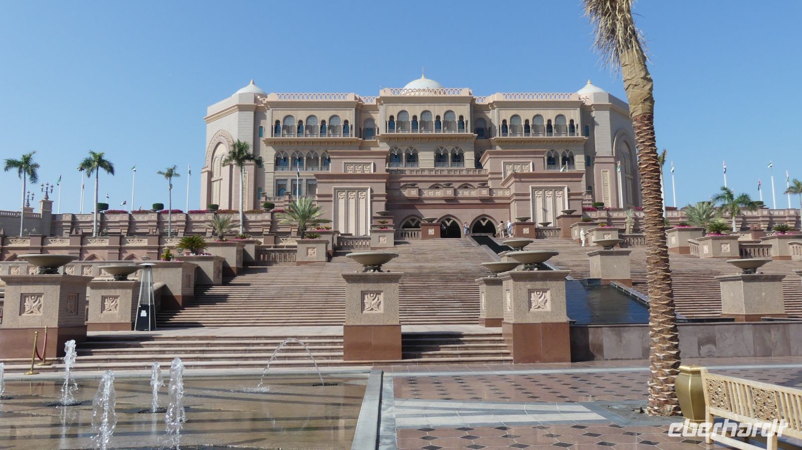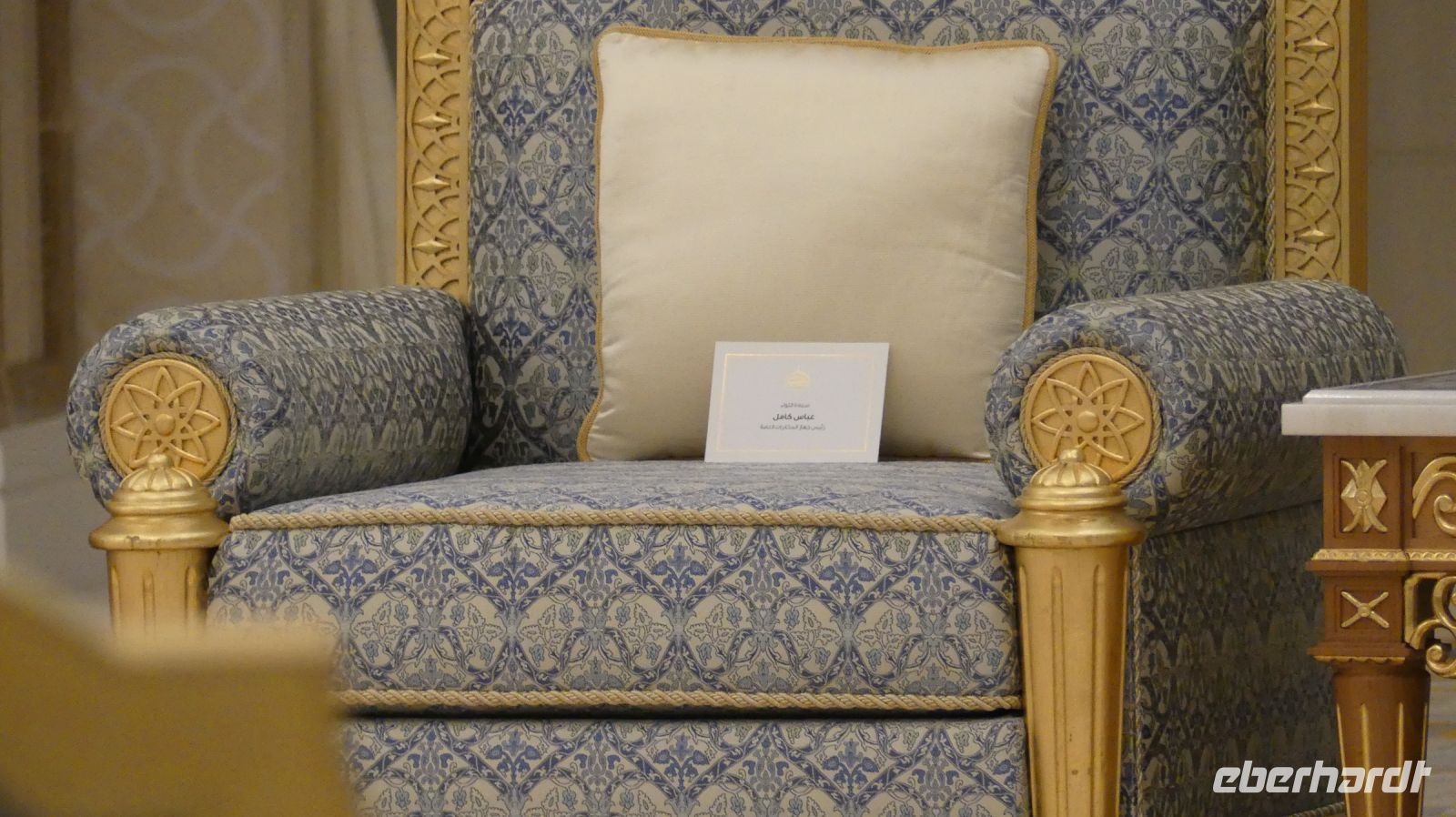 Wir werden zwei Tage in Abu Dhabi verbringen. Unser Hotel befindet sich in der Nähe des Präsidentenpalastes und des Emirates Palace. Nach dem Check In am Nachmittag im Hotel begeben wir uns weiter zum Präsidentenpalast. Wir haben schon wieder Glück: Momentan geben sich hier die Staatsgäste fast nacheinander die Türklinke in die Hand. Gestern, am Mittwoch, war der ägyptische Präsident El Sisi hier*. Am Wochenende wird der nächste Staatsgast erwartet. Die protokollarischen Vorbereitungen laufen bereits, der gute Teppich ist noch mit Folie abgeklebt, die Fahnen der VAE sind aufgestellt und im Sitzungssaal sind die (aus der Ferne leide nicht lesbaren) Namensschilder auf den Stühlen platziert. Die Flaggen des anderen Staates werden noch unter Verschluss gehalten. Wer am Wochenende Gast sein wird, ist noch geheim.