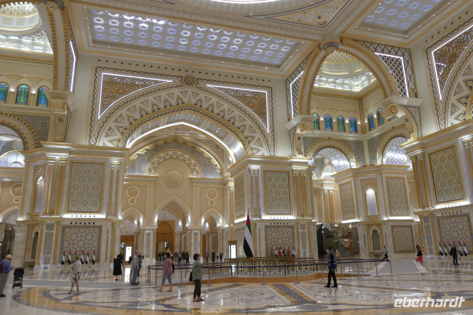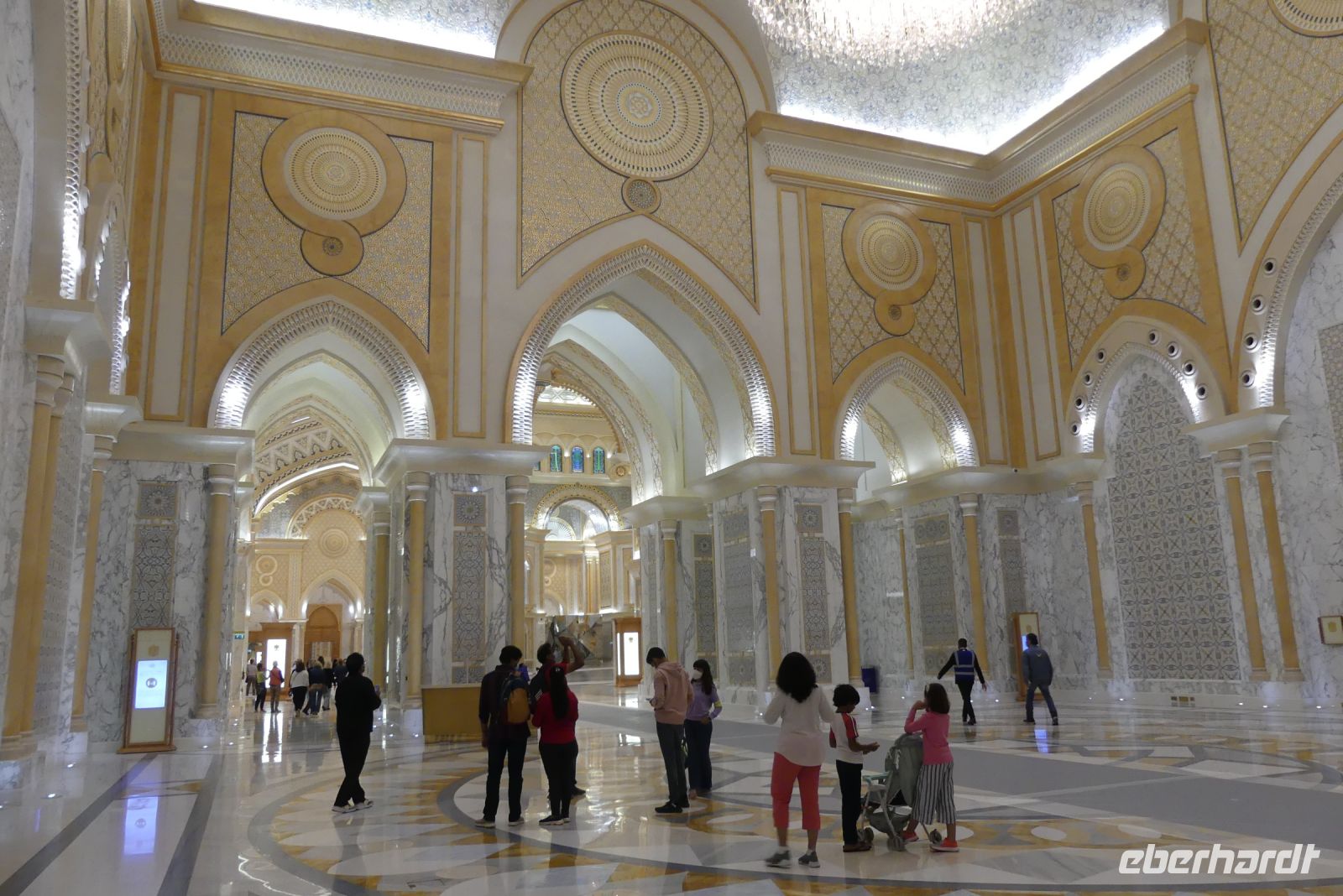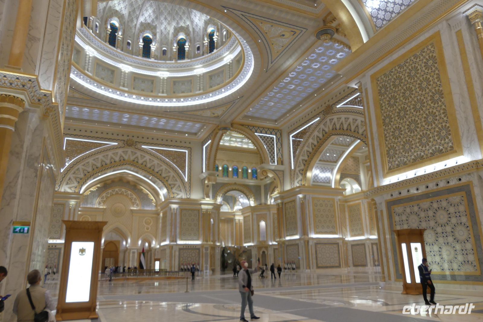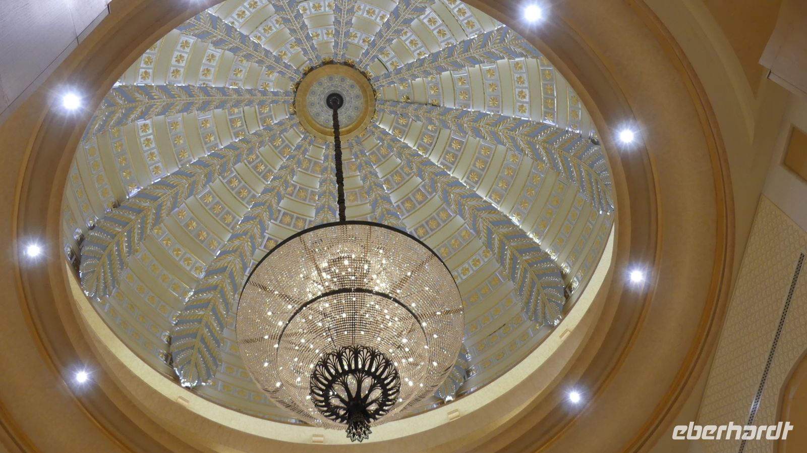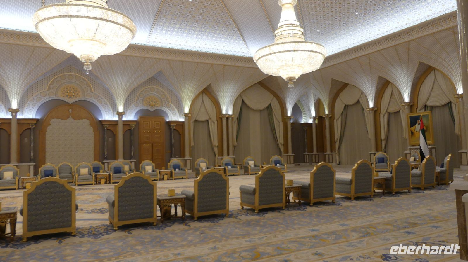 Wir haben offensichtlich in diesen Tagen dieses kleine Zeitfenster erwischt, in dem der Palast zwischen den Staatsbesuchen für normal Sterbliche seine Tore öffnet. So marschieren wir also als Touristen einfach mal so in den Präsidentenpalast der VAE! Worte zu finden, für die Architektur und den Prunk fällt mir schwer. Wir bewegen uns in Räumlichkeiten, die sonst nur Staatsgästen zugänglich sind. Wir sehen den riesigen Empfangssaal, die Sitzungsräume der hiesigen Herrscher (Majlis Bani Yas), die Bibliothek, eine begehbare Kalligraphie und den Bankettsaal. Drei Tage später werde ich zu Hause im Wohnzimmer vor dem Fernseher sitzen und in der Tagesschau erfahren, welcher Staatsgast am Wochenende nach Abu Dhabi gekommen ist.