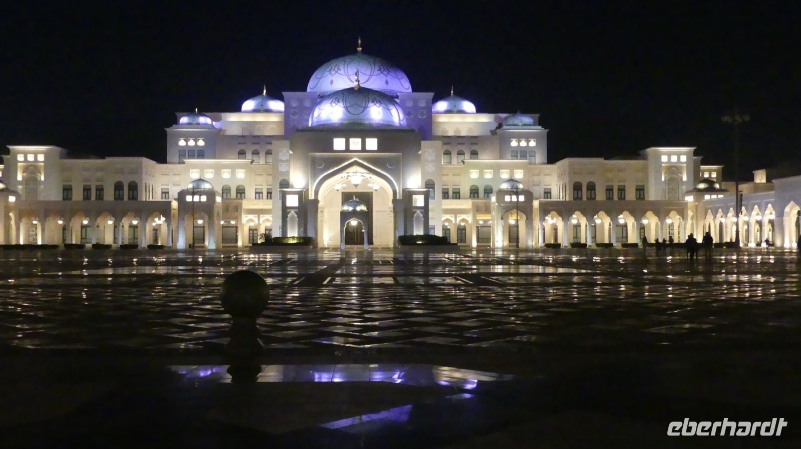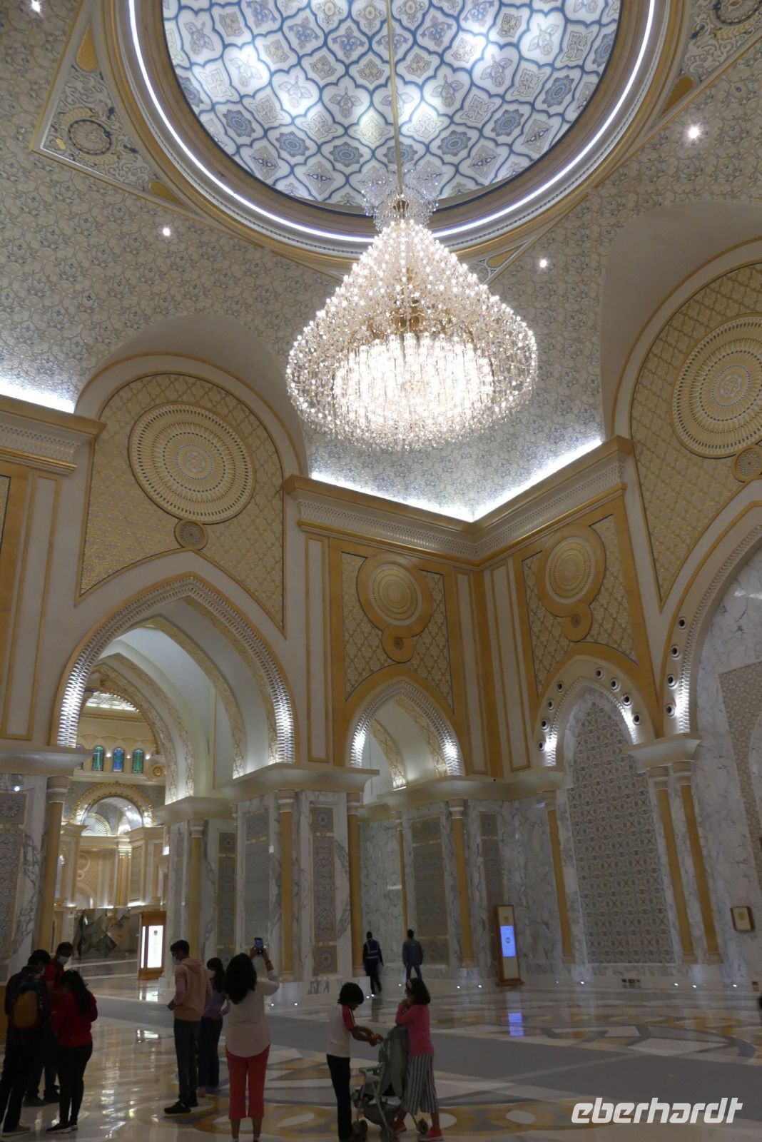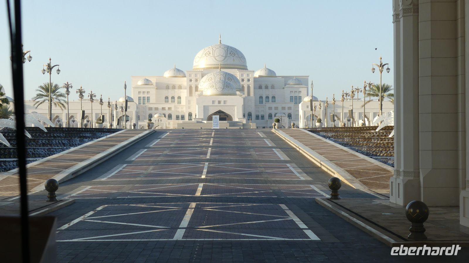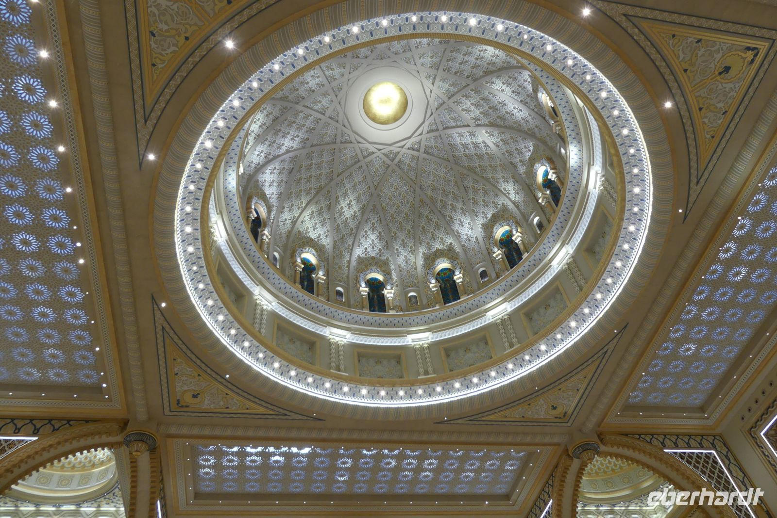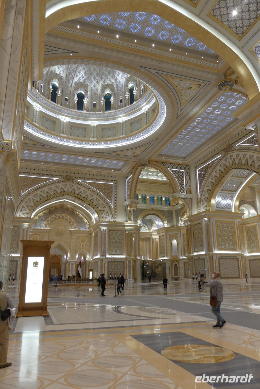 Wir haben offensichtlich in diesen Tagen dieses kleine Zeitfenster erwischt, in dem der Palast zwischen den Staatsbesuchen für normal Sterbliche seine Tore öffnet. So marschieren wir also als Touristen einfach mal so in den Präsidentenpalast der VAE! Worte zu finden, für die Architektur und den Prunk fällt mir schwer. Wir bewegen uns in Räumlichkeiten, die sonst nur Staatsgästen zugänglich sind. Wir sehen den riesigen Empfangssaal, die Sitzungsräume der hiesigen Herrscher (Majlis Bani Yas), die Bibliothek, eine begehbare Kalligraphie und den Bankettsaal. Drei Tage später werde ich zu Hause im Wohnzimmer vor dem Fernseher sitzen und in der Tagesschau erfahren, welcher Staatsgast am Wochenende nach Abu Dhabi gekommen ist.