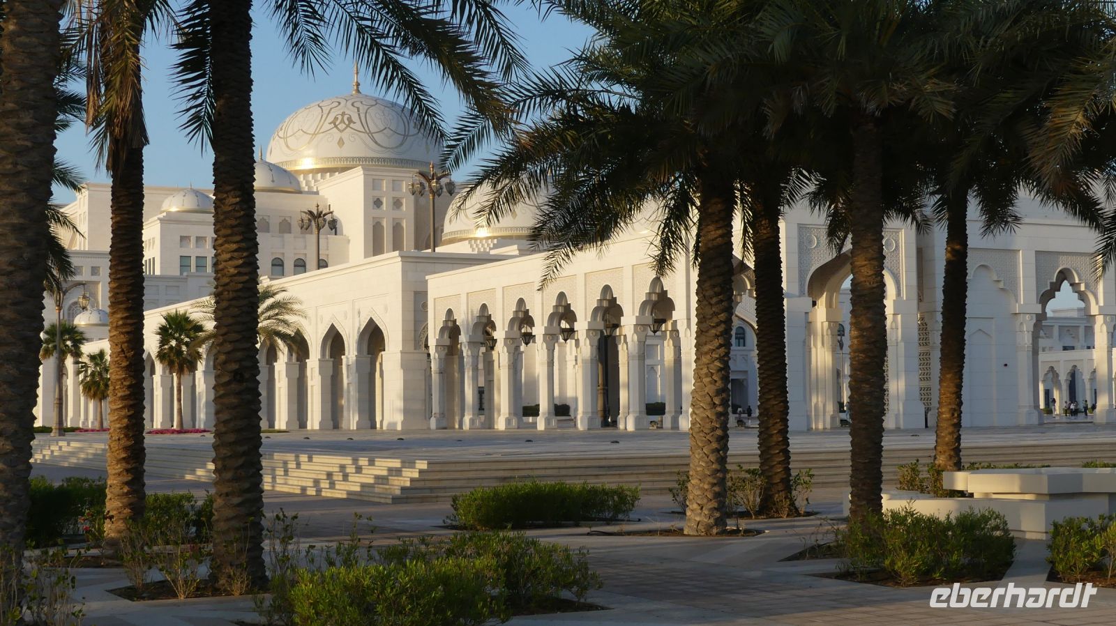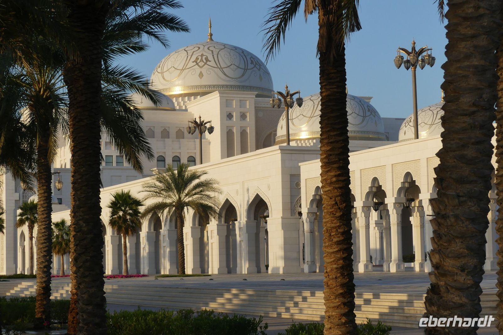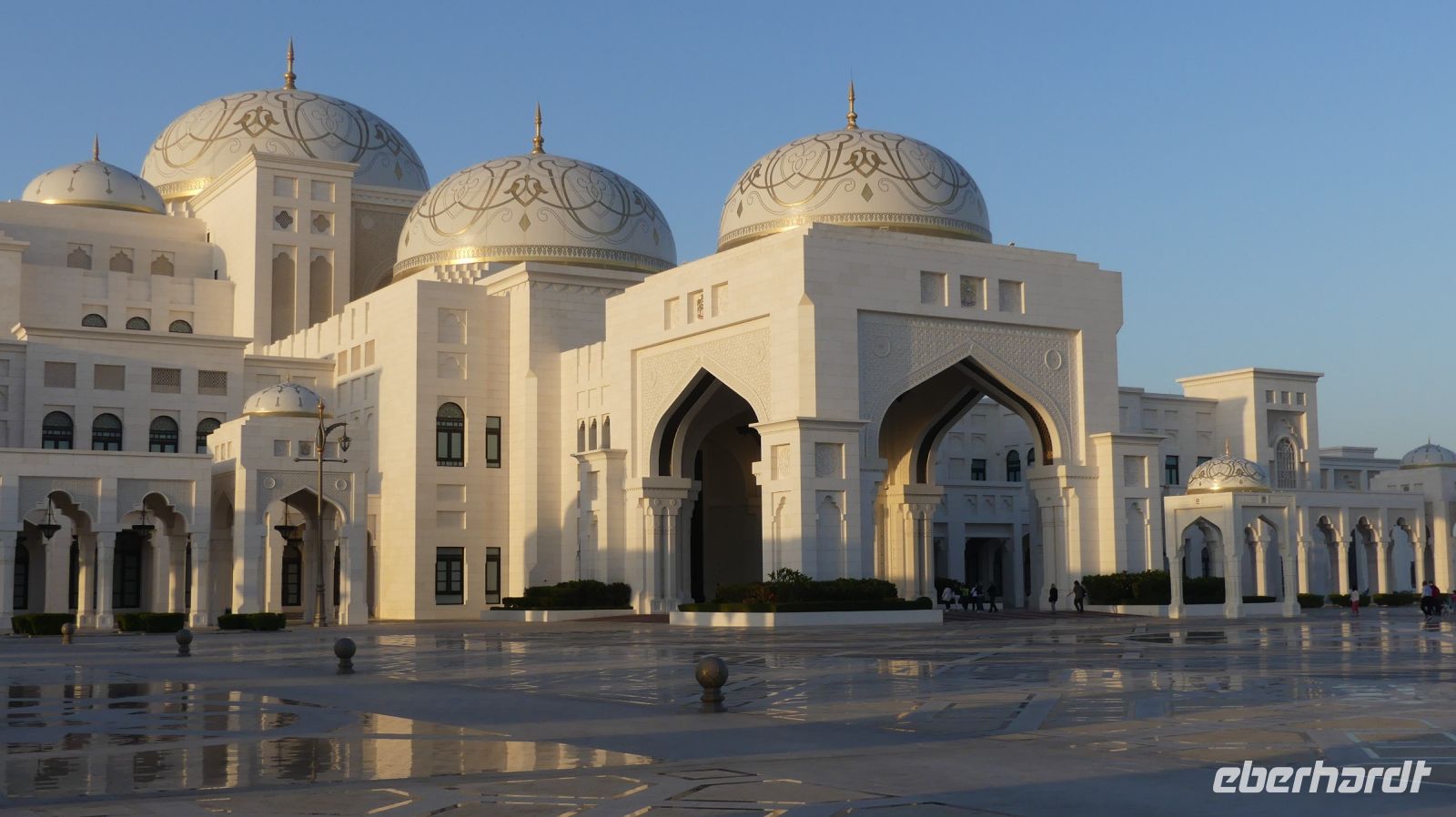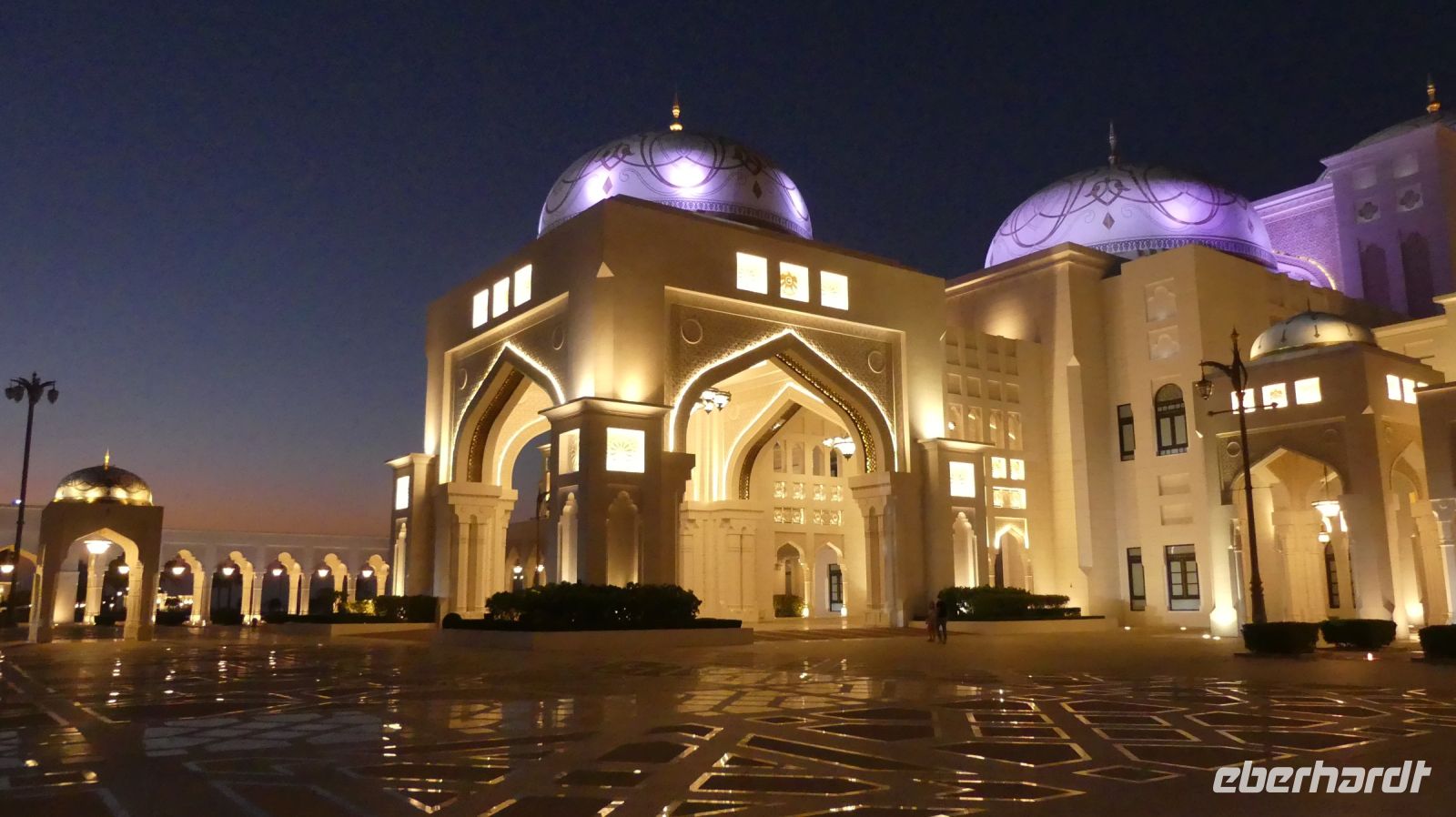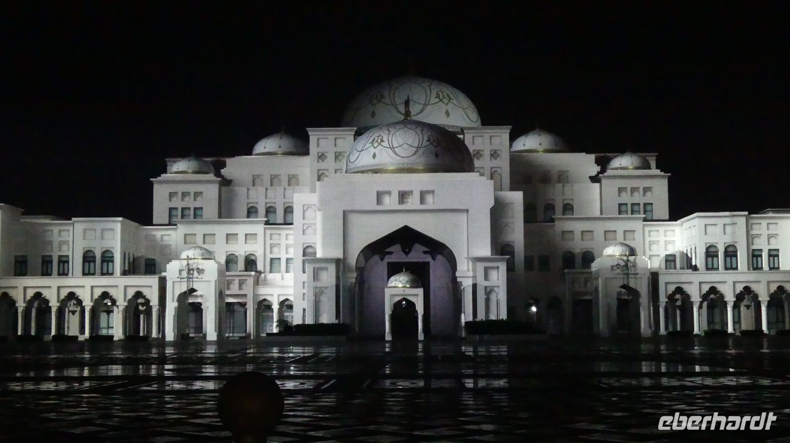Wir haben offensichtlich in diesen Tagen dieses kleine Zeitfenster erwischt, in dem der Palast zwischen den Staatsbesuchen für normal Sterbliche seine Tore öffnet. So marschieren wir also als Touristen einfach mal so in den Präsidentenpalast der VAE! Worte zu finden, für die Architektur und den Prunk fällt mir schwer. Wir bewegen uns in Räumlichkeiten, die sonst nur Staatsgästen zugänglich sind. Wir sehen den riesigen Empfangssaal, die Sitzungsräume der hiesigen Herrscher (Majlis Bani Yas), die Bibliothek, eine begehbare Kalligraphie und den Bankettsaal. Drei Tage später werde ich zu Hause im Wohnzimmer vor dem Fernseher sitzen und in der Tagesschau erfahren, welcher Staatsgast am Wochenende nach Abu Dhabi gekommen ist.