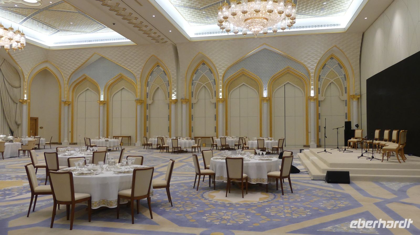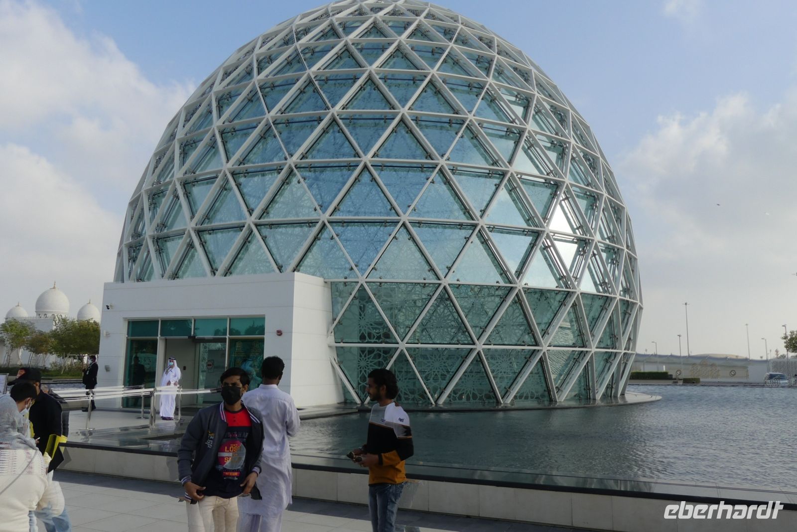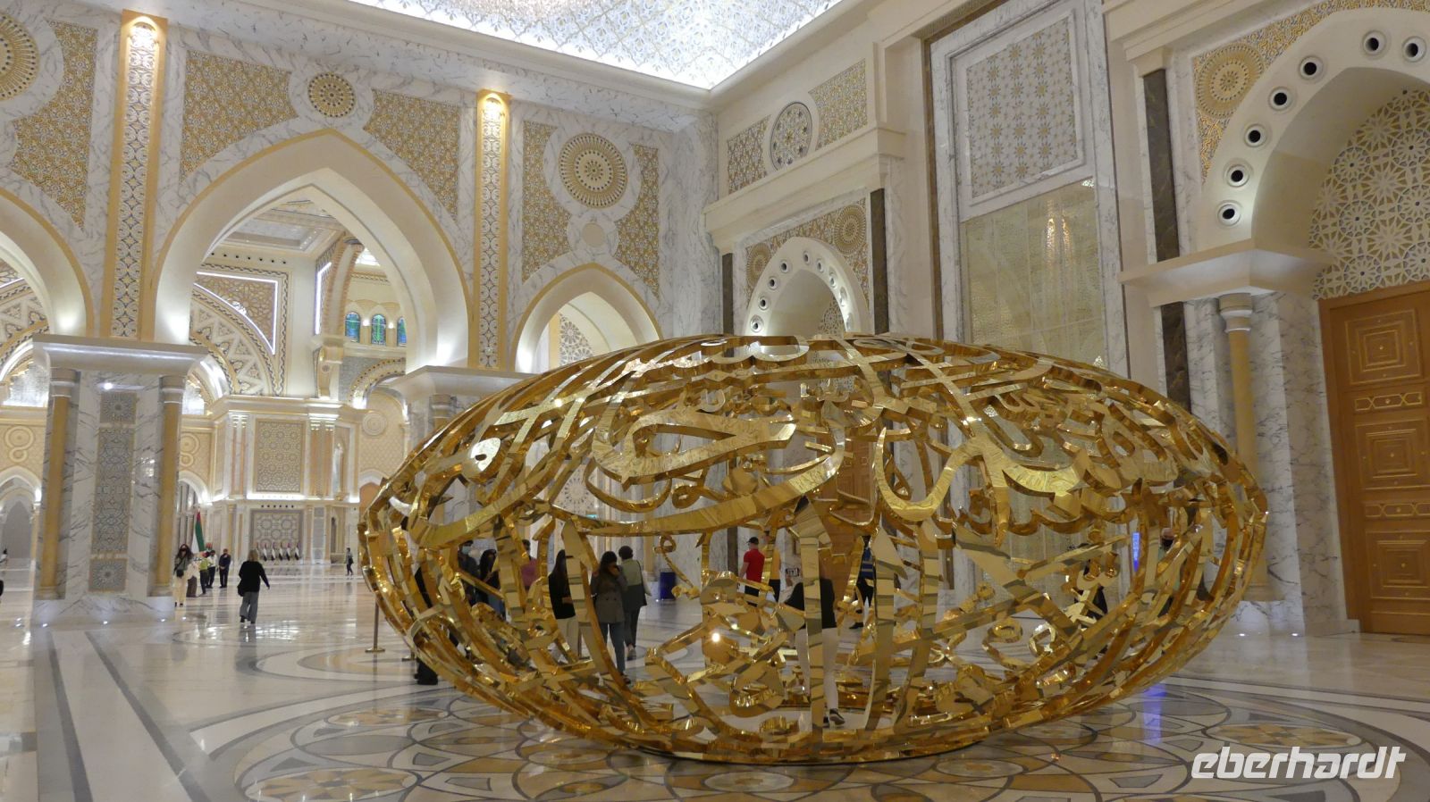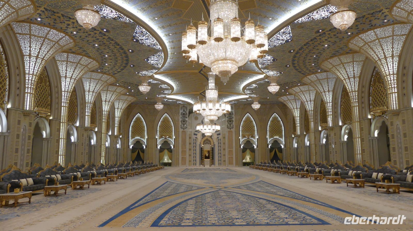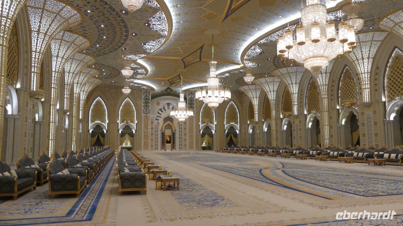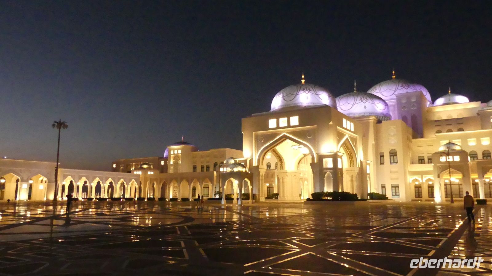 Wir haben offensichtlich in diesen Tagen dieses kleine Zeitfenster erwischt, in dem der Palast zwischen den Staatsbesuchen für normal Sterbliche seine Tore öffnet. So marschieren wir also als Touristen einfach mal so in den Präsidentenpalast der VAE! Worte zu finden, für die Architektur und den Prunk fällt mir schwer. Wir bewegen uns in Räumlichkeiten, die sonst nur Staatsgästen zugänglich sind. Wir sehen den riesigen Empfangssaal, die Sitzungsräume der hiesigen Herrscher (Majlis Bani Yas), die Bibliothek, eine begehbare Kalligraphie und den Bankettsaal. Drei Tage später werde ich zu Hause im Wohnzimmer vor dem Fernseher sitzen und in der Tagesschau erfahren, welcher Staatsgast am Wochenende nach Abu Dhabi gekommen ist.